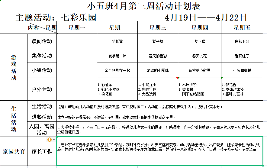 小五班4月第三周活动计划表