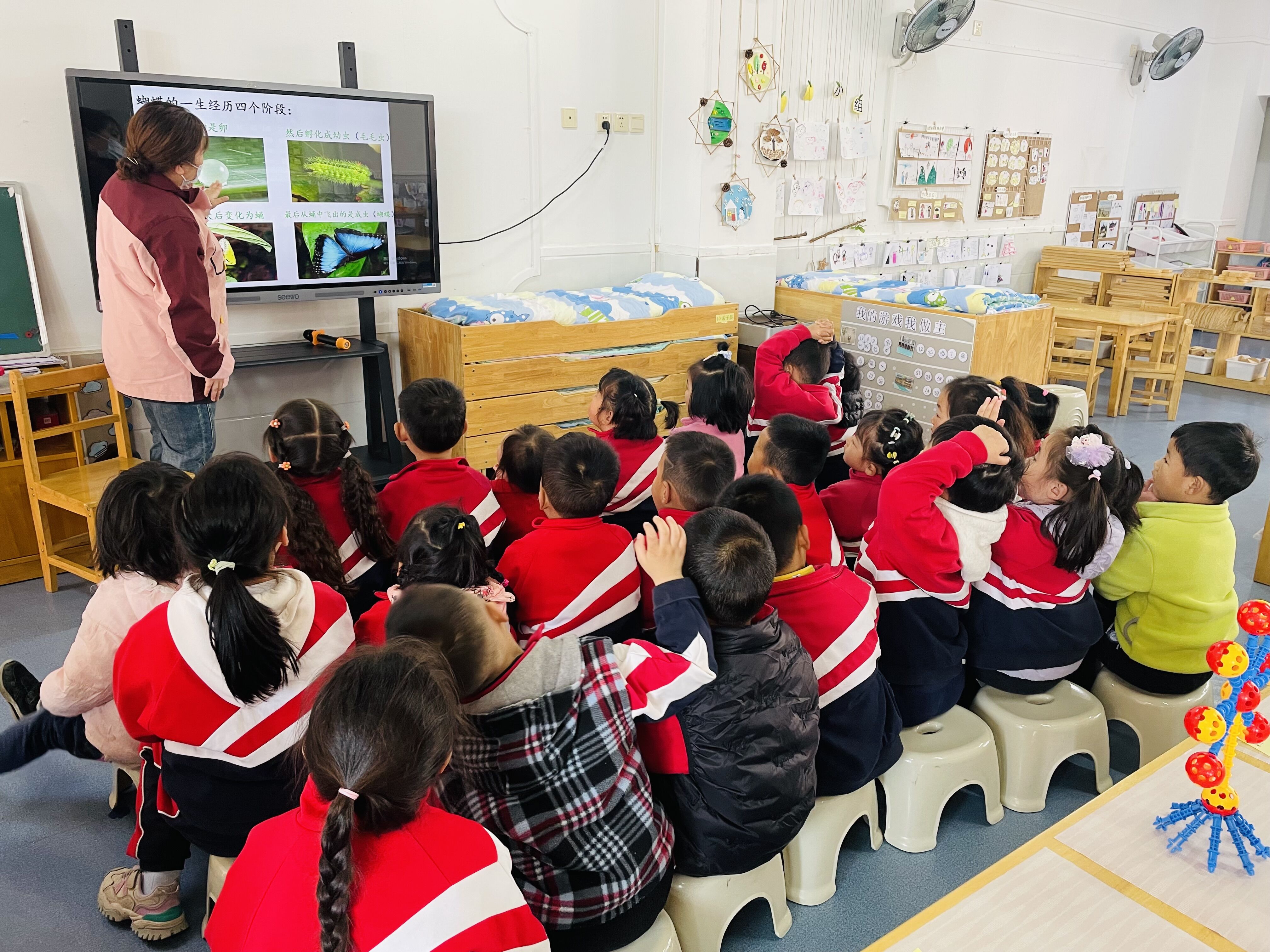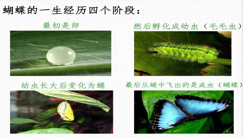 通过交流、讨论,小朋友都知道了原来蝴蝶是由毛毛虫生长变化而来,首先是一颗颗卵,接着孵化出了毛毛虫,毛毛虫慢慢长大,然后把自己裹进蛹里面,经过一段时间的等待,最后破蛹,变成蝴蝶,真神奇!