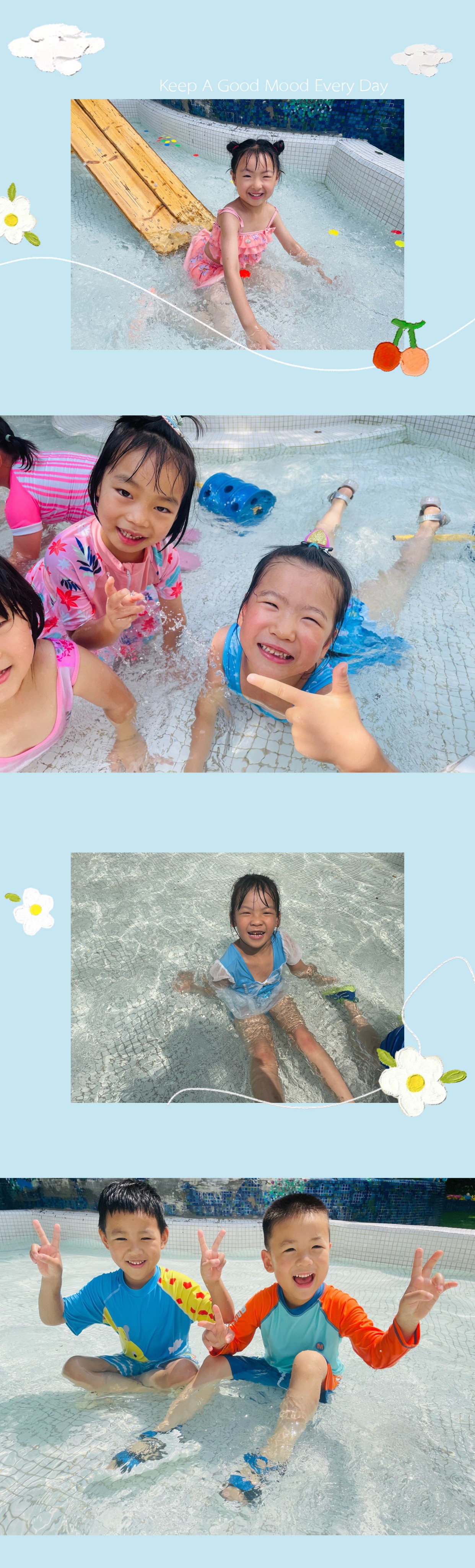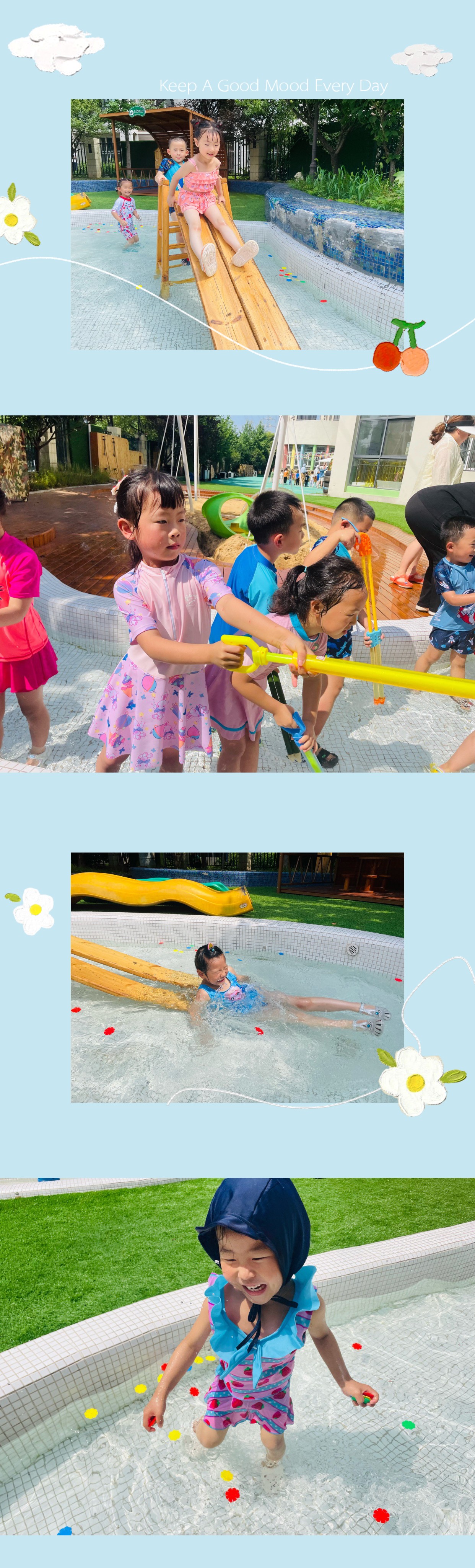 瞧,中班的小可爱门,穿着各色泳衣,在水池中快乐的游玩,他们三五成群互相嬉戏,水池里水花四溅,欢乐的笑声洋溢在每个孩子的脸上。