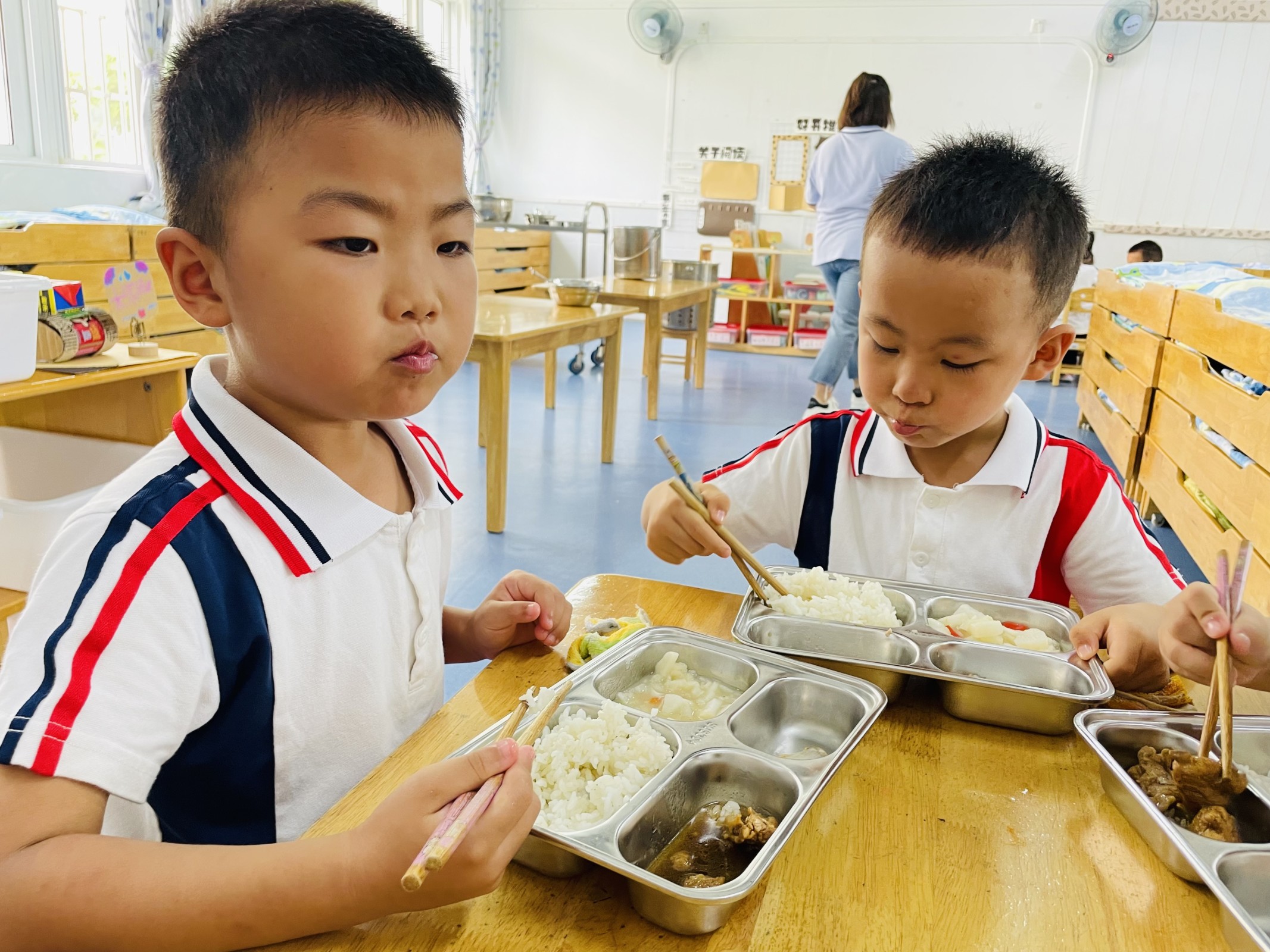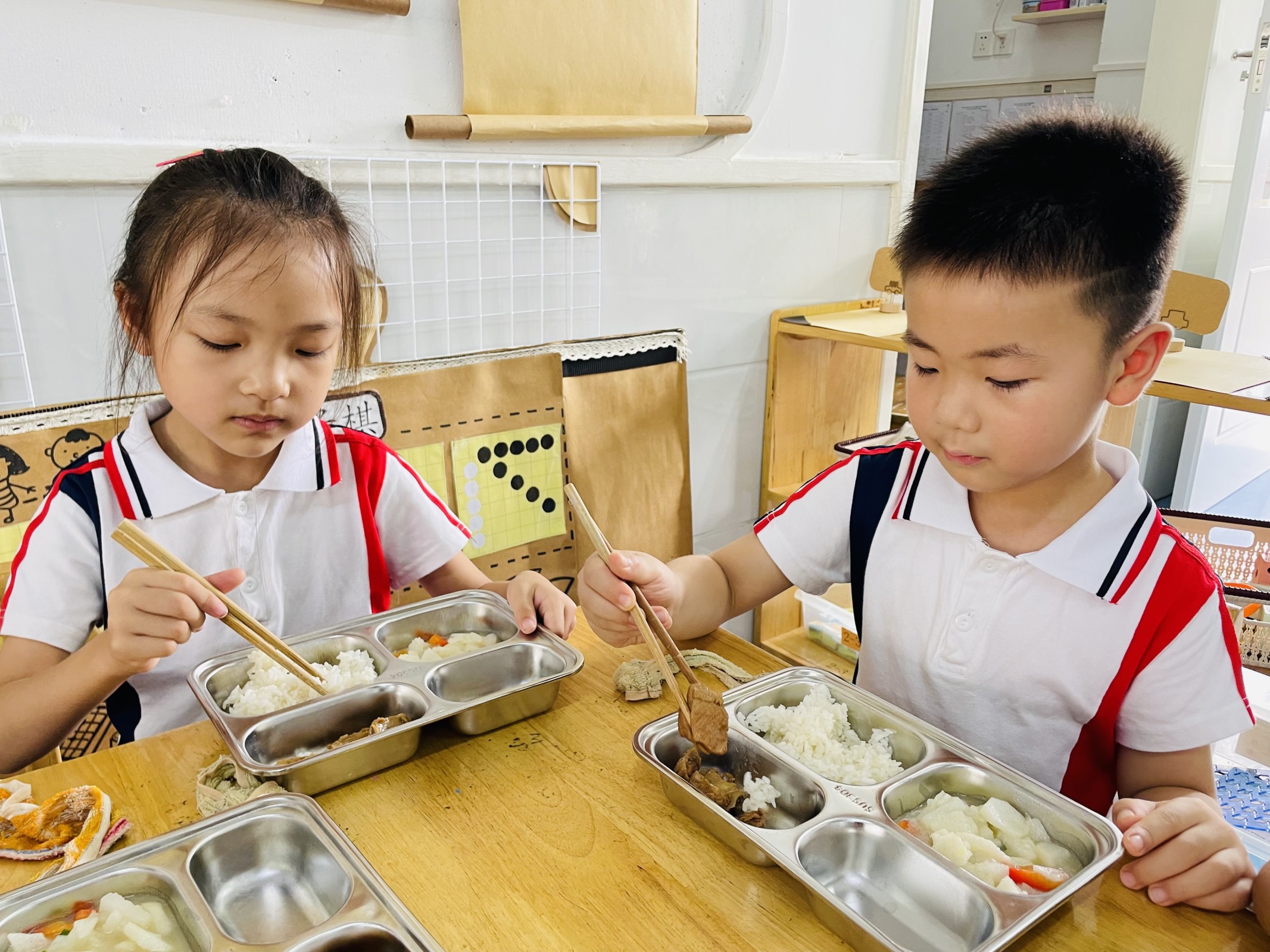 游戏后我们就开始午餐啦!这学期小朋友要用筷子吃饭咯!熟悉的饭菜味,小朋友们吃得真香啊!