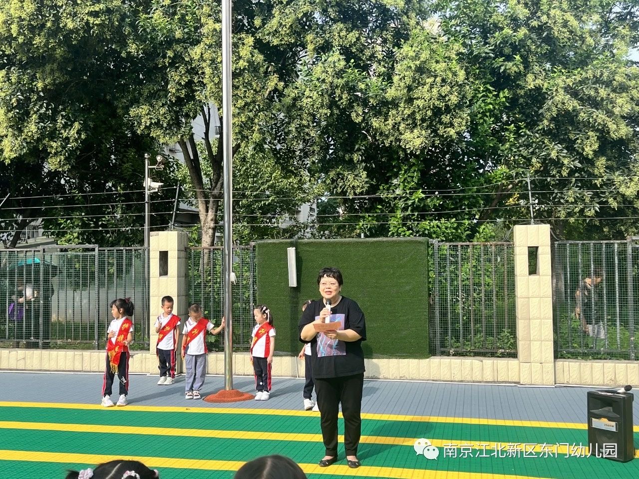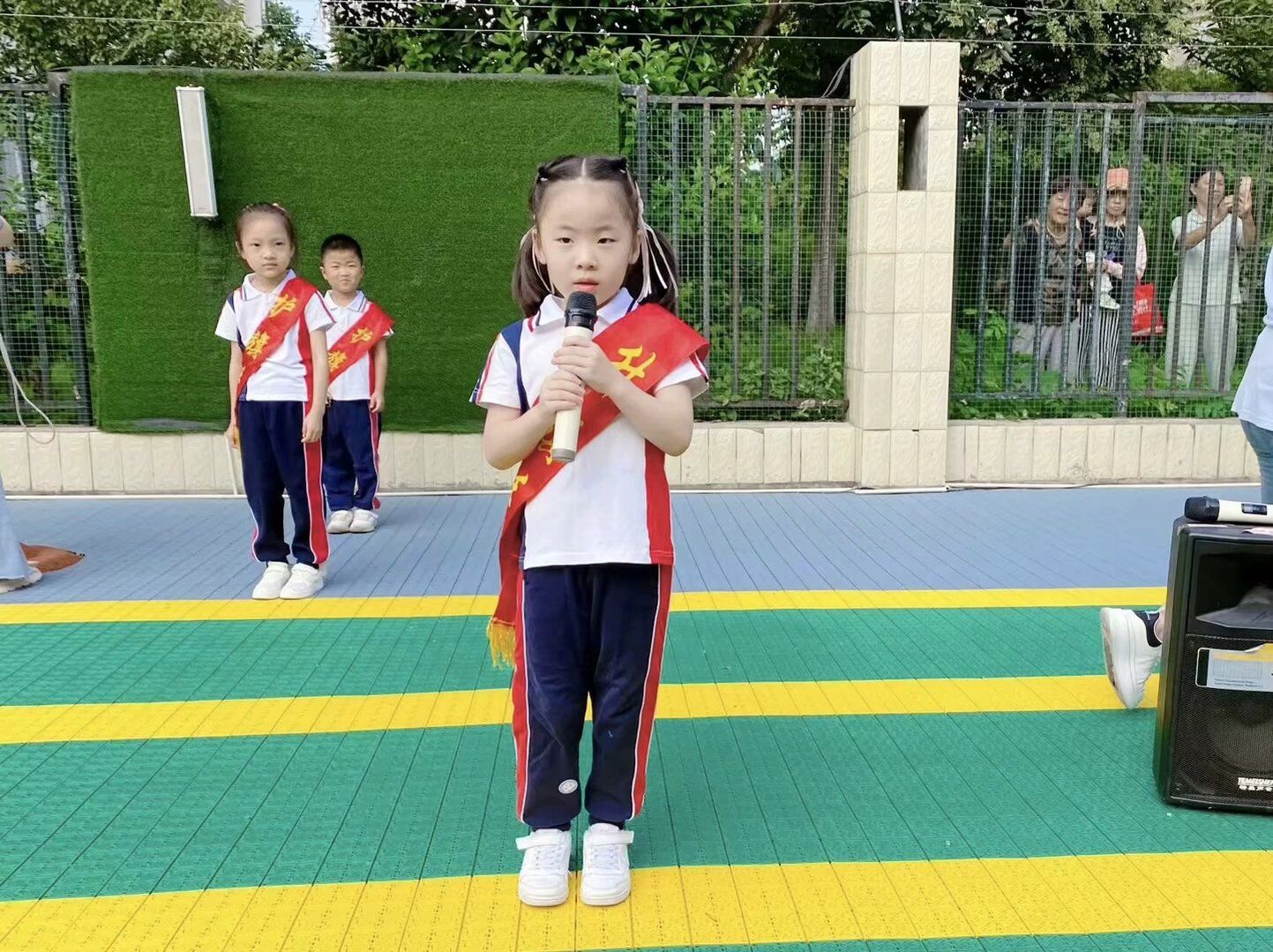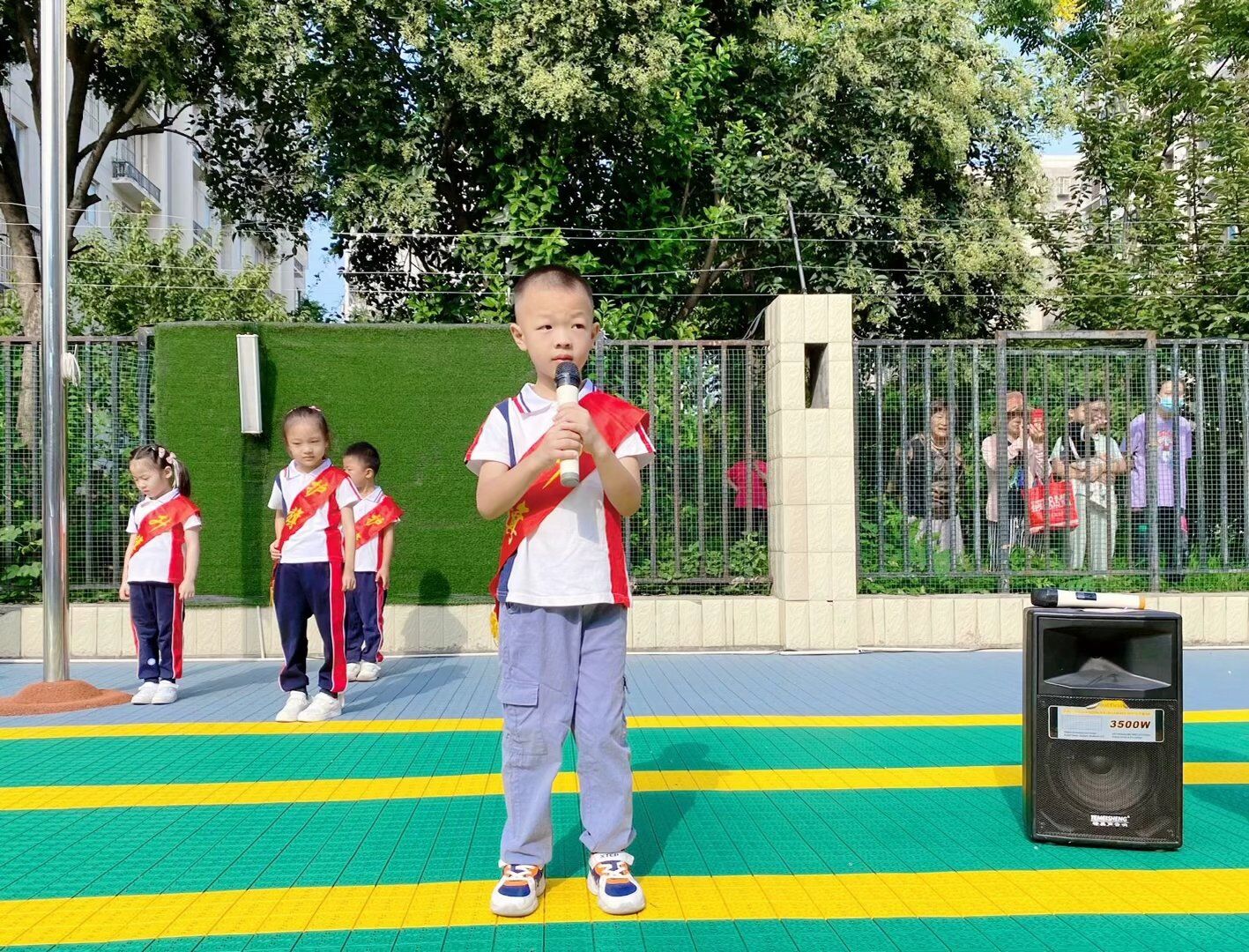 开学典礼在周一升旗仪式中拉开序幕。第一次的升旗任务由大一班小朋友担任,瞧!孩子们排着整齐的队伍,迈着有力的步伐走向升旗台,鲜艳的五星红旗在国歌声中冉冉升起,全体师幼立正站好,精神抖擞。