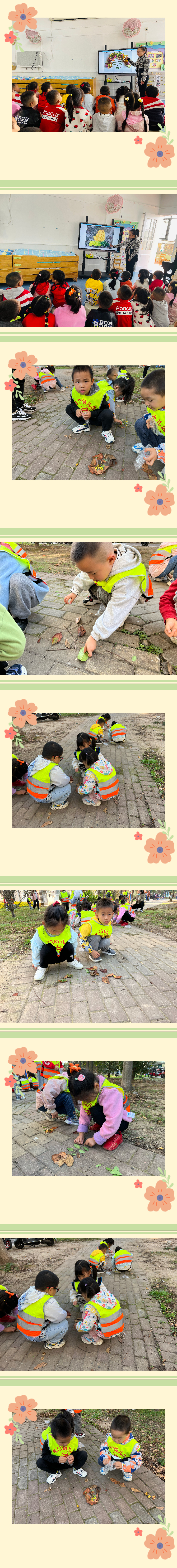 在《美丽的秋天》这个主题中,孩子们前期通过感受欣赏秋天的风景,孩子们对于秋天的季节特征有了一定的认知。 为了充分利用周边的资源,孩子们一起哼着《郊游》的音乐:走走走走走,我们小手拉大手,开开心心地出发了。孩子们一起欣赏小区里美丽的植物,鸡冠花……接着,孩子们一起来到了空地上进行捡落叶活动,小朋友们几个一组小组分工共同利用大自然中的落叶等自然材料进行拼贴装饰,组合成不同的图案……