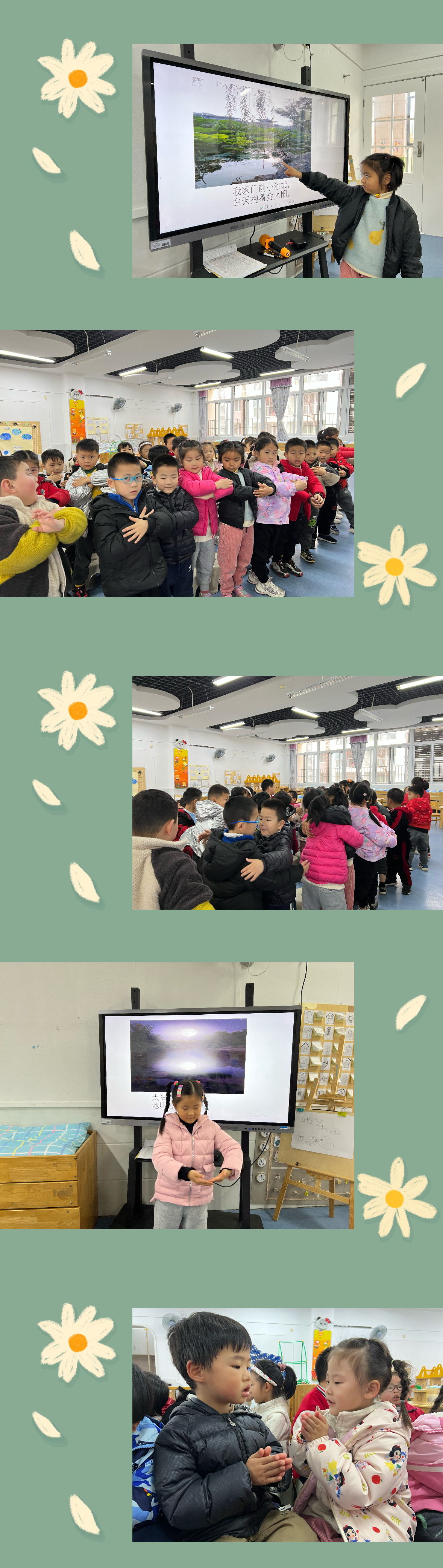 孩子们一起欣赏优美的诗歌,并用自己喜欢的方式来做动作表现诗歌内容。好朋友、小组间一起讨论。