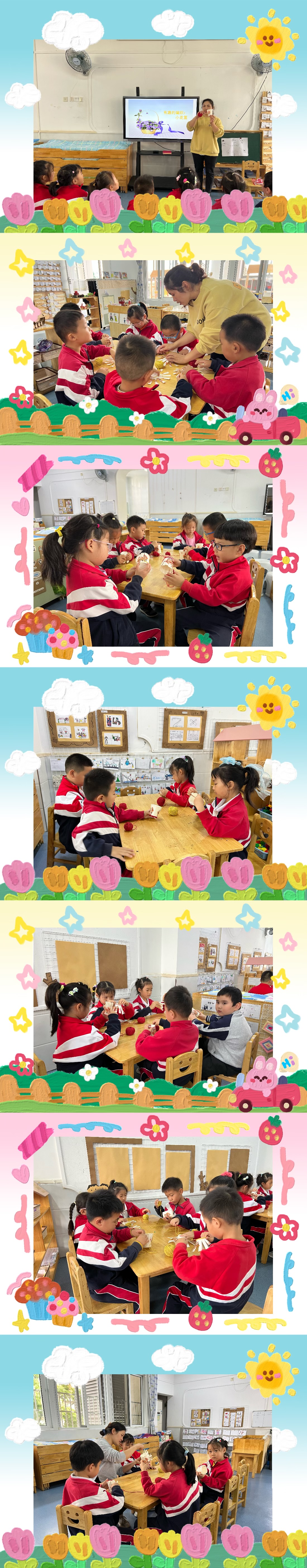 单博睿妈妈一带孩子们一起欣赏小花篮,带领小朋友们一起利用一次性纸杯通过缠、绕的方法制作小花篮。