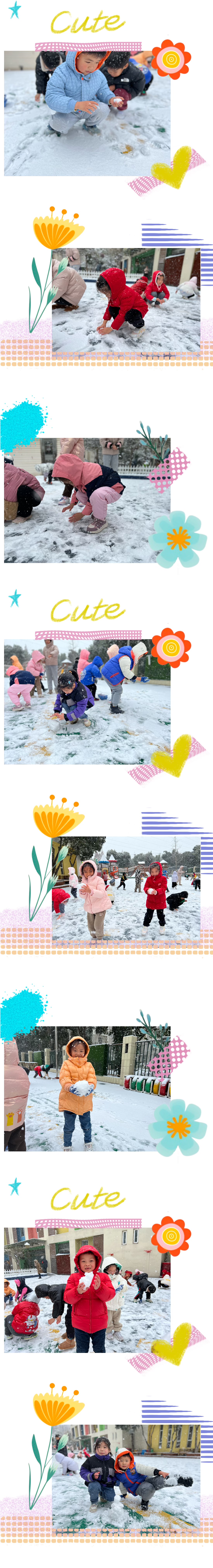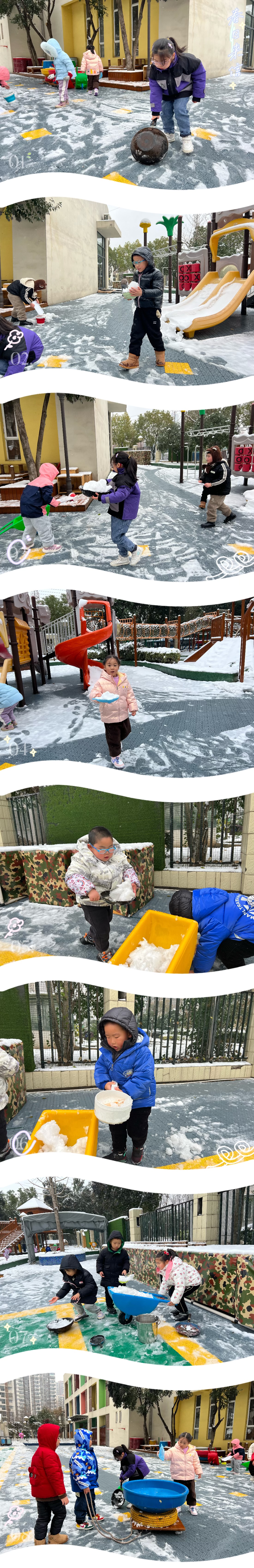 冰雪,是大自然赋予地球的珍贵礼物。当大雪纷飞的时候,整个世界仿佛被覆盖上了一层银白的纱。基于儿童的兴趣和要求,孩子们一起玩雪、堆雪人、铲雪。活动前期小朋友们一起讨论玩雪的方式有哪些、比如堆雪人、打雪仗、做冰房等各种有趣的活动,孩子们在白茫茫的世界里一起玩雪、分成小队进行铲雪、运雪的活动。