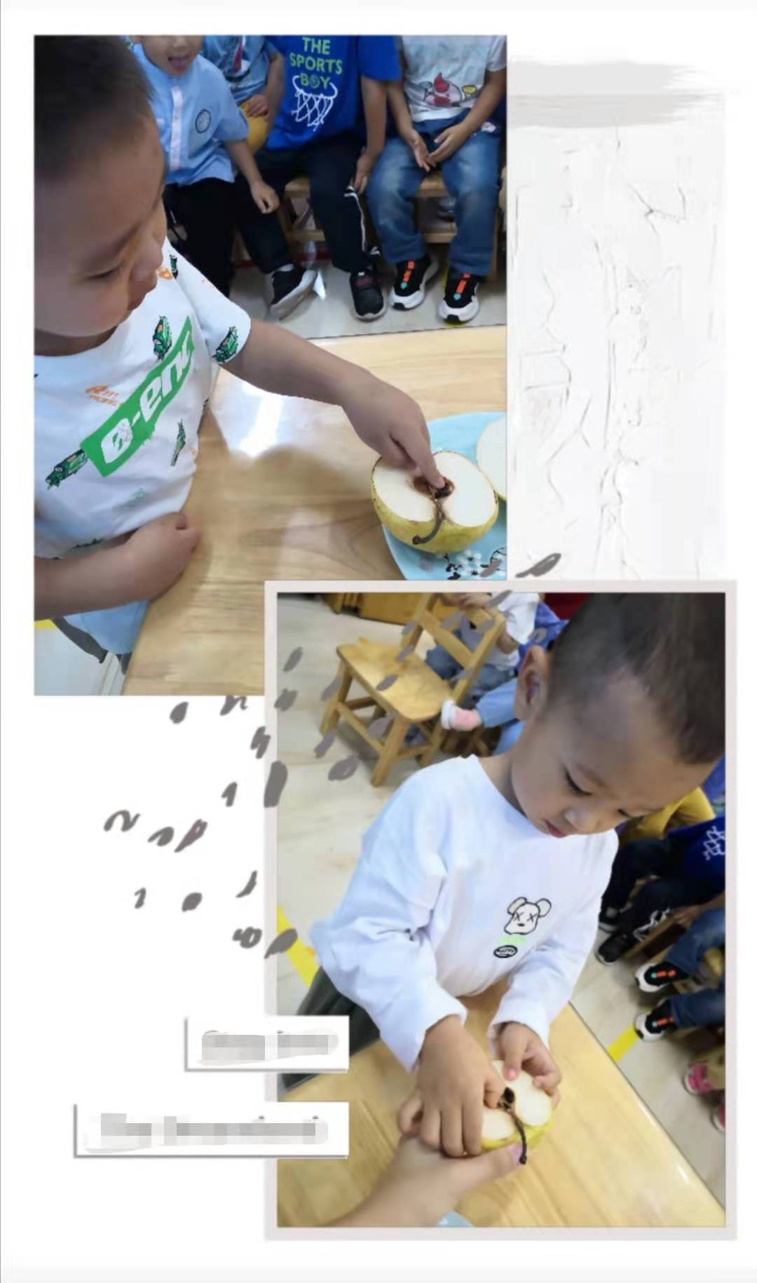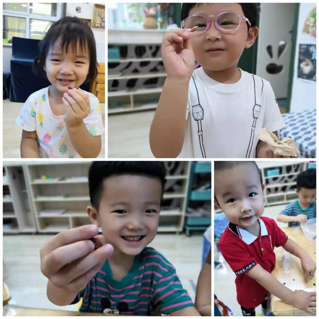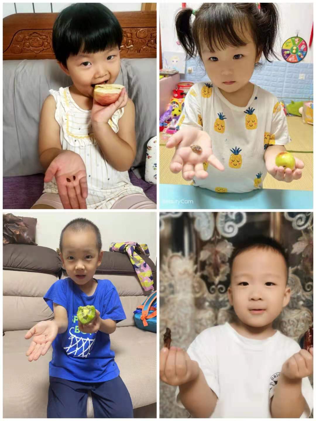 回到家,小朋友们积极探索水果种子的秘密,边品尝美味的水果,边收集种子,还带来幼儿园和小朋友们一起分享他的发现。