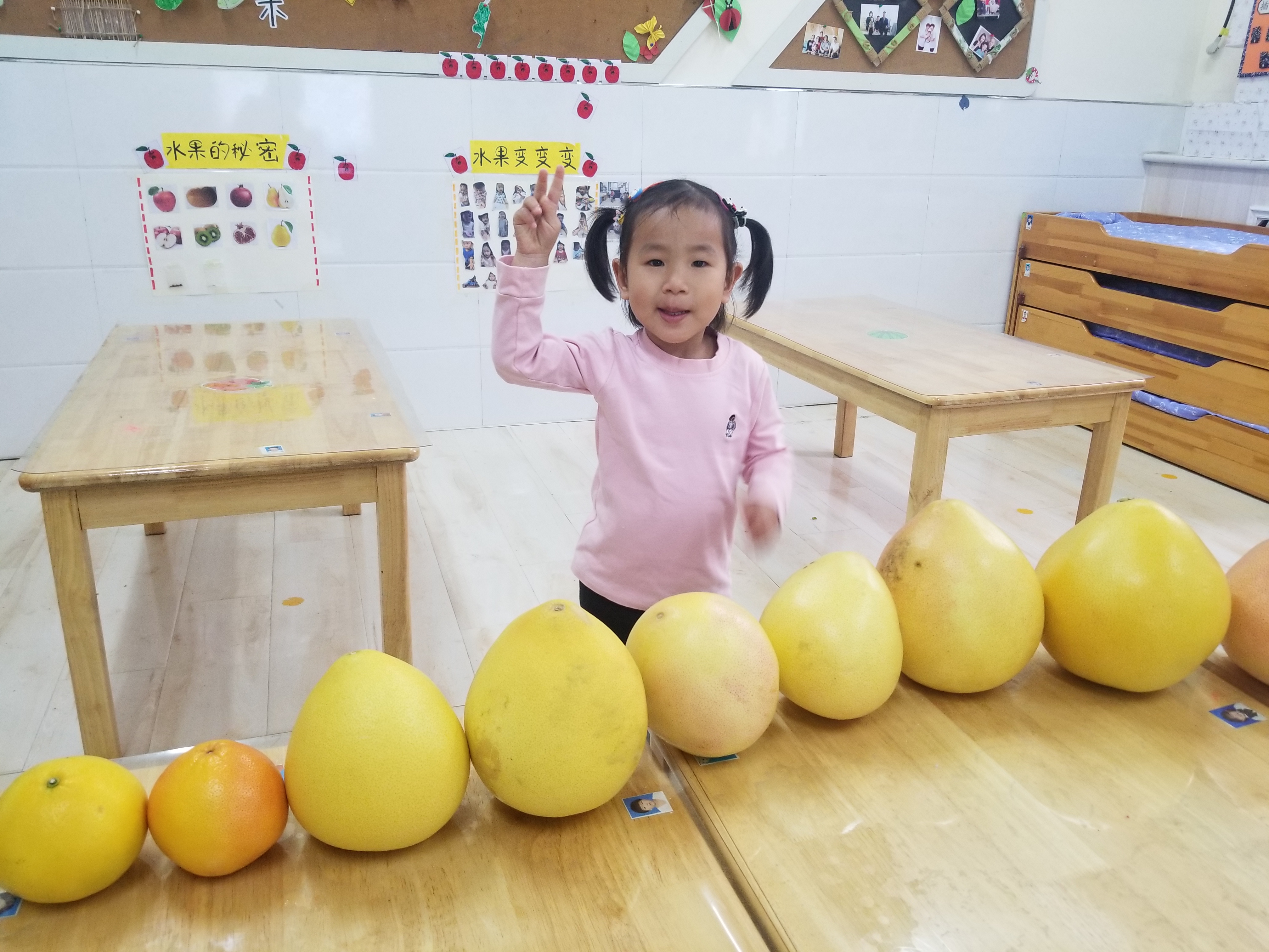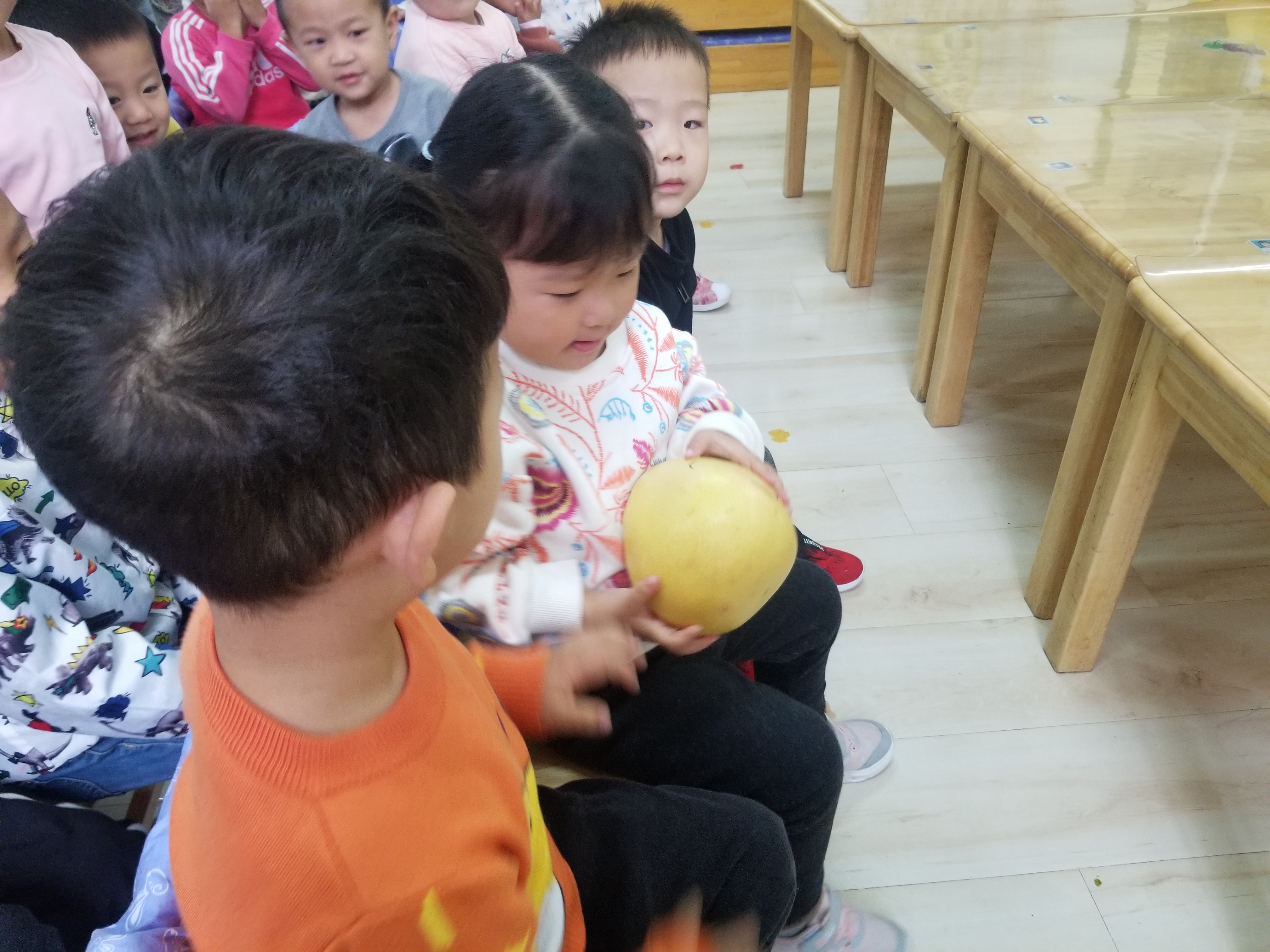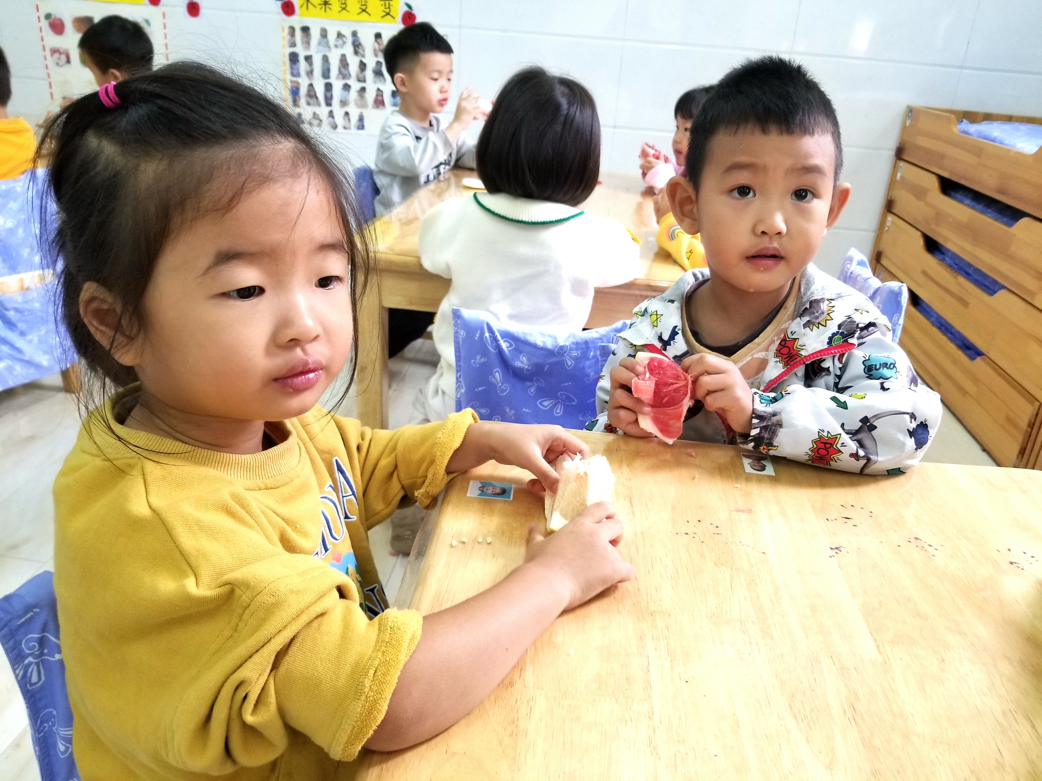 “一年好景君需记,最是橙黄柚子时。”寒露节气,正是柚子成熟的季节,水果店、菜市场随处可见柚子,小朋友对柚子非常感兴趣,为什么柚子有大有小呢?柚子是长在树上还是地上的呢?柚子的种子是什么样子呢?为此我们开展了一场关于柚子的大探秘。 首先我们在日常生活中寻找柚子,把找到的柚子带到班里,摸一摸、闻一闻、尝一尝,通过亲身感知了解柚子的特点。接着我们又和柚子做游戏,排一排大小,滚一滚小柚子,还尝试区分柚子的品种。然后我们自己动手画出了心中柚子的样子,还在食育课上制作了蜂蜜柚子茶。柚子在我们手中变化出了多种形态。 孩子的童年,需要大自然的滋养,各种各样的体验能让孩子们快乐成长。课程就是一次次的探索,我们以“柚子”为主题,通过一系列活动,让孩子们在自主观察、自主尝试、自主游戏中感受了大自然的神秘和美好,收获了甜蜜的幸福。