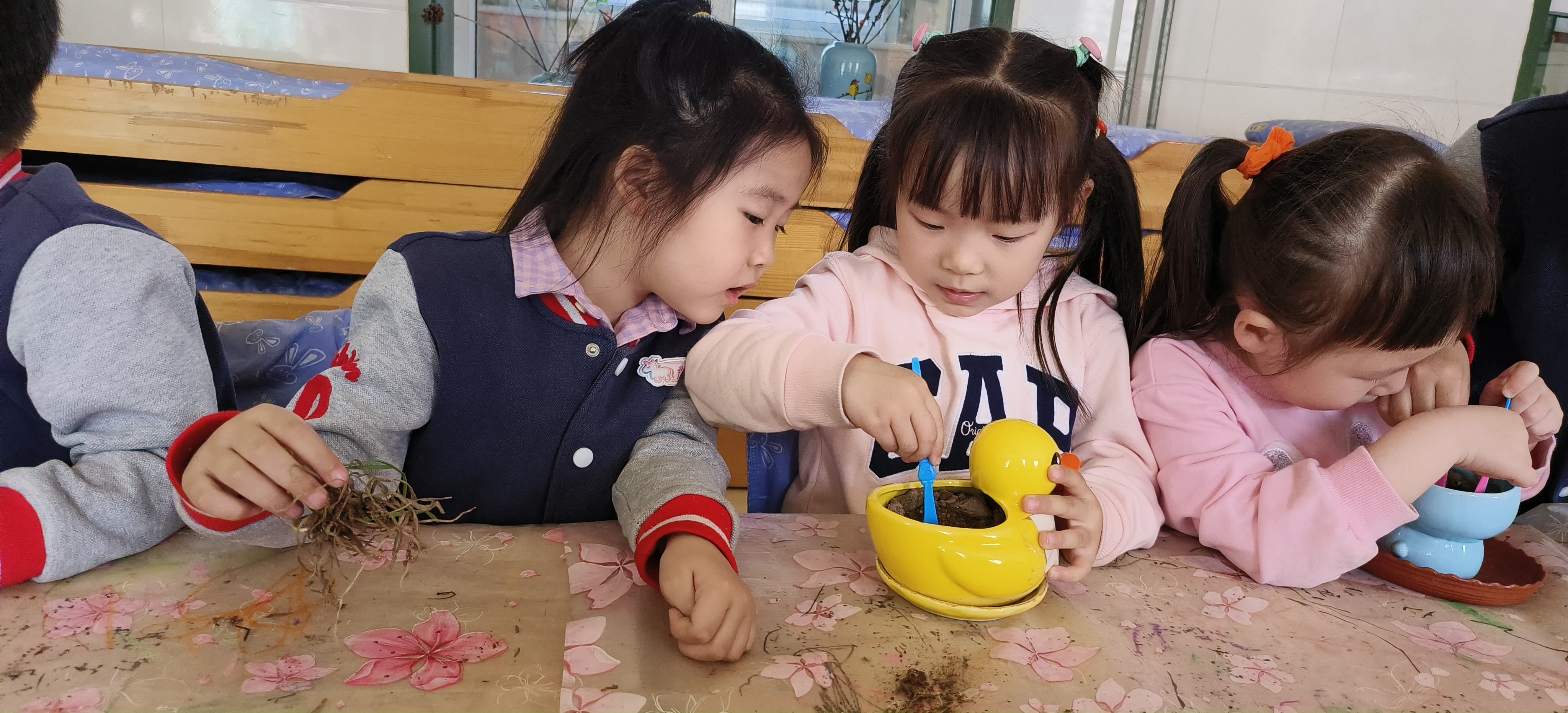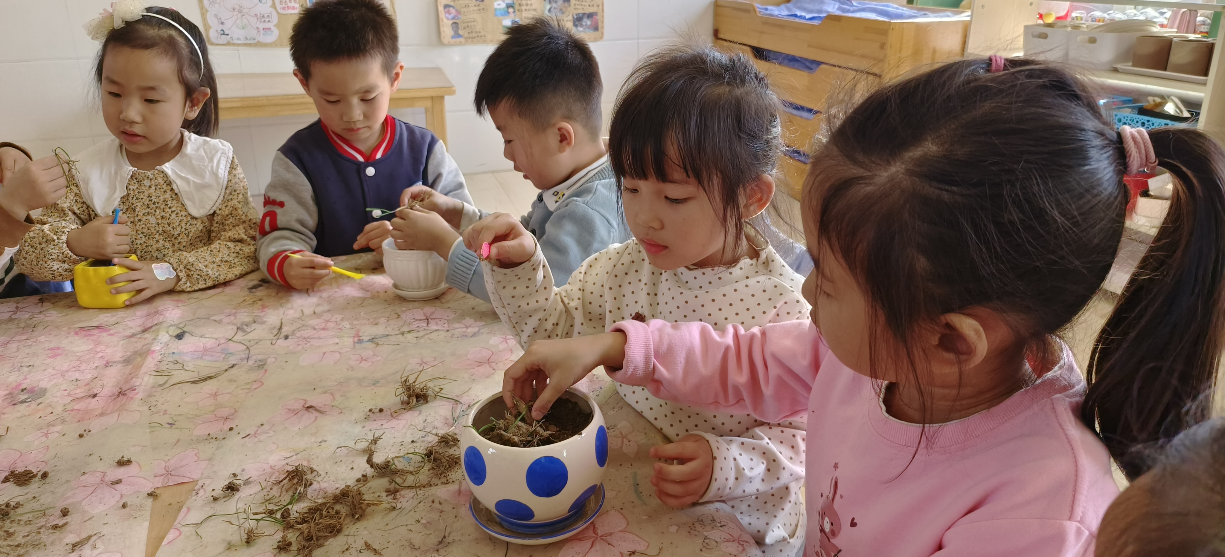 融融春光,万物生长,此时的大地,一派生机。春雷乍动,蛰伏的动物们从泥土中被惊醒,大地开始热闹起来了……在这样寒意渐退,生机渐活的时节,今天我们一起去初园寻找苏醒的小动物们了。通过小朋友们细心地观察,大家发现了好多小动物,有忙着找食物的小蚂蚁,有在池塘里游来游去的小金鱼,还有不小心掉进池塘的小蜜蜂等等,大家都在感慨原来天气真的暖和起来了,小动物们都不在冬眠了。 除了观察小动物,我们还在教室里增加了植物角,王沐泽、董恒屹、赵伊豆三位小朋友带来了草娃娃,何青旸更是从自家菜地里带来了韭菜苗,我们一起把空花盆种上了韭菜苗,教室里瞬间绿色茵茵,充满了生机。 惊蛰到,草木已动;蛰虫醒,万物复苏,一年之计在于春,让我们带着美好的期待,好好享受这充满希望的春天吧!