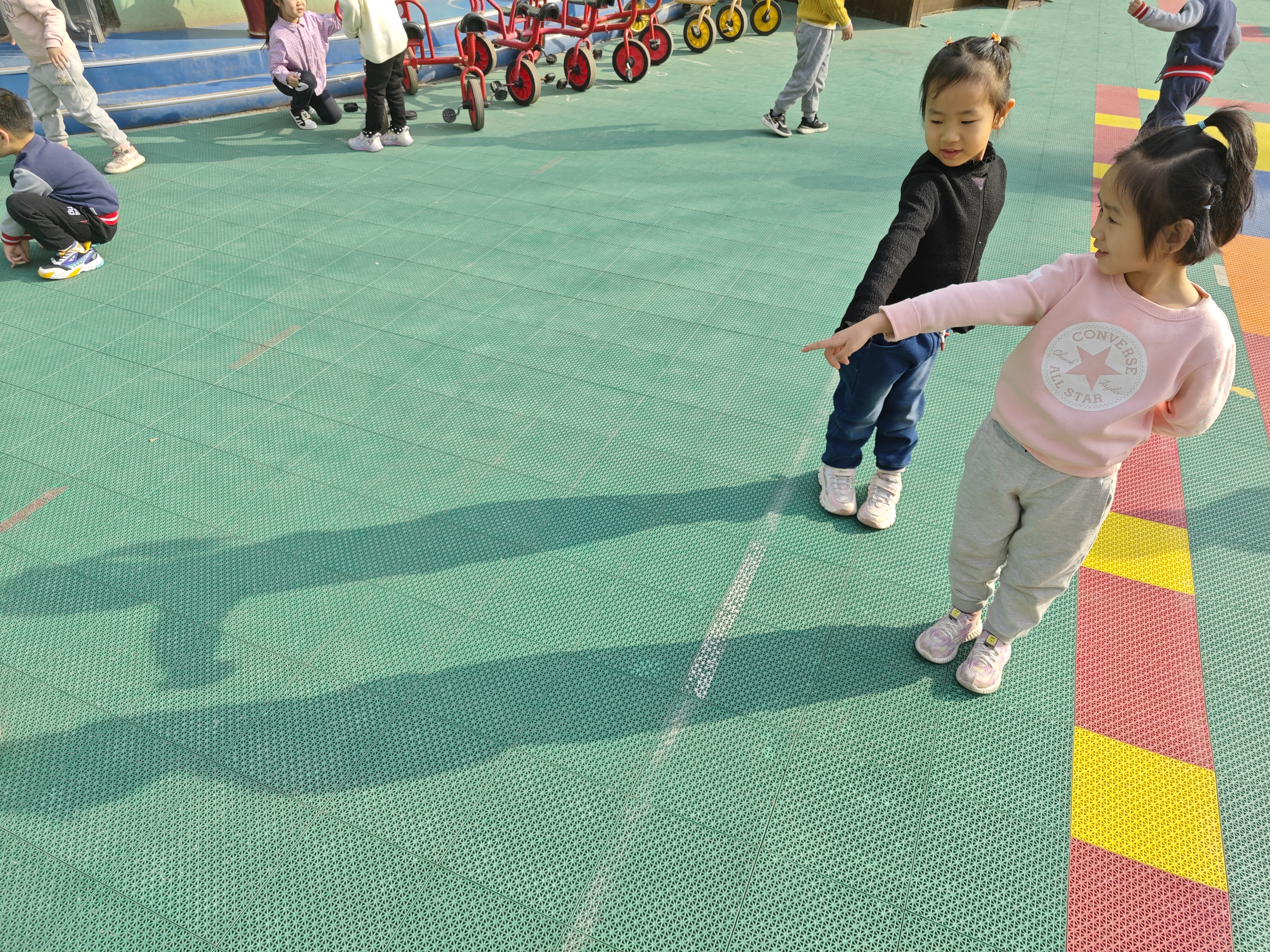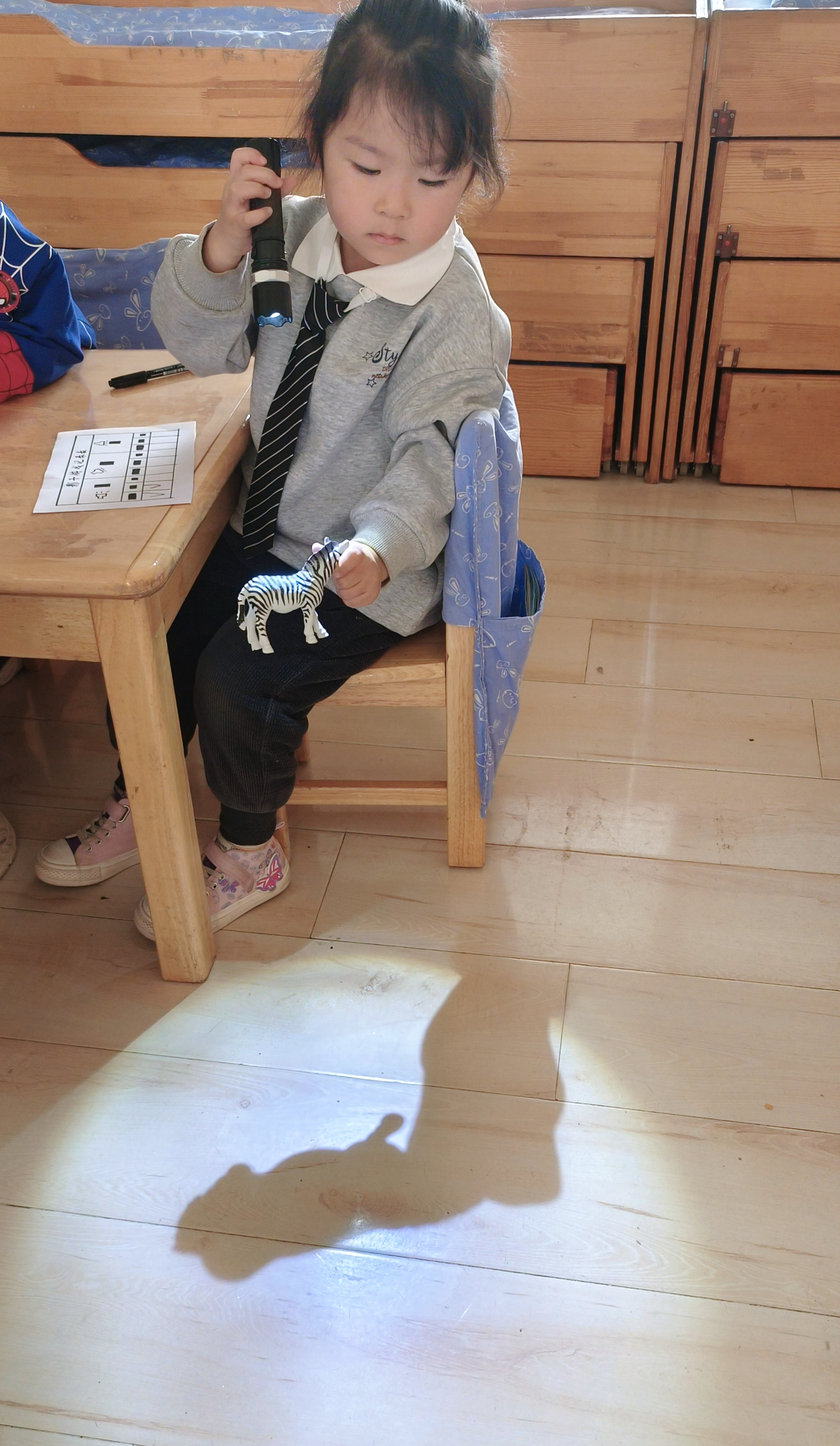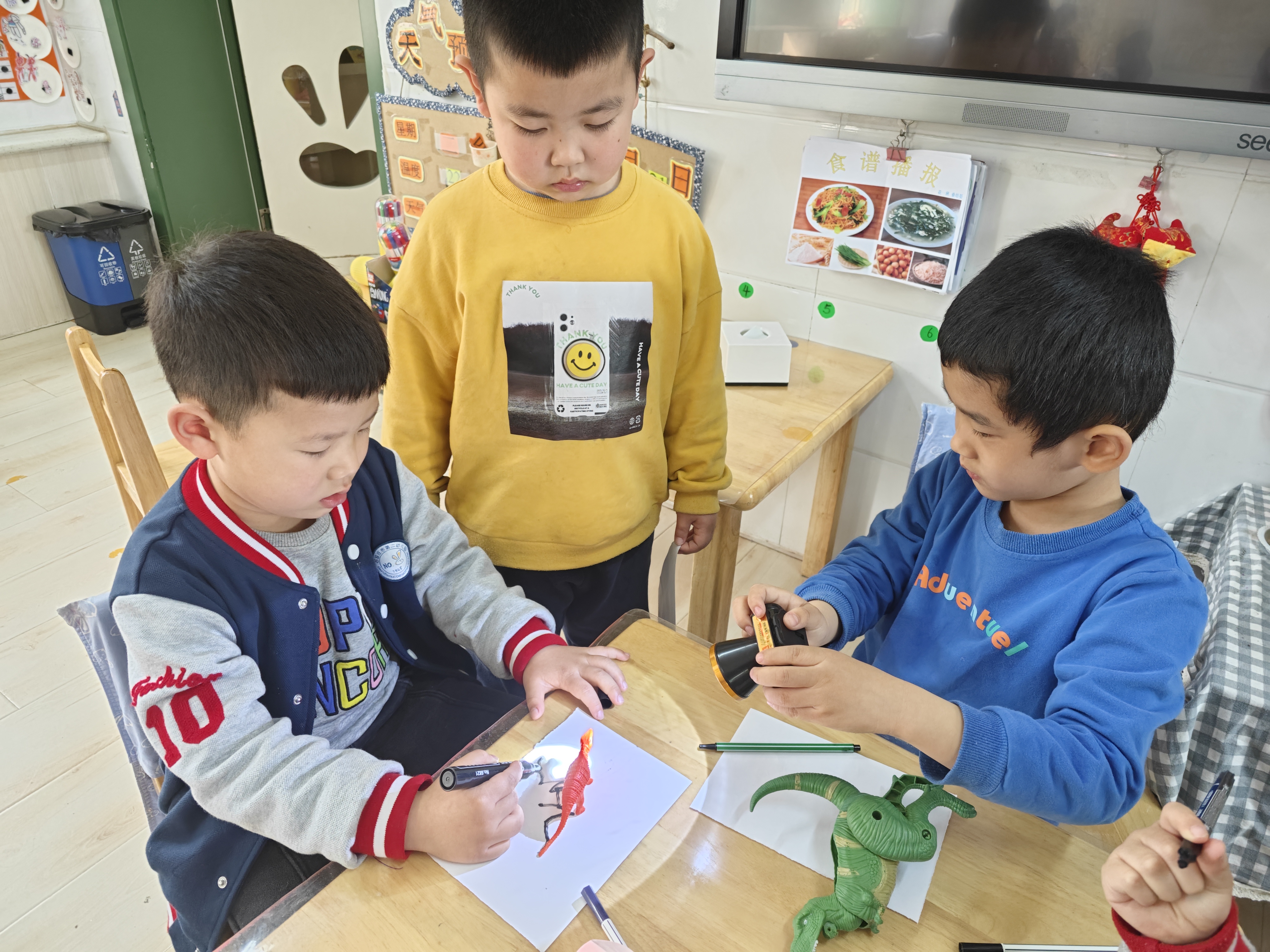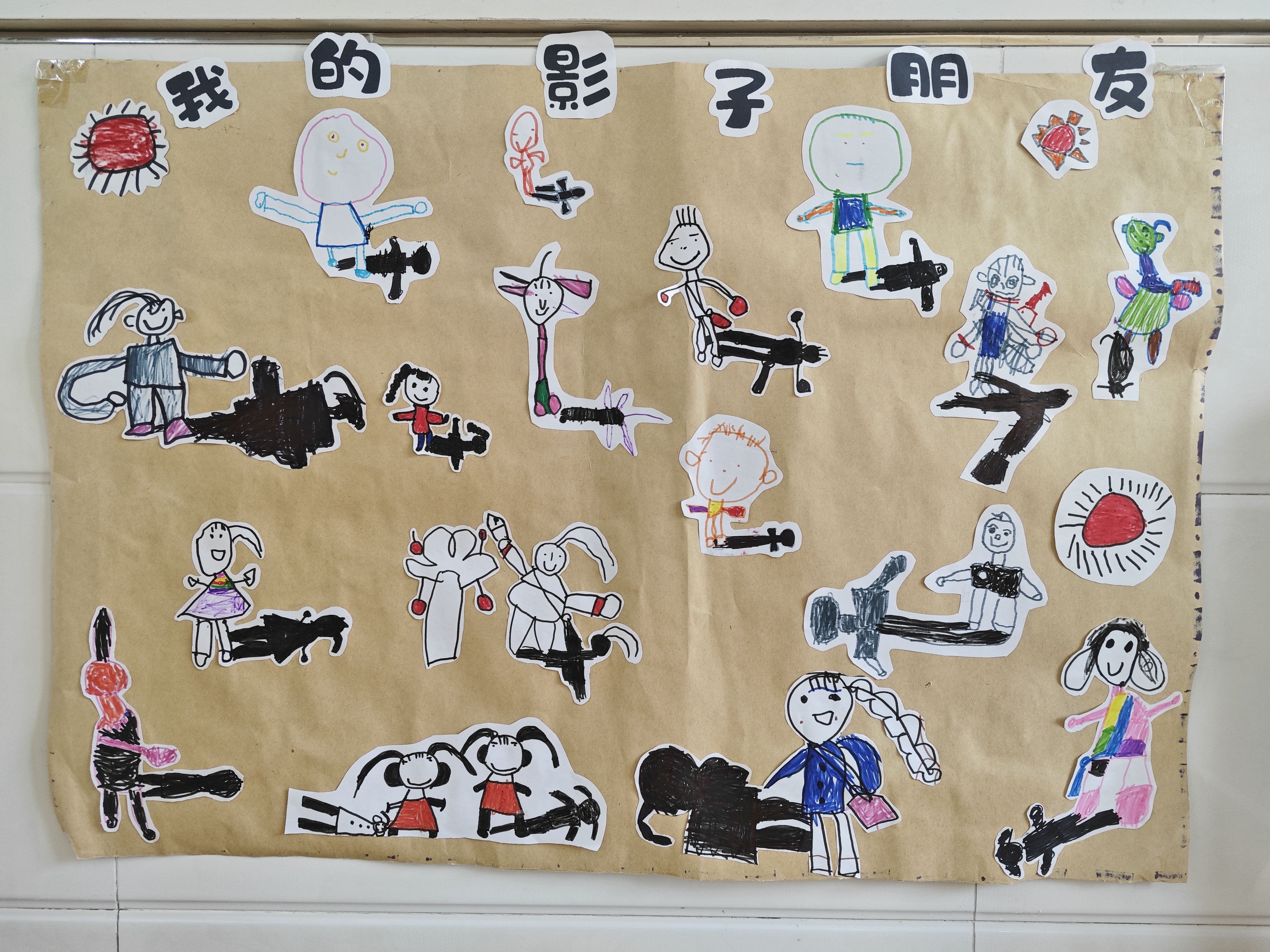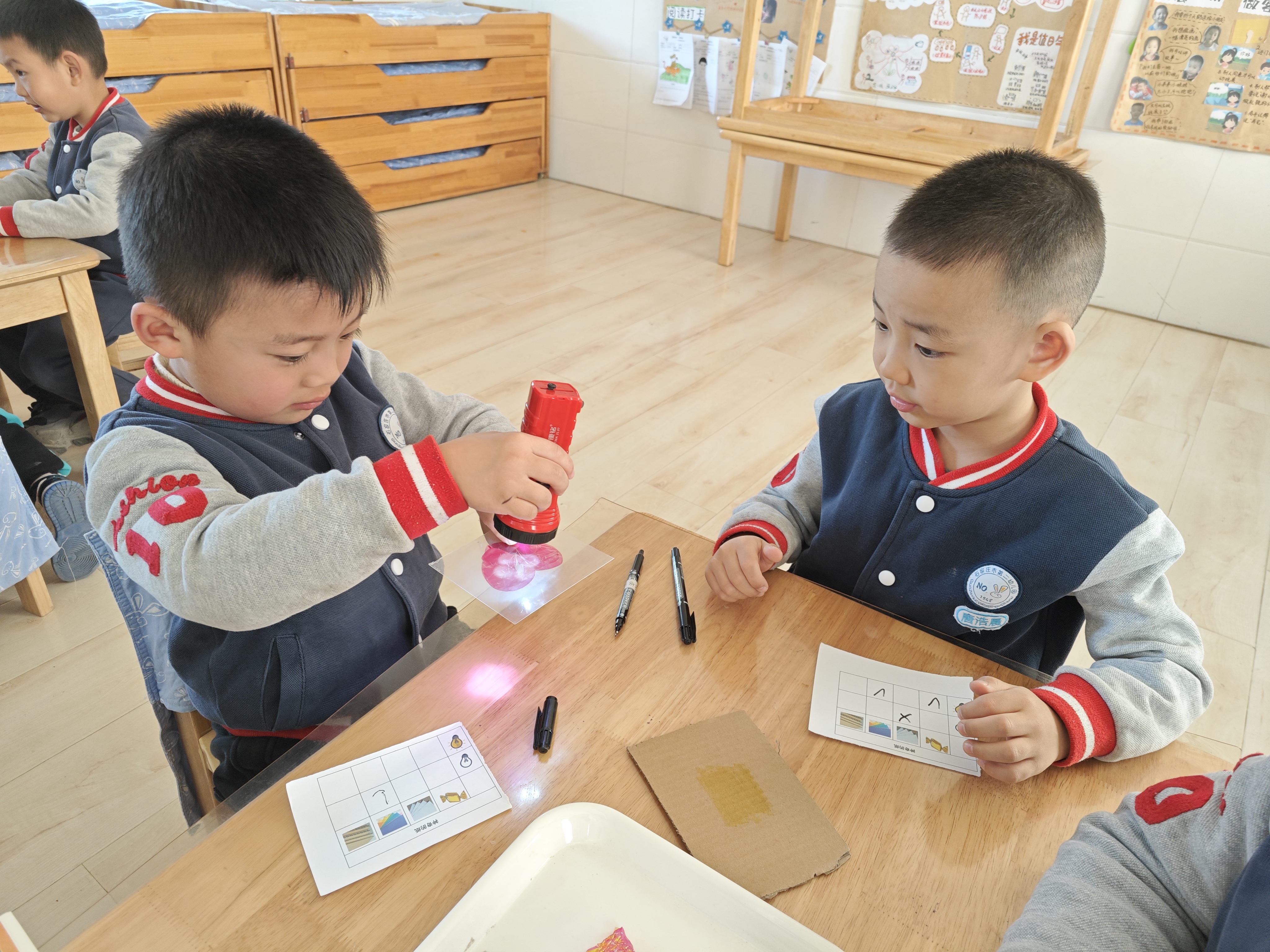 明媚的阳光下,孩子们在进行户外活动。一个个黑黑的影子总是和我们一起调皮的做游戏,无意间激起了孩子们无穷的探究乐趣。关于影子,小朋友们议论纷纷,想知道的太多了。孩子们是天生的科学家,带着好奇心、探究欲望和兴趣,本周我们一起走进了光影的小世界,探寻其中的小秘密。 恰逢阅读节启动,听了《爸爸的手影戏》这个绘本故事,小朋友们都迫不及待地跑到阳光下找自己的影子。为了摆出不同造型,他们蹲着、站着、扭动着身体,惊奇地发现影子也调皮地模仿我们的动作。影子朋友和我比,谁更高呢?塑料方块来帮帮忙吧。用一块块塑料块横着拼出影子,竖着叠起来和我一样高,数一数,影子和我谁的积木块更多呢,一定是我更高吧! “跟着我跑,学着我跳”,这就是和我们形影不离的影子。可是阴天没有太阳的时候,它也会藏起来和我们玩捉迷藏。怎么才能用手电筒变出影子呢?拉上窗帘、关上灯,手电筒照在模型上,哇,出现了好多小动物的影子啊,还可以变大变小呢。 可是手电筒一直照着也好累啊,可不可以把我的“黑朋友”留下来呢?经过一番讨论,小朋友们决定把影子画在纸上,这样就可以一直和影子做朋友啦。看我们的小黑人多可爱! 影子还有哪些好玩的呢?让我们一起动动小脑筋,在生活中去发现和探索吧。