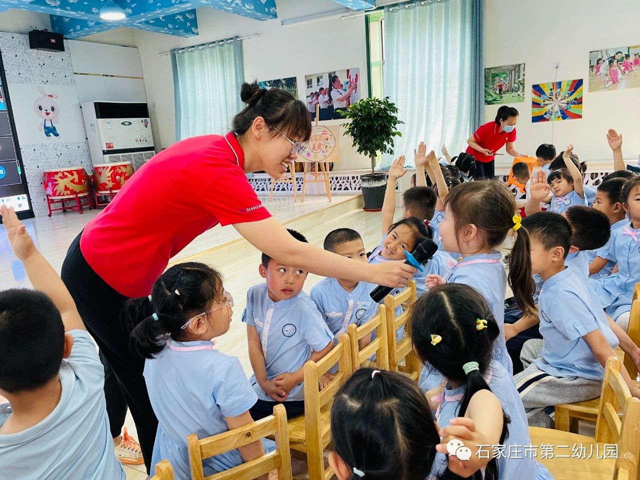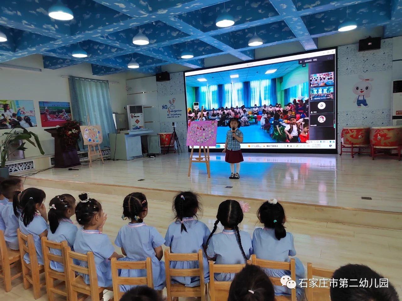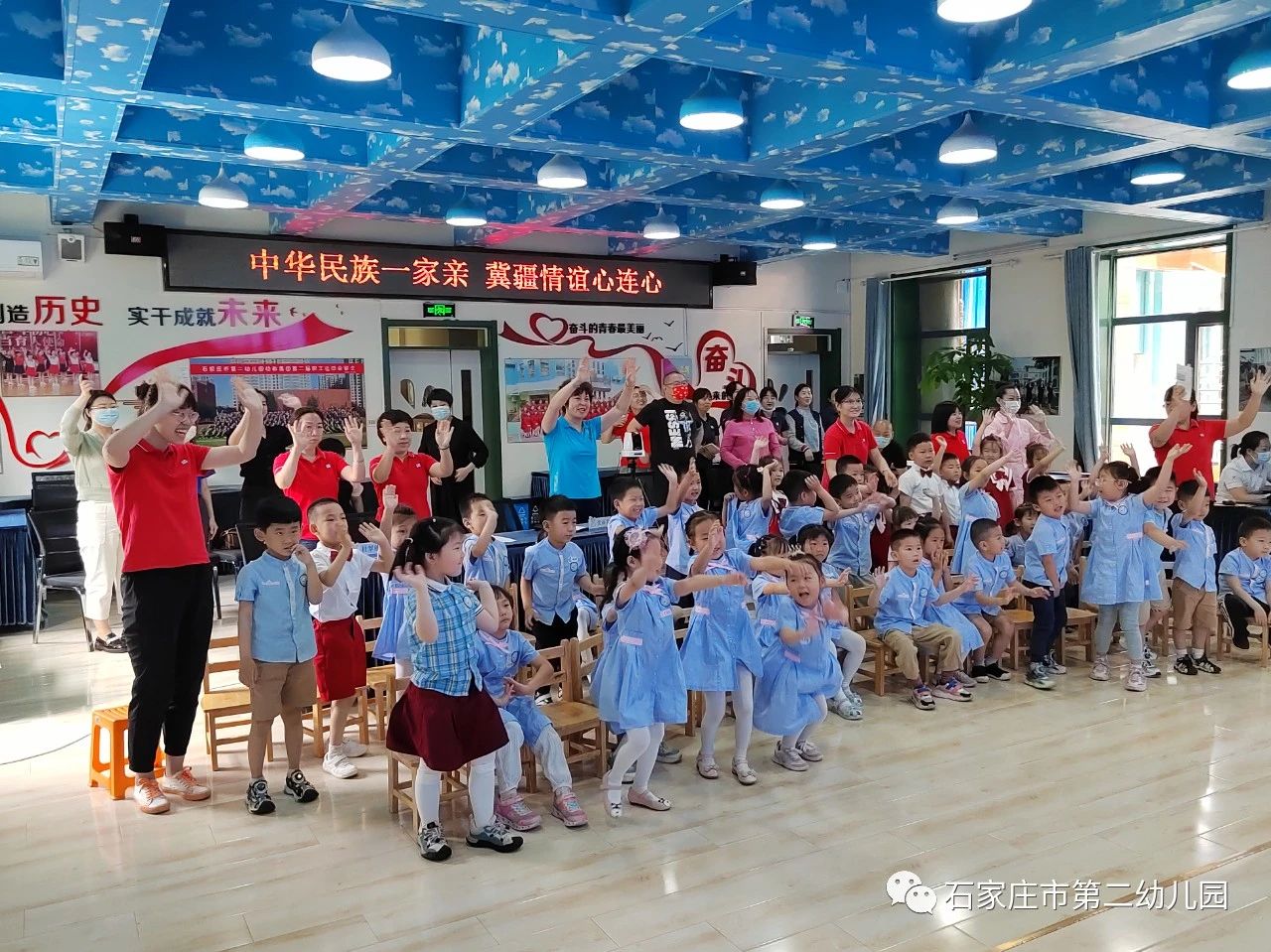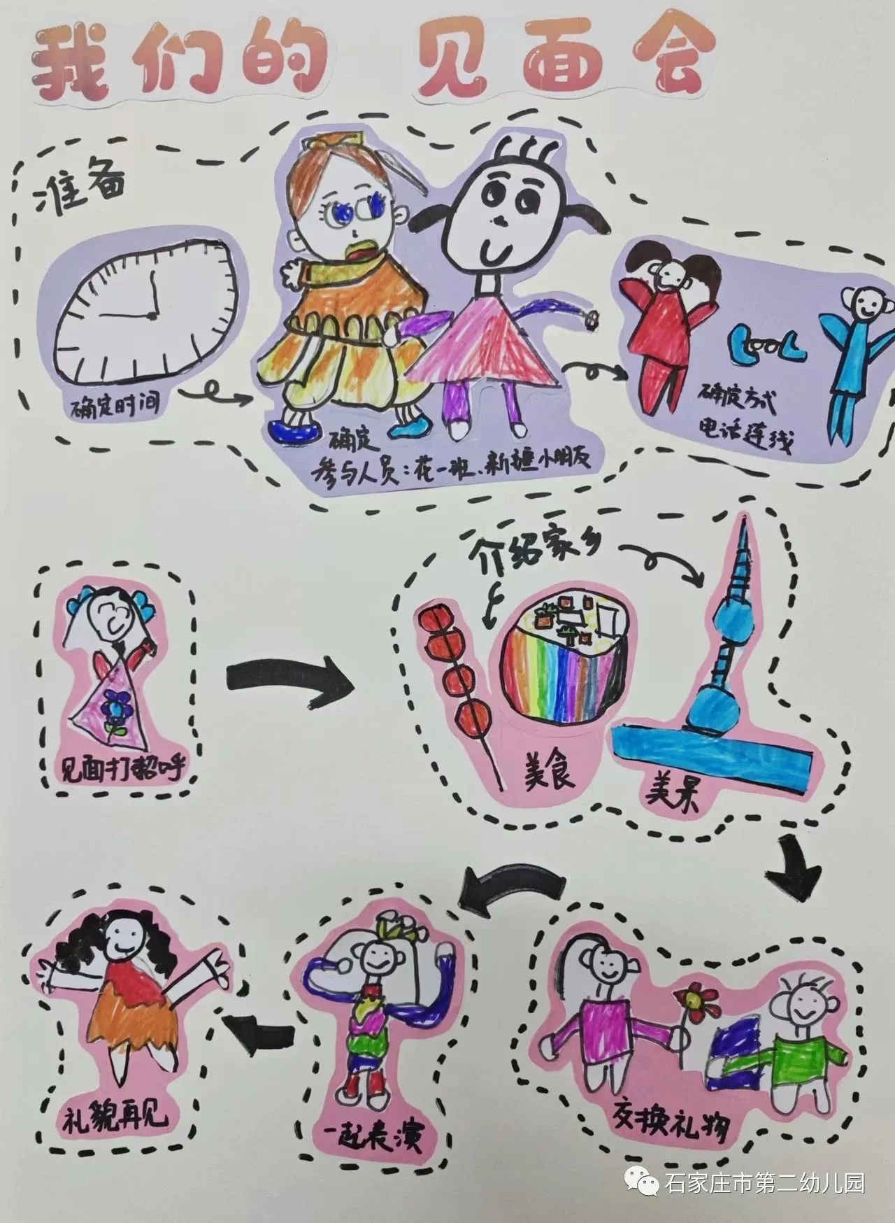 遇见是一件美好的事情,就像微风遇见花朵,就有了满园飘香。小鸟遇见天空,就有了欢快的歌声。当石家庄市第二幼儿园花一班幼儿遇见库尔勒实验幼儿园幼儿,会有怎样的奇妙之旅呢?让我们跟随他们的脚步一起去看一看……5月18日花一班与库尔勒实验幼儿园中班小朋友开展了线上见面会活动。 4月孩子们早已和库尔勒实验幼儿园的跟岗老师们建立了深厚的感情,通过和爸爸妈妈一起查阅资料和老师的讲解,更是对千里之外的新疆充满了好奇。在听到了要和新疆小朋友见面的消息,更是兴奋地讨论起来,纷纷画下自己的想法,做出了“我们的见面会”流程图,迫不及待地要和新疆小朋友见面。还认真地画下自己的自画像,精心地做成小礼物,想要送给远方的朋友。 5月18日期待已久的云见面终于到来了,当大屏幕上显示出两地孩子稚嫩、激动的面庞时,瞬间点燃了孩子们的心,跨越千里的孩子们激动得扬起小手打招呼。借由线上连线平台,两地小朋友们迫不及待地向对方介绍自己家乡的美食特产以及美景。新疆的烤馕、香梨、葡萄,河北的金凤扒鸡、白吉馍夹肉等美食让在座的小朋友垂涎欲滴,两地的多处美景更是让大家心生向往。“新疆维吾尔族小朋友叫什么名字?衣服是什么样子?石家庄市第二园到底是什么样子?小朋友最喜欢玩什么游戏……”互动环节中小朋友大胆提问、勇敢表达,认识了更多朋友的同时,也增加了对彼此的了解。双方互献连心卡,向远方的朋友诉说自己的心愿,送上最美的祝福。在经典的《娃哈哈》音乐声中孩子们载歌载舞,表达自己激动的心情和对远方朋友的热切期盼。 一张张笑脸、一个个身影都定格在美丽的照片内,快乐丰富的线上见面会活动在孩子们的兴奋和开心中结束了。石家庄市第二幼儿园与库尔勒实验幼儿园定会持续推进和深化手拉手结对活动,促进师生之间的交融,两地幼儿园的师生如同石榴籽般紧密拥抱在一起,同心浇灌民族团结进步之花!