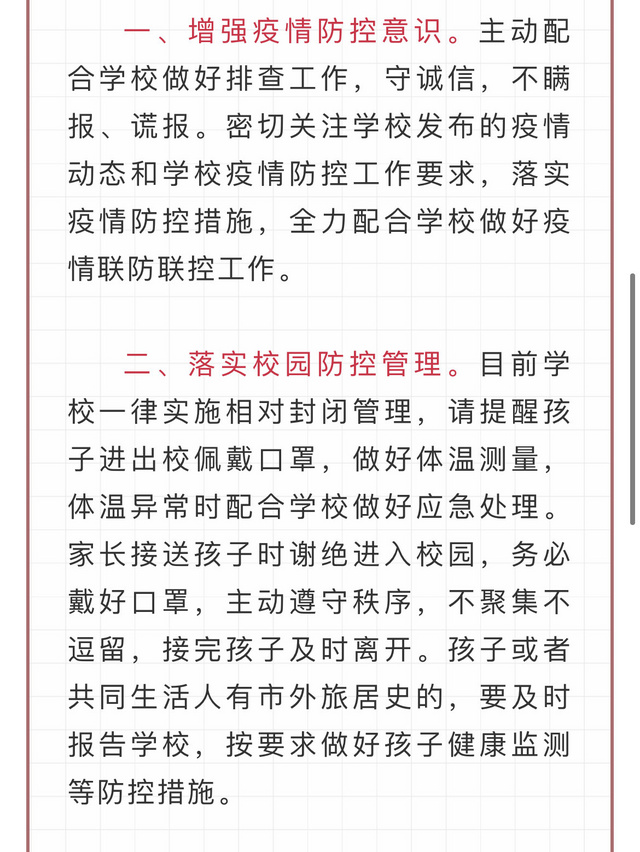 二、落实校园防控管理。目前学校一律实施相对封闭管理,请提醒孩子进出校佩戴口罩,做好体温测量,体温异常时配合学校做好应急处理。家长接送孩子时谢绝进入校园,务必戴好口罩,主动遵守秩序,不聚集不逗留,接完孩子及时离开。孩子或者共同生活人有市外旅居史的,要及时报告学校,按要求做好孩子健康监测等防控措施。