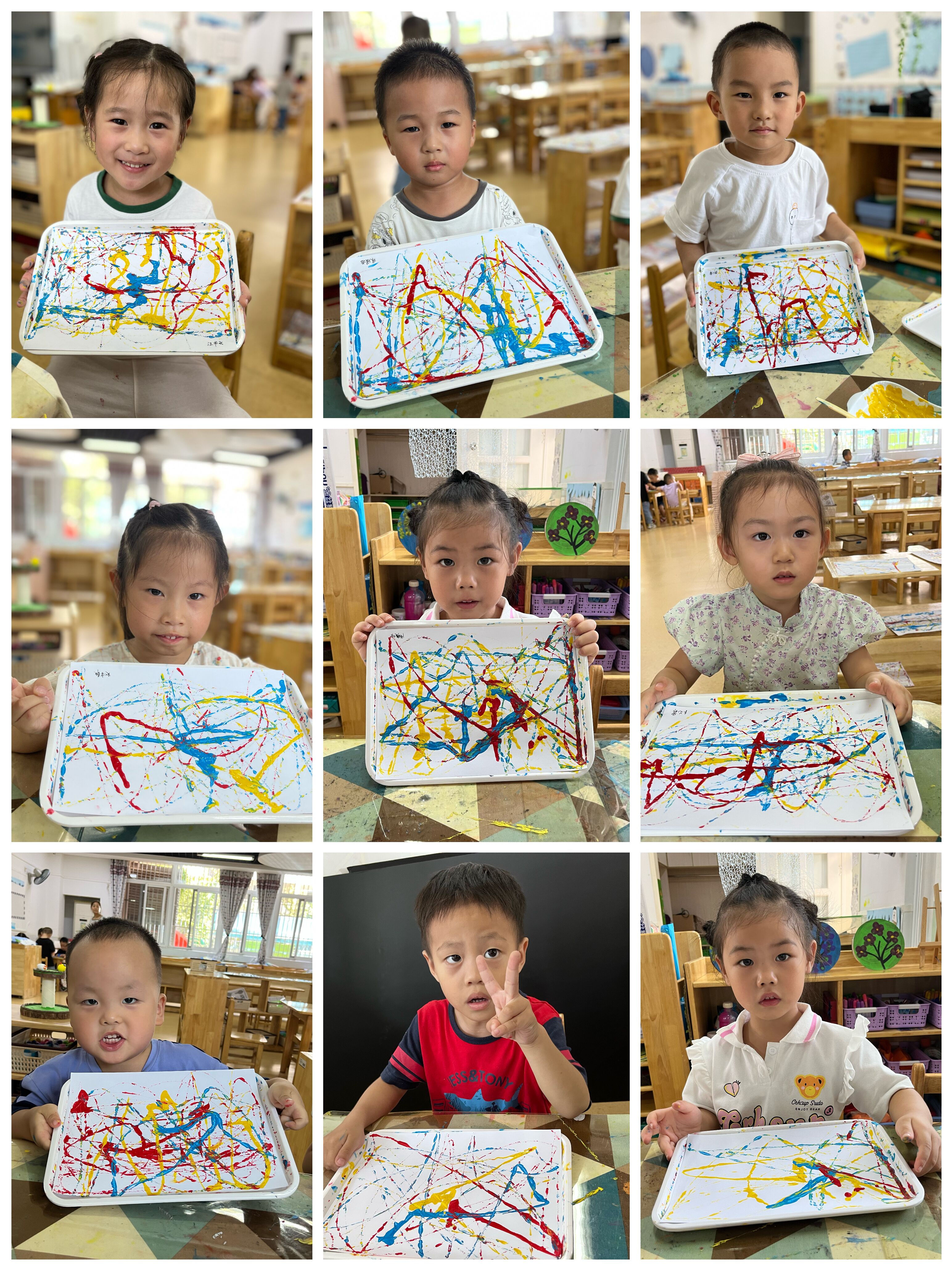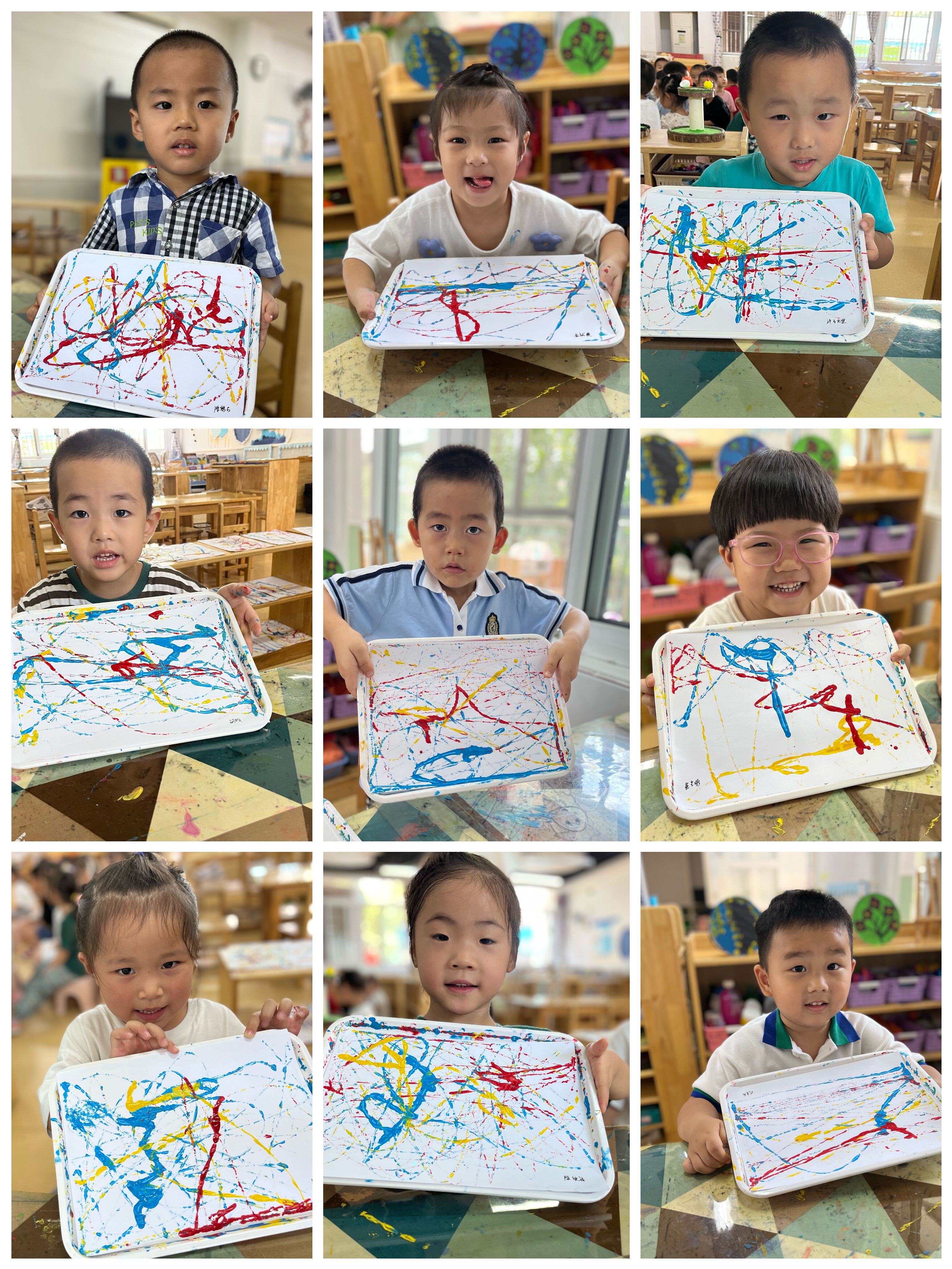 生活中有无穷无尽可供孩子们作画的工具,小班孩子正处于涂鸦期、表现期,他们好奇、好动、好模仿,还喜欢明亮的色彩。结合幼儿的的年龄特点,今天将弹珠蘸上颜料在纸上进行滚动,纸上就出现了各种五彩斑斓有趣的线条,这让孩子们在玩中认识了色彩,感受到世界任何物品都可以无限的想象和创作。