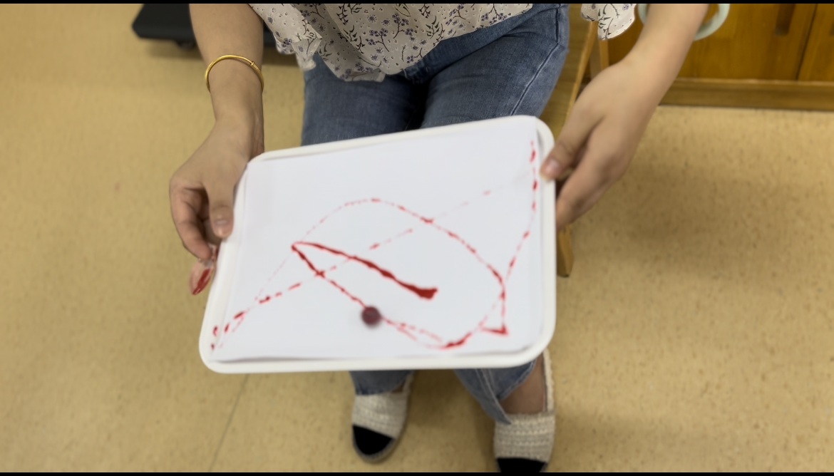 轻轻地把穿上衣服的珠子用小勺子舀出来放进托盘盒子里,将珠子滚一滚,滚过来滚过去,漂亮的线条出来啦!将珠子抖一抖,跳个舞,美丽的图画出来啦!