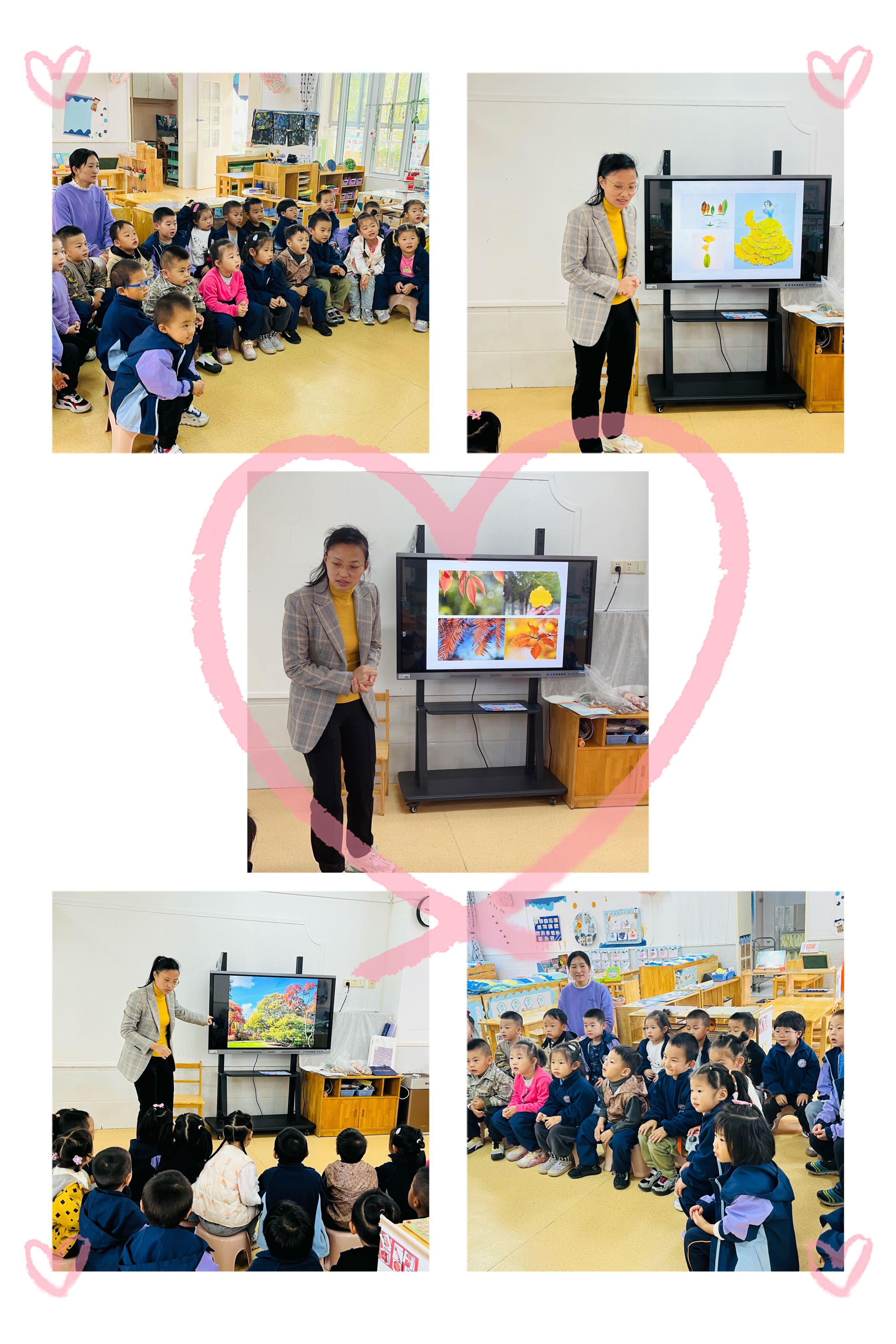 家长通过PPT向小朋友们介绍秋天的树叶的变化、认识树叶的形状与颜色、赏析树叶粘贴范例画,看孩子们认真的样子真可爱。