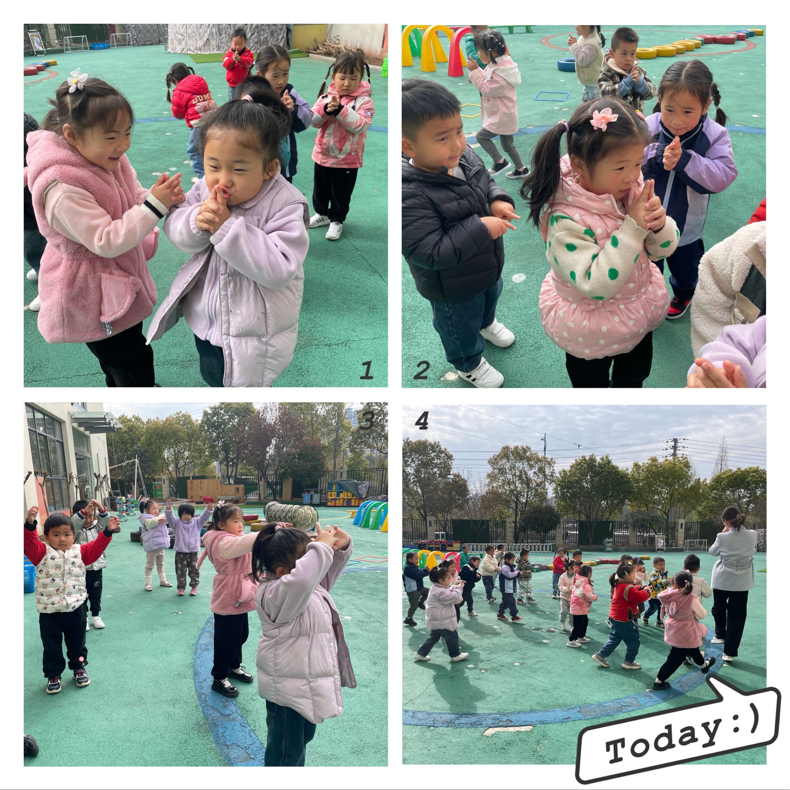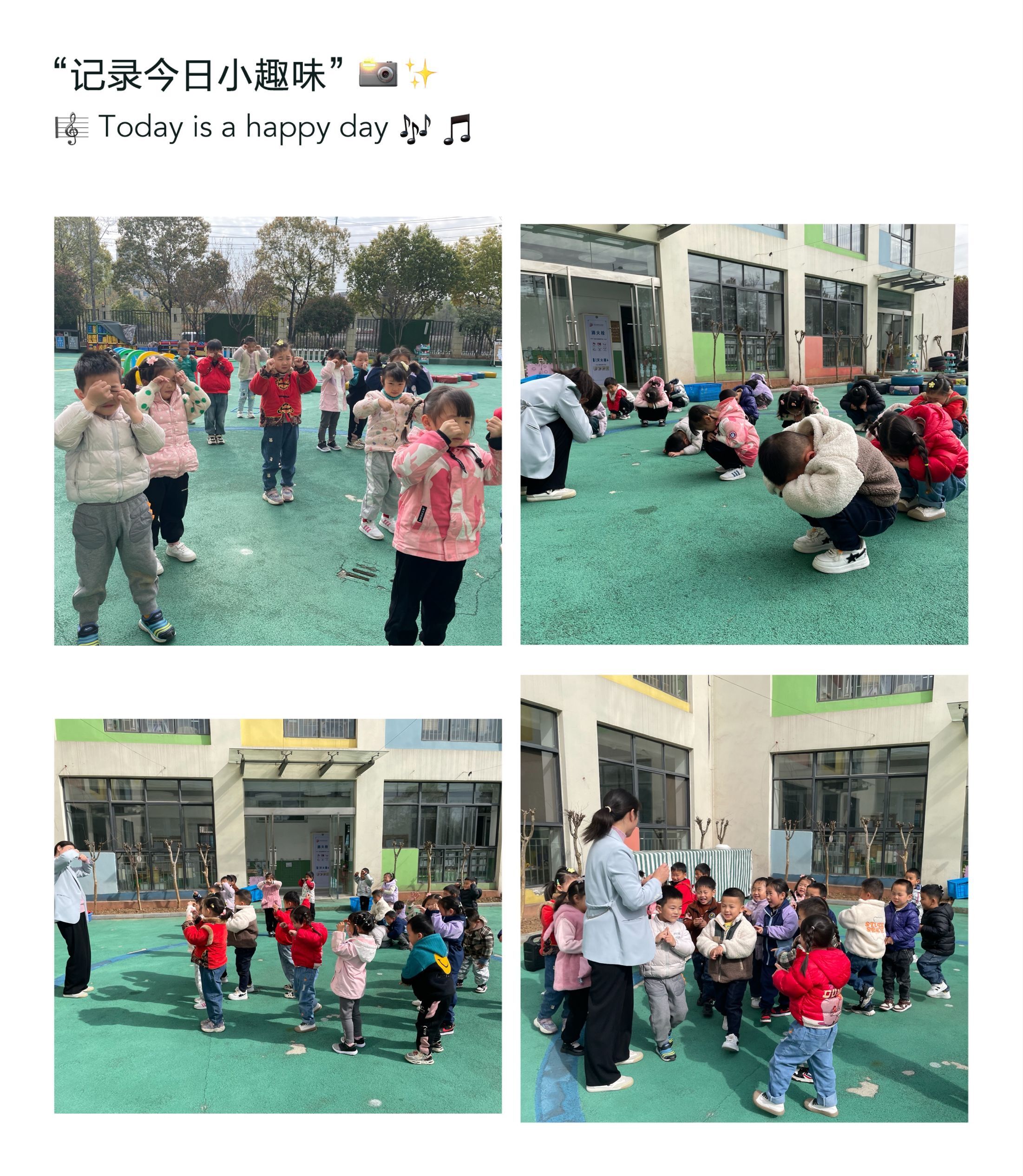 音乐律动《小鸡出壳》在教师的带领下,孩子们随乐做起了模仿动作。在壳里睡觉、揉眼和破壳而出,小鸡出壳、走路找食等动作,孩子们模仿的有声有色,可爱至极。