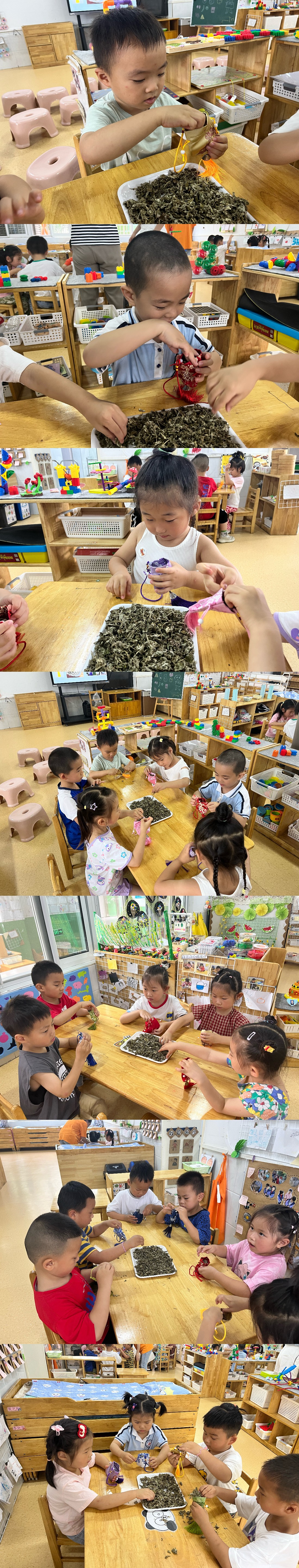 只见孩子们用稚嫩的小手装上艾草,接着用小手按压,最后用绳子缠绕封口。很快,一只只小巧玲珑、透着清香的香囊便做好了。