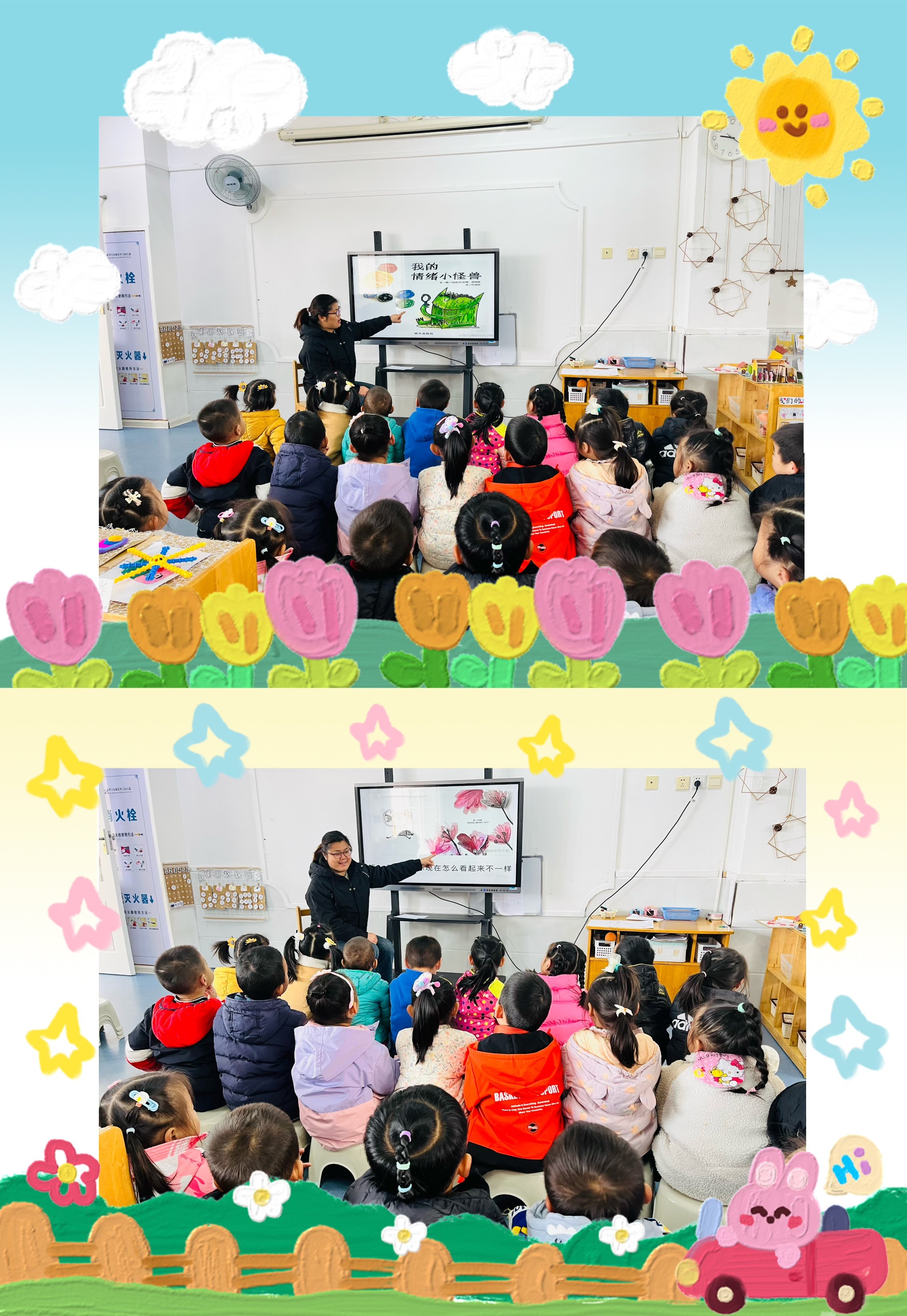 本周我们开展了一节语言活动《我的情绪小怪兽》,这本绘本正是抓住孩子认知特点,将抽象的、看不见的“情绪”转化为可以看见和感受到的视觉体验。对于孩子们来说,开心、害怕、生气、平静是四种最常见的情绪。不同的情绪会有不同的小怪兽跑出来噢!