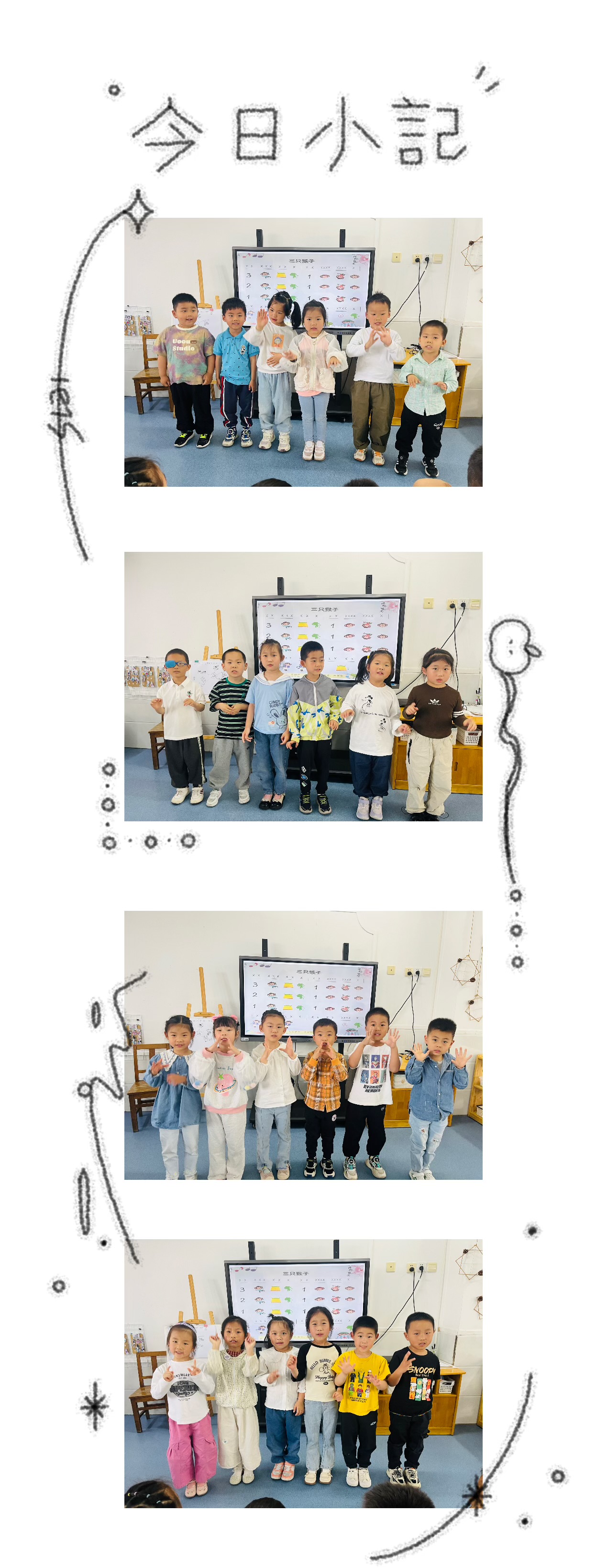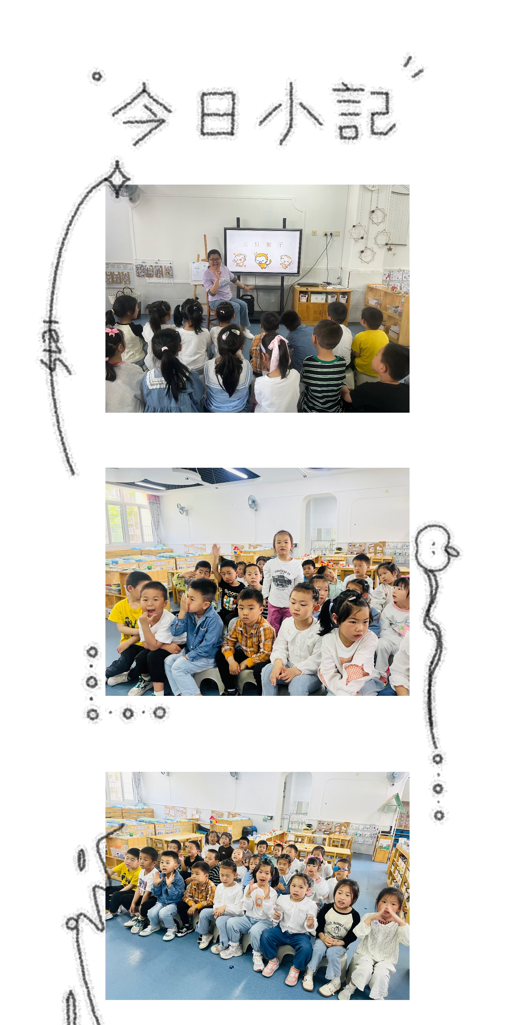 今天开展了《三只猴子》是一首诙谐幽默的儿童歌曲,旋律简单,歌词有趣,通俗易懂,深受小朋友们的喜爱。本次活动根据幼儿的年龄特点,以顽皮的小猴子为音乐素材,让孩子们根据图谱有节奏地模仿小猴子跳的过程中感受歌曲的节奏,体会歌曲幽默、诙谐的风格和逐步学唱歌曲。