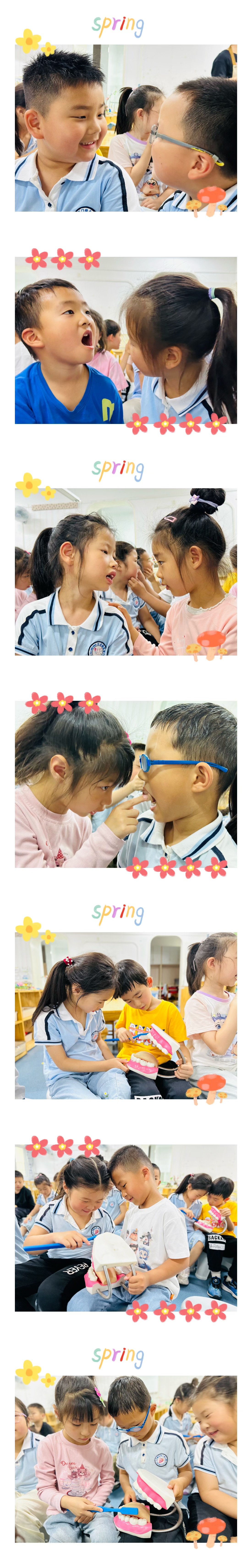 小朋友们互相观察对方的牙齿,看看有几颗牙齿掉了?其他的牙齿怎么样?我们来比一比!