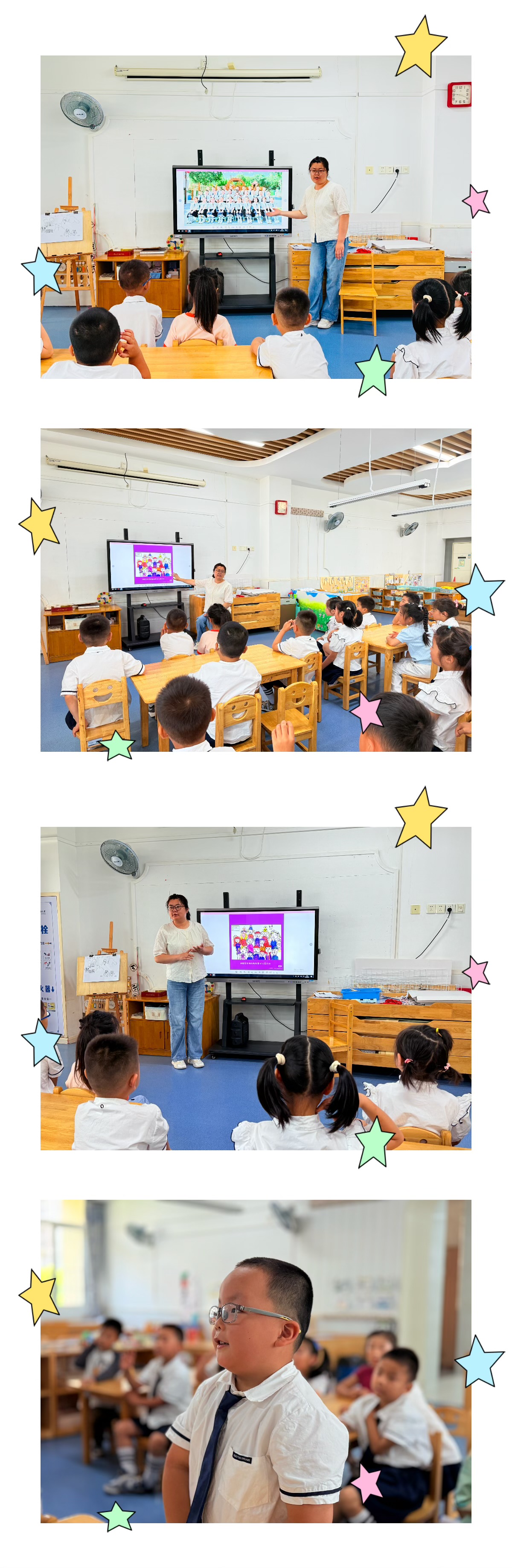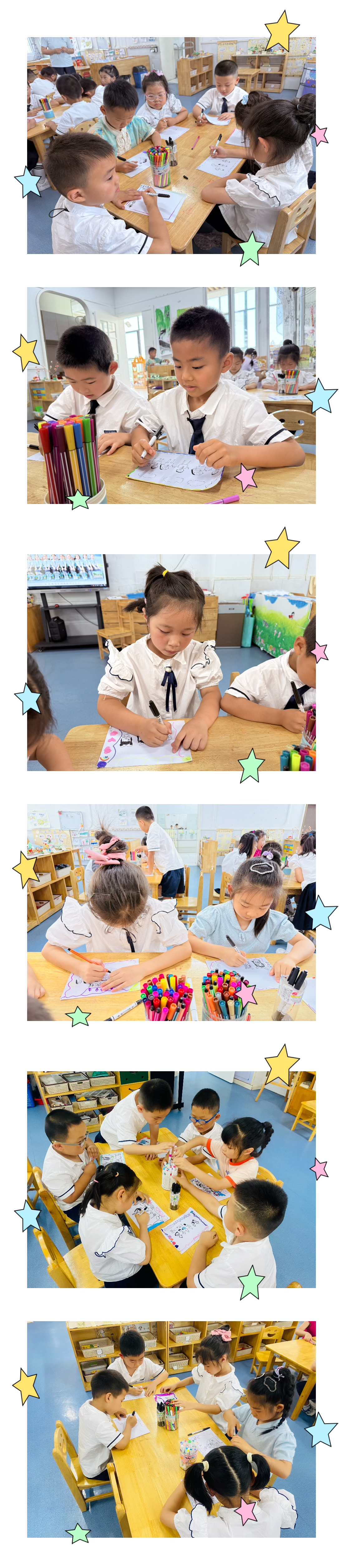活动一开始教师出示了孩子们的毕业照,给幼儿欣赏,激发幼儿创作全班福的兴趣。