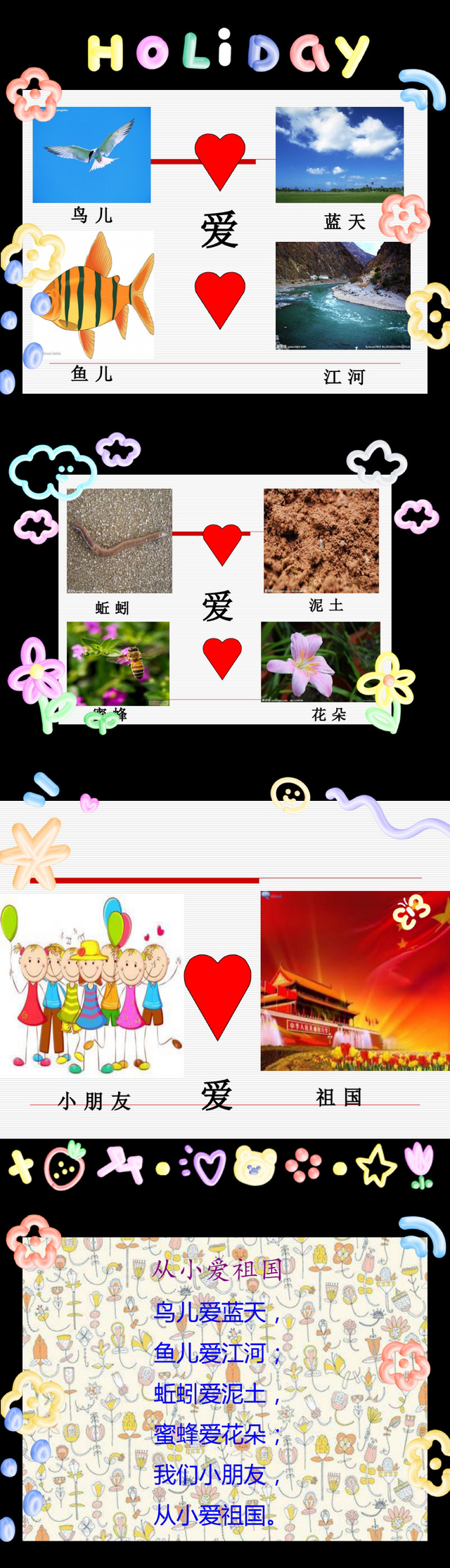 《指南》社会领域社会适应目标3具有初步的归属感中提出培养幼儿从小爱祖国,认识国旗,知道国歌。在这个活动中采用课件的形式导入"爱"字,调动起了幼儿的积极性。通过观察画面,理解“爱、鸟儿、鱼儿、蚯蚓、蜜蜂”等词语,鼓励幼儿能用“XX爱XX”的句式尝试描述事物之间的关系。在活动过程中,幼儿对于图文结合的方式学习起诗歌来兴趣也比较浓厚,很快能够掌握诗歌内容。这个活动中,运用幼儿喜闻乐见和能够理解的方式激发幼儿爱家乡、爱祖国的情感。