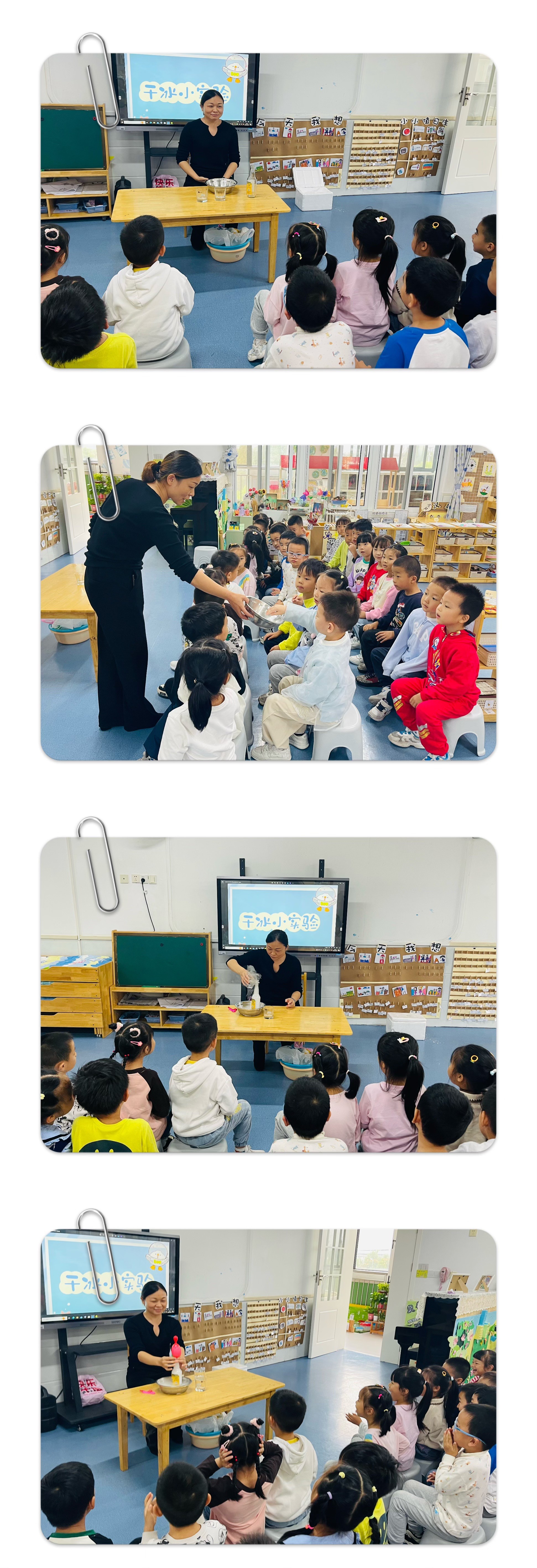 这次的干冰趣味实验,孩子们不仅认识了干冰,还通过各种实验了解到物理变化以后的干冰是什么样子的,相信如此快乐的操作过程,能让孩子对干冰的认识印象更为深刻。