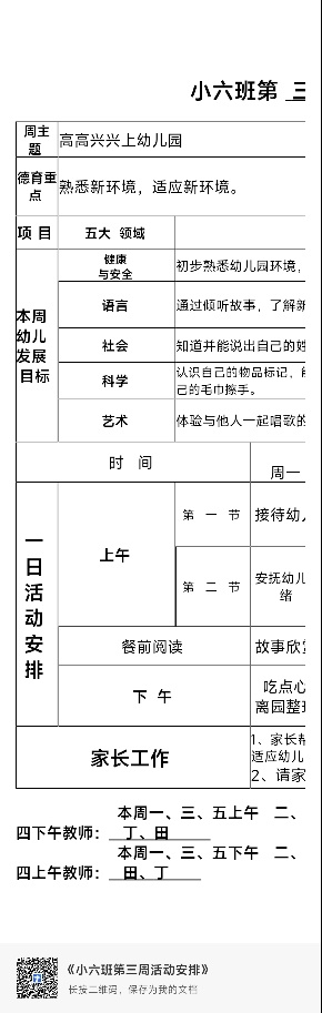 小六班第 三 周活动安排表 2022年 9月5日—— 9 月9日 周主题 高高兴兴上幼儿园 德育重点 熟悉新环境,适应新环境。 项 目 五大 领域 领 域 目 标 本周 幼儿 发展 目标 健康 与安全 初步熟悉幼儿园环境,体验幼儿园生活的快乐 语言 通过倾听故事,了解新型冠状病毒的由来、传播方式及预防病毒的方法。 社会 知道并能说出自己的姓名,增强自我认知的能力。 科学 认识自己的物品标记,能区分自己与别人的物品,知道要用自己的杯子喝水,用自己的毛巾擦手。 艺术 体验与他人一起唱歌的快乐,萌发对上幼儿园的向往之情。 时 间 周一 周二 周三 周四 周五 一 日 活 动 安 排 上午 第 一 节 接待幼儿 接待幼儿 稳定幼儿情绪 手指游戏 桌面游戏 第 二 节 安抚幼儿情绪 开学第一课 《了解新冠病毒》 音乐: 《笑一个吧》 户外活动: 滑滑梯 游戏: 吹泡泡 ![]() |
