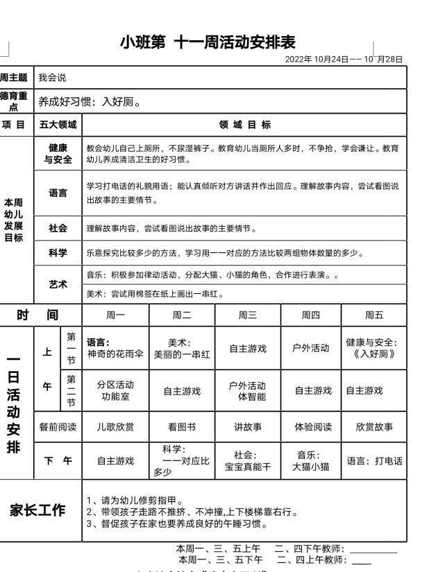 小班第十一周活动安排表
