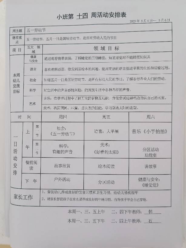 小班春季第十四周活动安排表