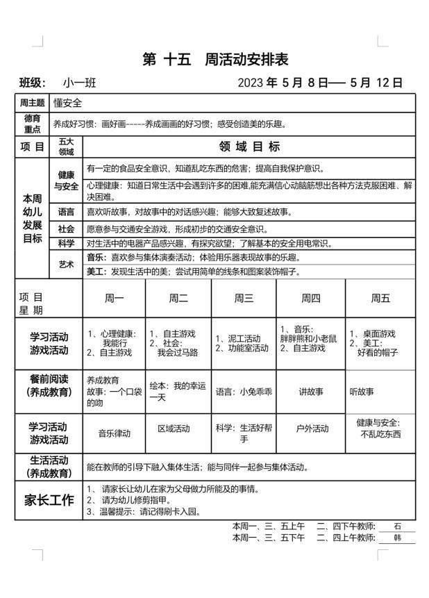 小班春季第十五周活动安排表