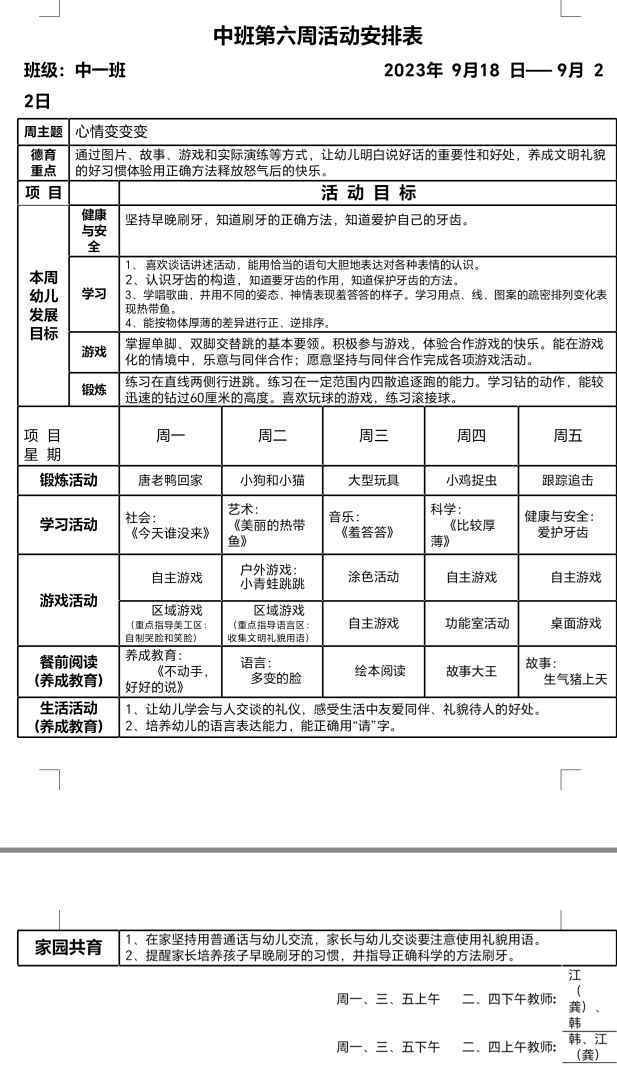 中班秋季第六周活动安排