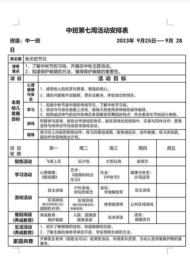 秋季第七周活动安排
