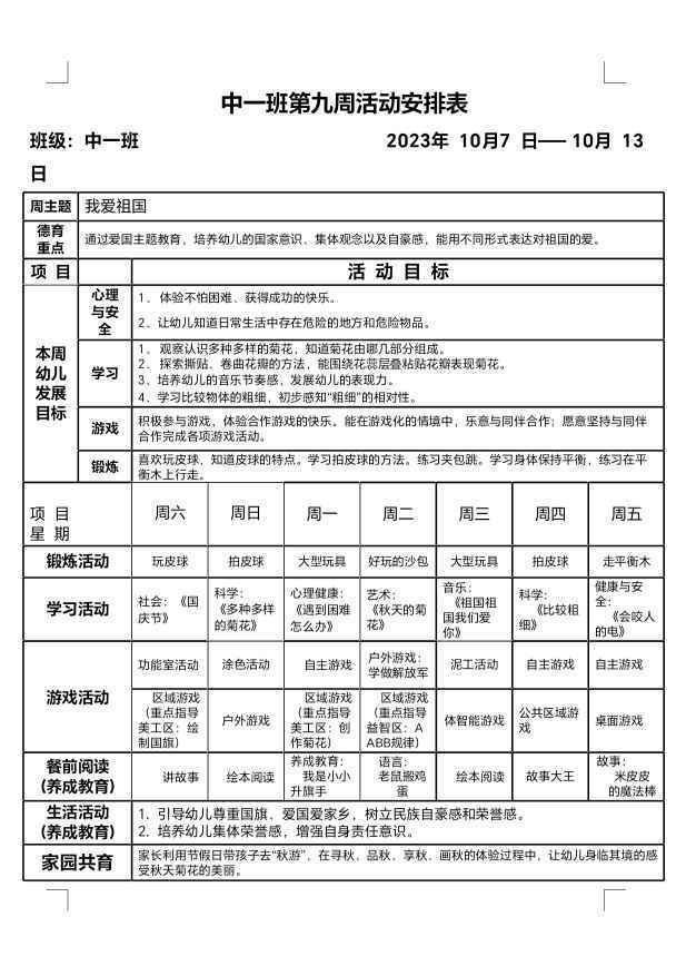 秋季第九周活动安排