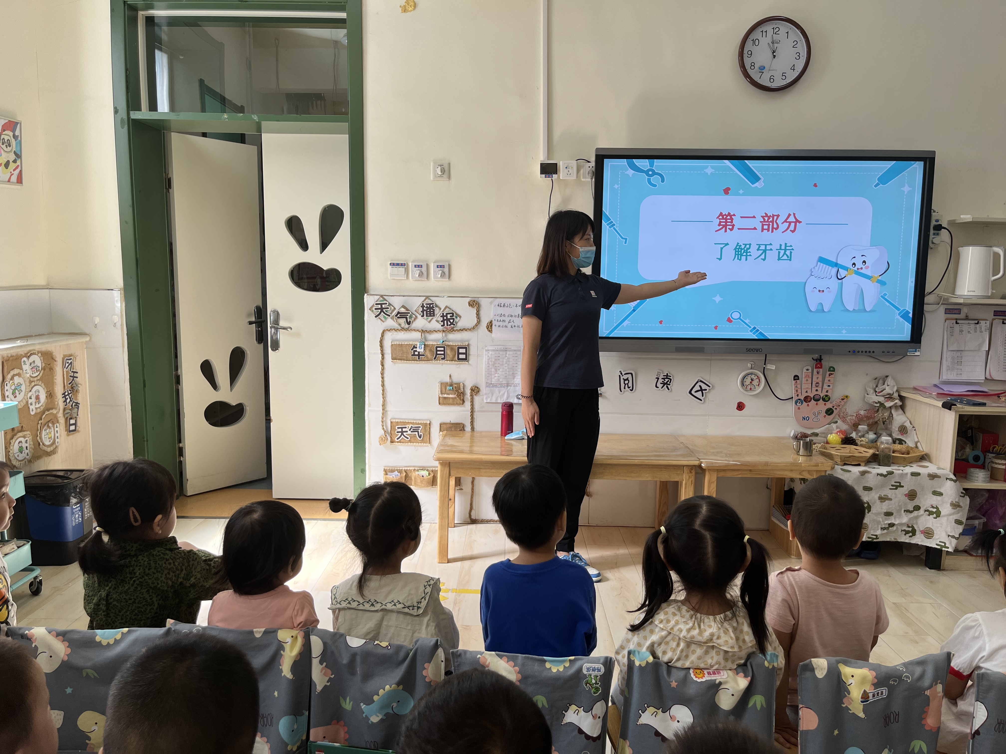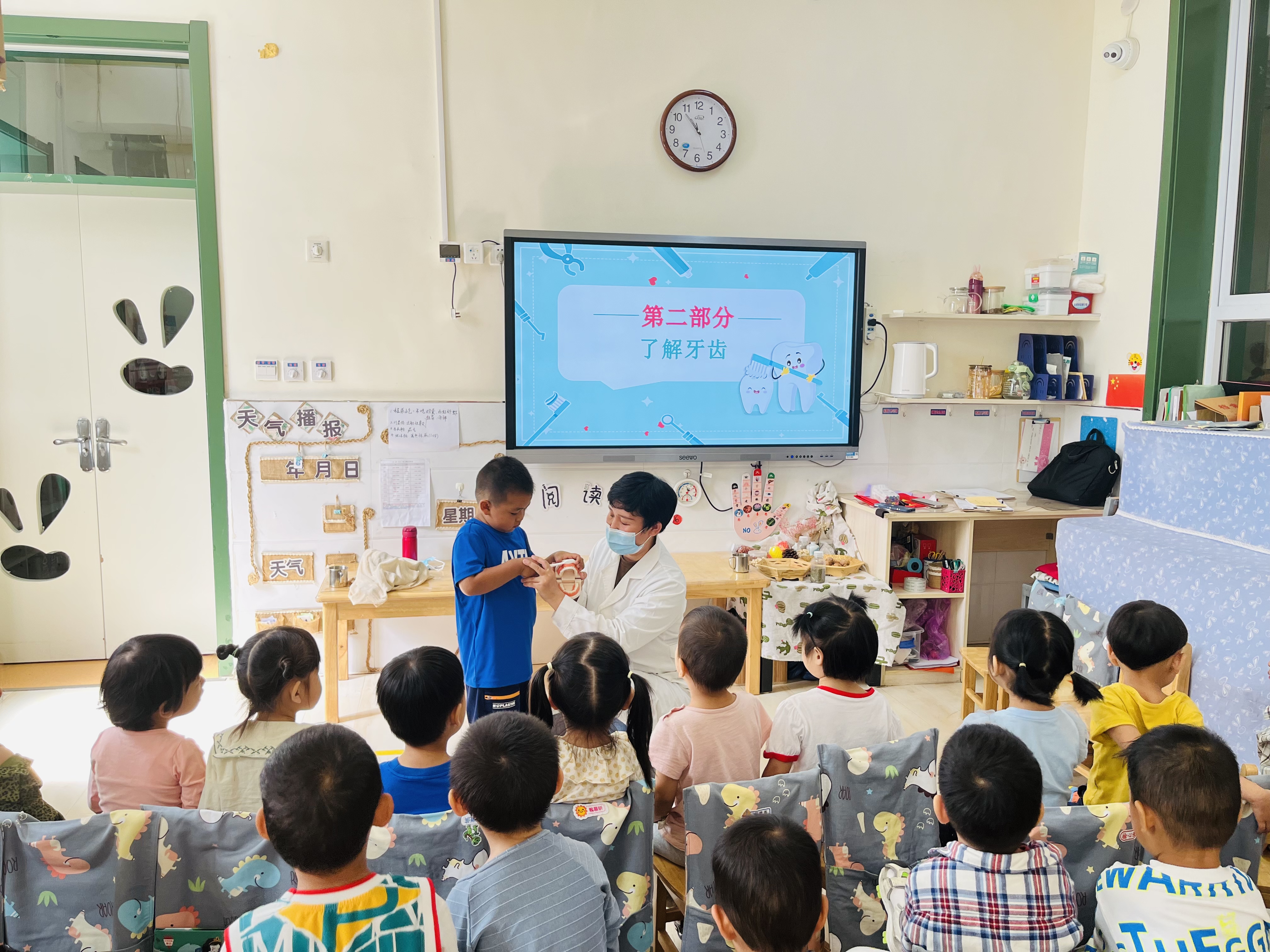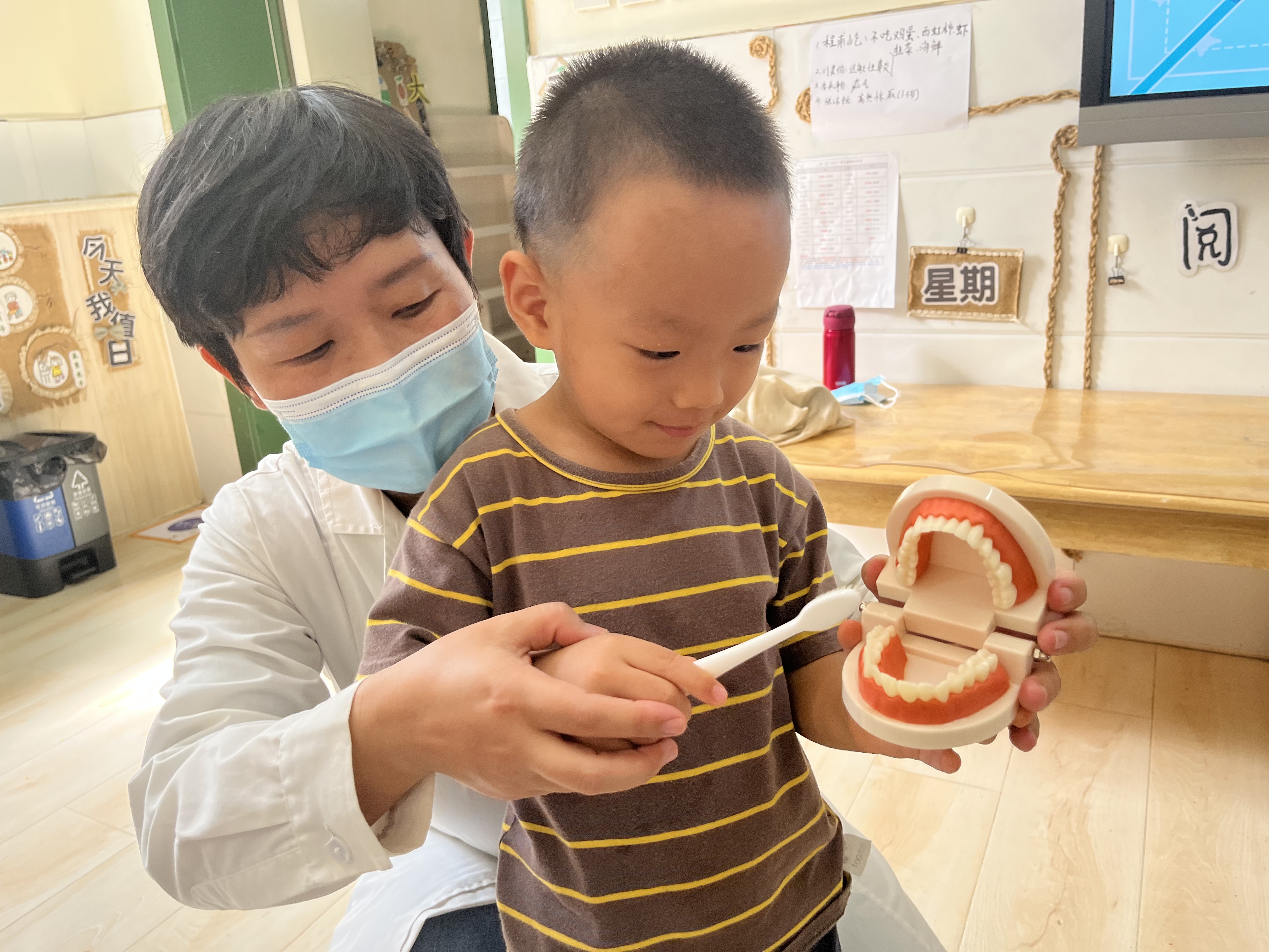 9月20日是“全国爱牙日”,为了让幼儿从小树立牙齿保健的正确意识,养成良好的爱牙护牙习惯,丰富幼儿的爱牙常识,我们进行了爱牙活动。牙齿是我们身上重要的器官之一,好的牙齿不仅美观大方,而且吃东西会很香。现在孩子们一般都爱吃甜食,但又不怎么喜欢刷牙,就会导致一些孩子有了蛀牙,影响牙齿健康,还会伴着疼痛,所以,保护牙齿是我们刻不容缓的任务。那我们的牙齿,我们又该用什么方法去保护牙齿呢? 我们首先和孩子们一起学习了造成牙齿伤害的原因,以及正确保护牙齿的知识,更有幼儿园医务室的温大夫亲临班级教授幼儿刷牙的正确方法,孩子们认真倾听,学习刷牙也很专心。一般来说准确的刷牙方法是先刷前面,再刷后面,在刷上牙的时候由上向下刷,相反在刷下牙的时候就要由下向上来刷,这样才能把牙齿刷的很干净;从刷牙的力度来说不能让过于用力的刷牙,那样会触碰到牙龈的位置,不但不能很好的保护牙齿,还会起到相反的作用;从刷牙的时间来说最好教育孩子每天早上和晚上各刷一次牙,而且在晚上完成刷牙之后就不要再吃东西了,那样对自己的健康是没有好处的。不但会在牙齿的表面留下残留物,使牙齿的颜色变得不好看,更为严重的是还会造成蛀牙的出现。我们还一起学习了刷牙歌: 《刷牙歌》