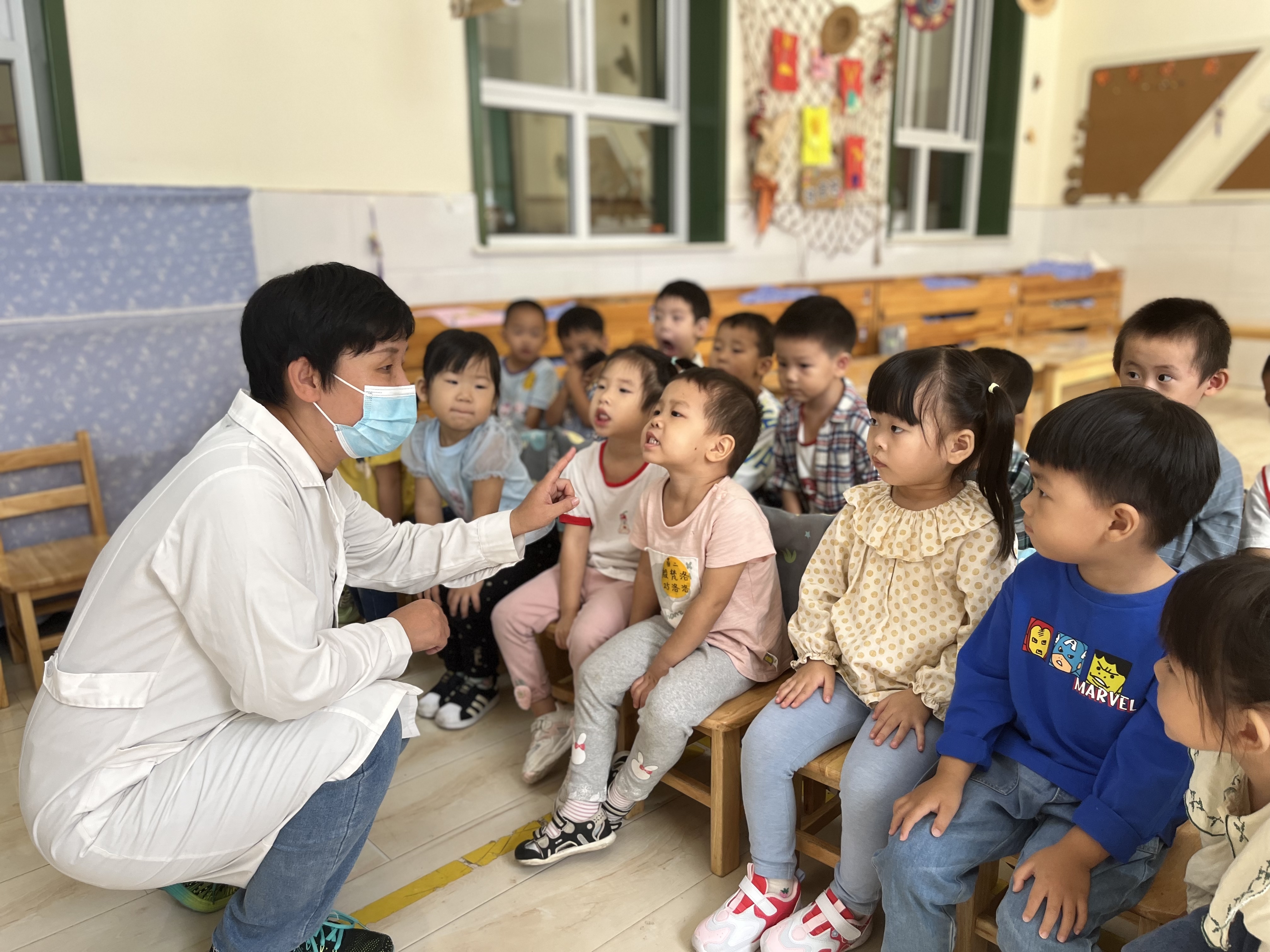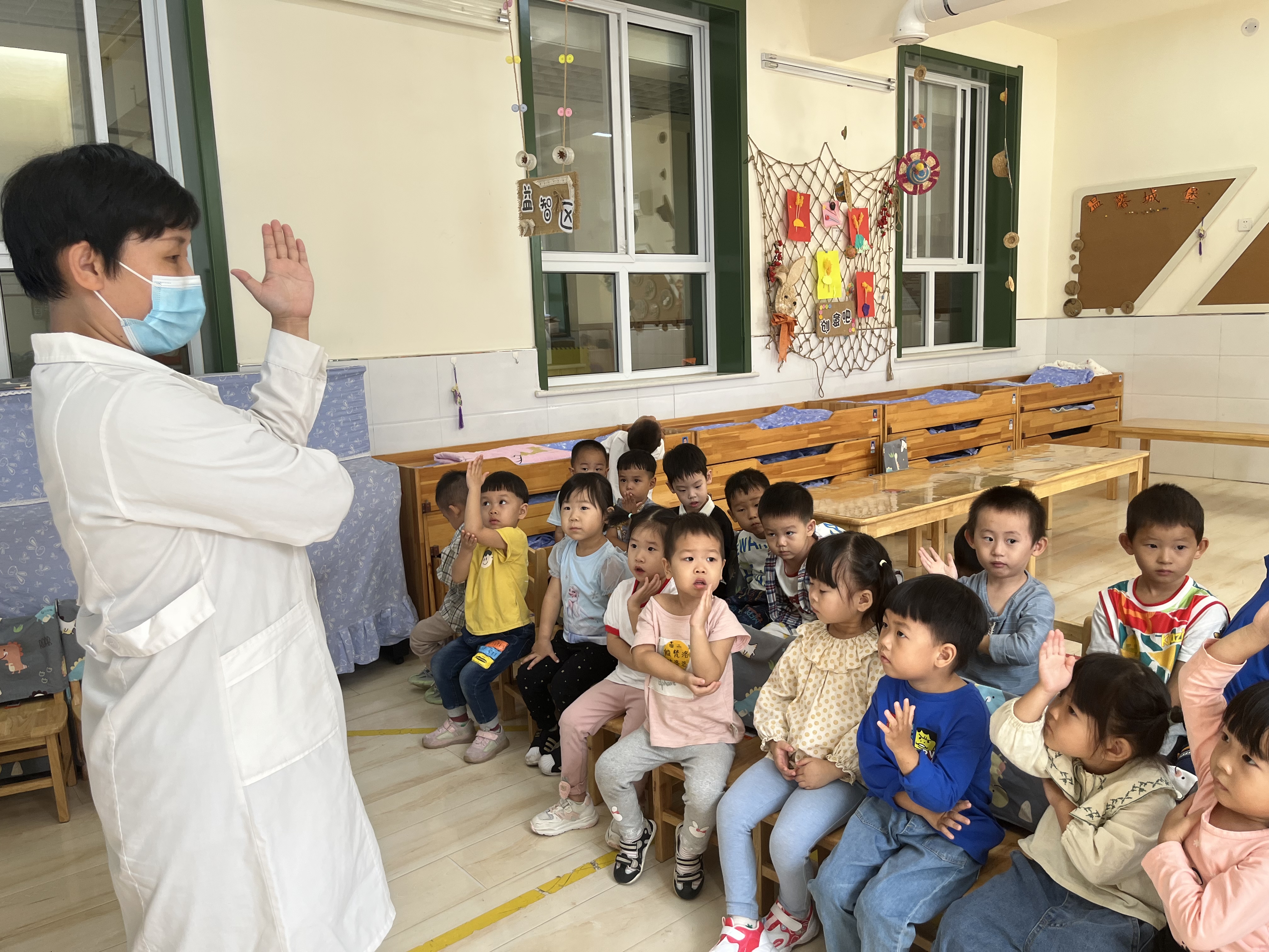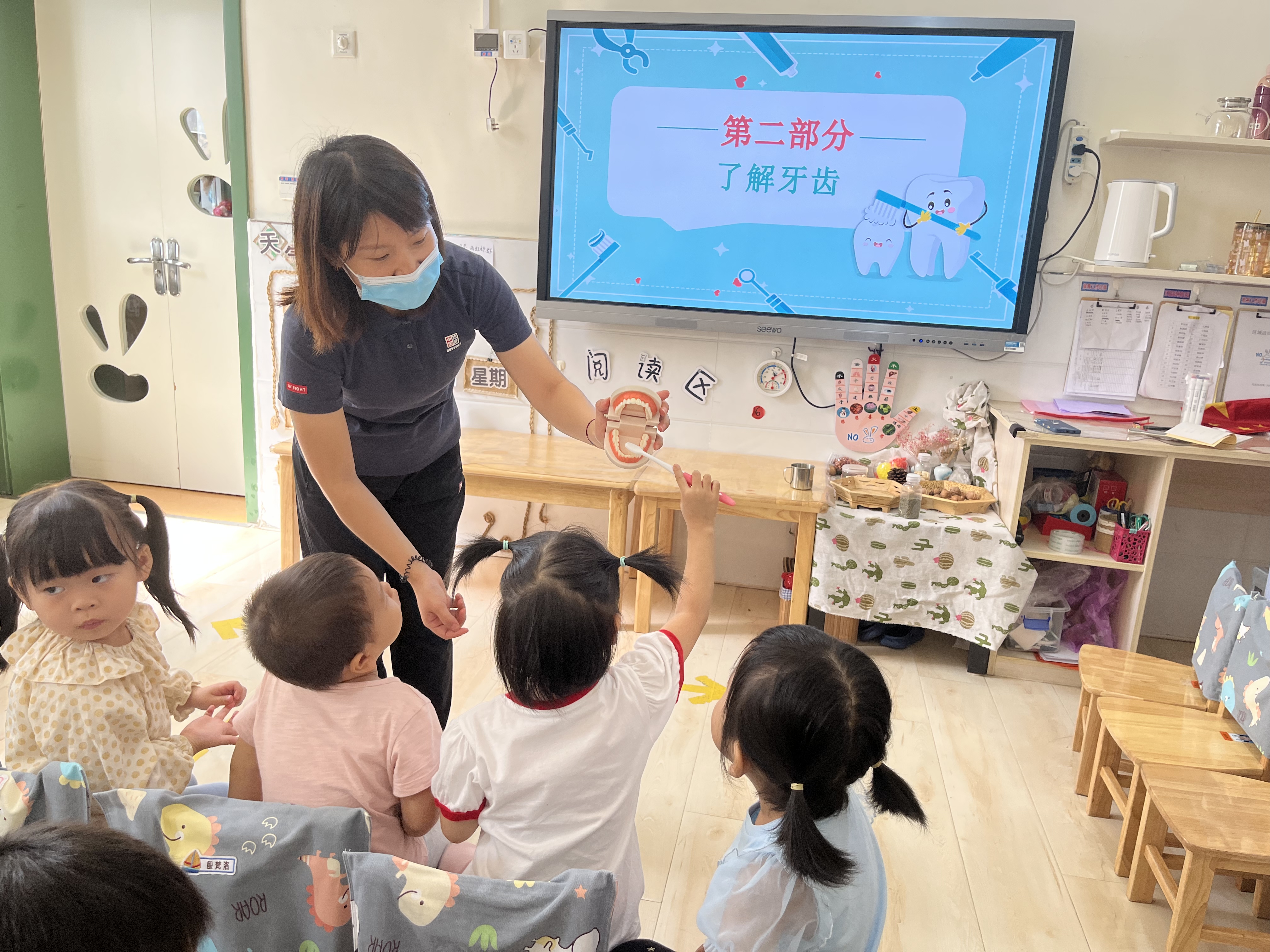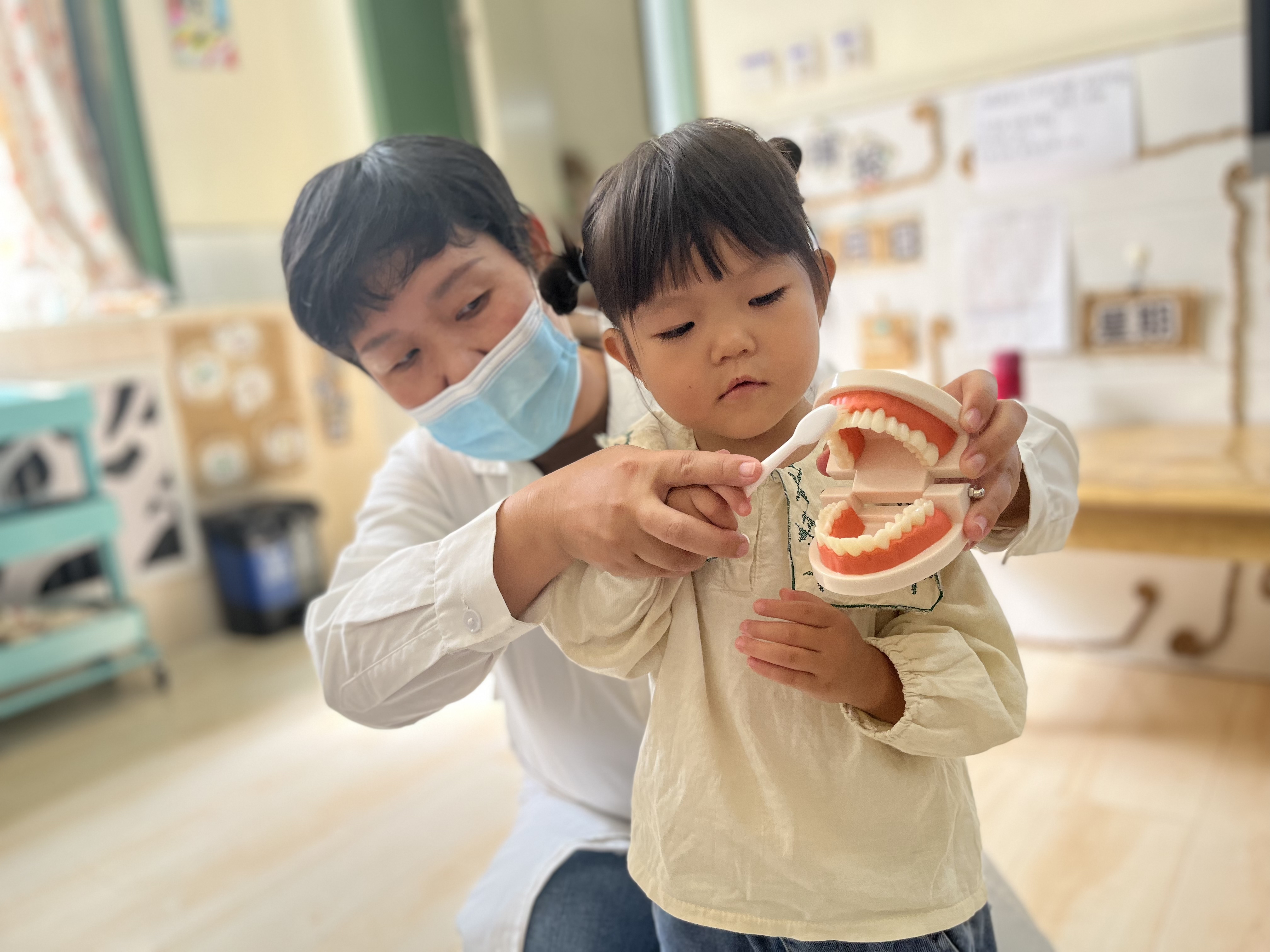9月20日是“全国爱牙日”,为了让幼儿从小树立牙齿保健的正确意识,养成良好的爱牙护牙习惯,丰富幼儿的爱牙常识,我们进行了爱牙活动。牙齿是我们身上重要的器官之一,好的牙齿不仅美观大方,而且吃东西会很香。现在孩子们一般都爱吃甜食,但又不怎么喜欢刷牙,就会导致一些孩子有了蛀牙,影响牙齿健康,还会伴着疼痛,所以,保护牙齿是我们刻不容缓的任务。那我们的牙齿,我们又该用什么方法去保护牙齿呢? 我们首先和孩子们一起学习了造成牙齿伤害的原因,以及正确保护牙齿的知识,更有幼儿园医务室的温大夫亲临班级教授幼儿刷牙的正确方法,孩子们认真倾听,学习刷牙也很专心。一般来说准确的刷牙方法是先刷前面,再刷后面,在刷上牙的时候由上向下刷,相反在刷下牙的时候就要由下向上来刷,这样才能把牙齿刷的很干净;从刷牙的力度来说不能让过于用力的刷牙,那样会触碰到牙龈的位置,不但不能很好的保护牙齿,还会起到相反的作用;从刷牙的时间来说最好教育孩子每天早上和晚上各刷一次牙,而且在晚上完成刷牙之后就不要再吃东西了,那样对自己的健康是没有好处的。不但会在牙齿的表面留下残留物,使牙齿的颜色变得不好看,更为严重的是还会造成蛀牙的出现。我们还一起学习了刷牙歌: 《刷牙歌》