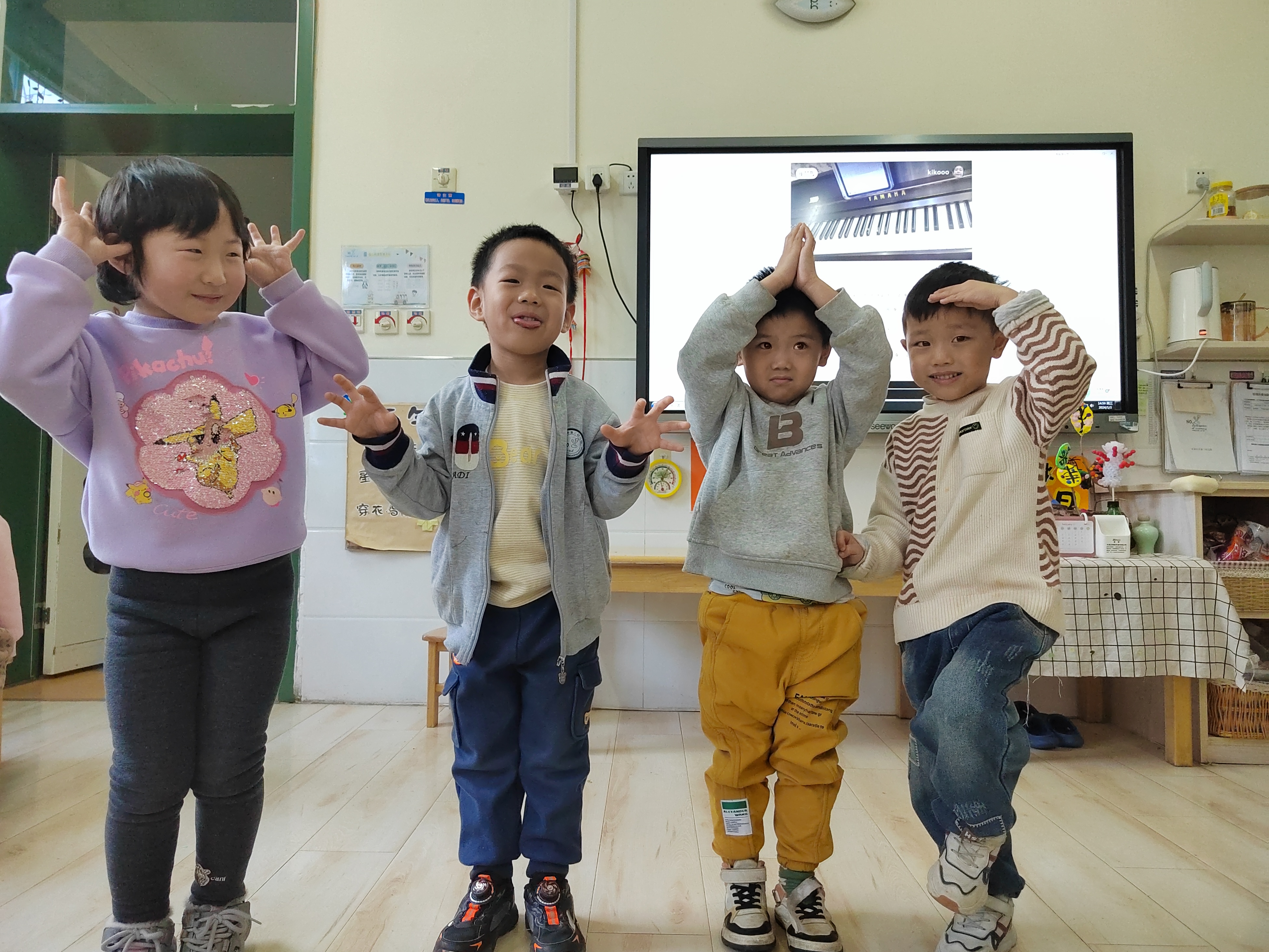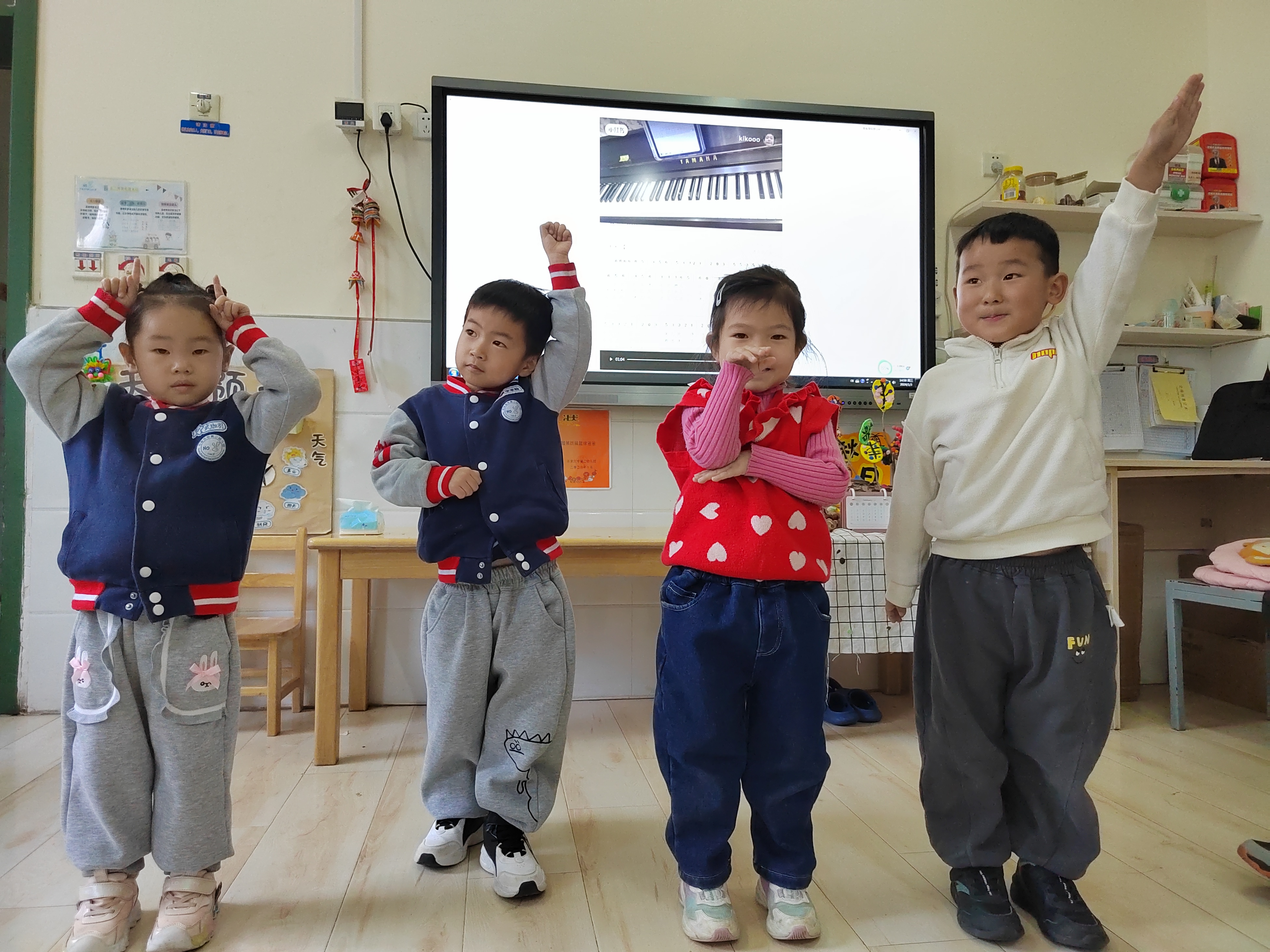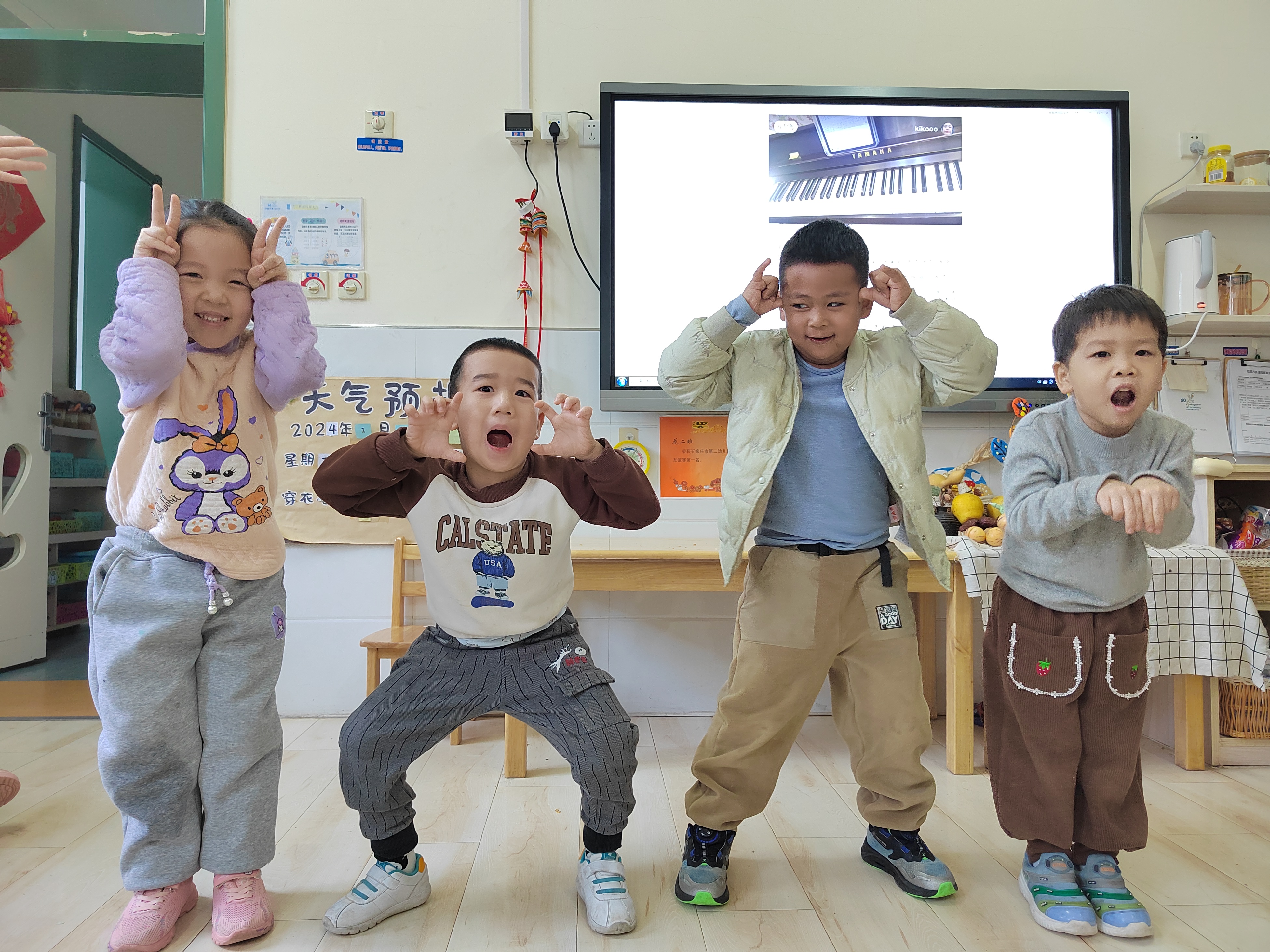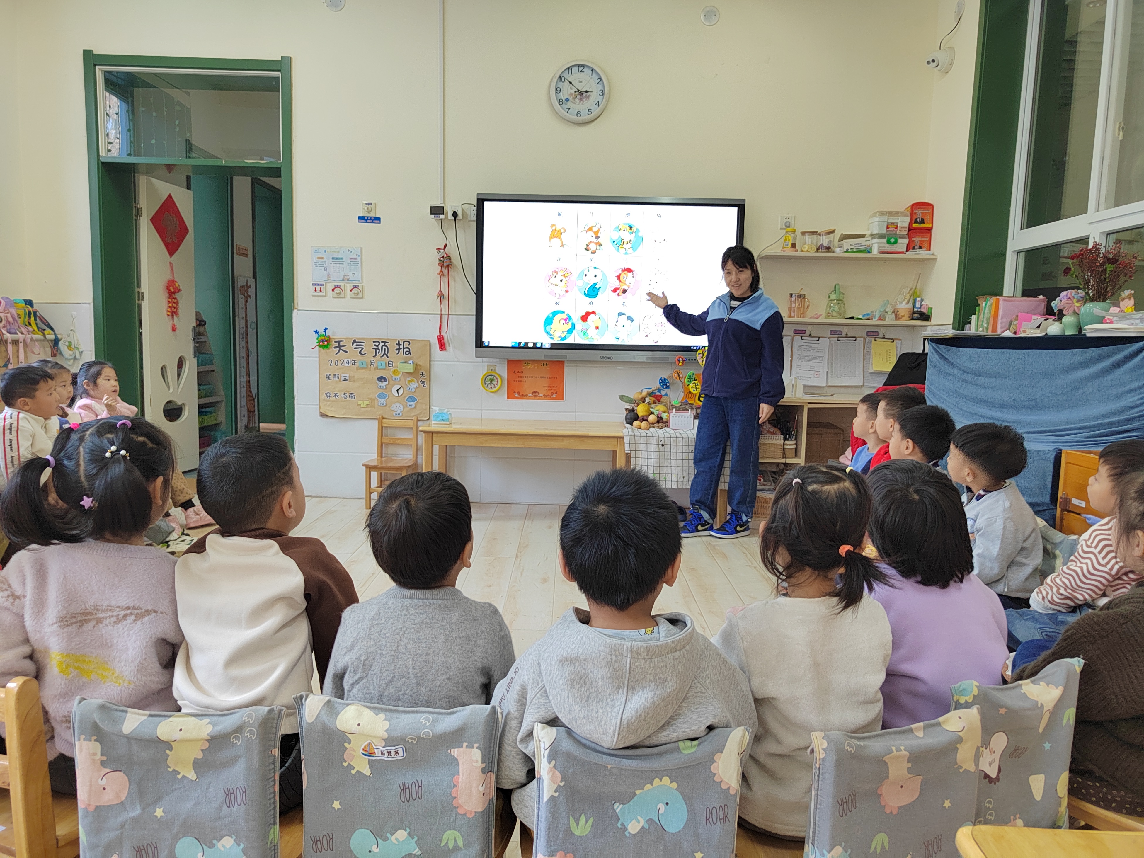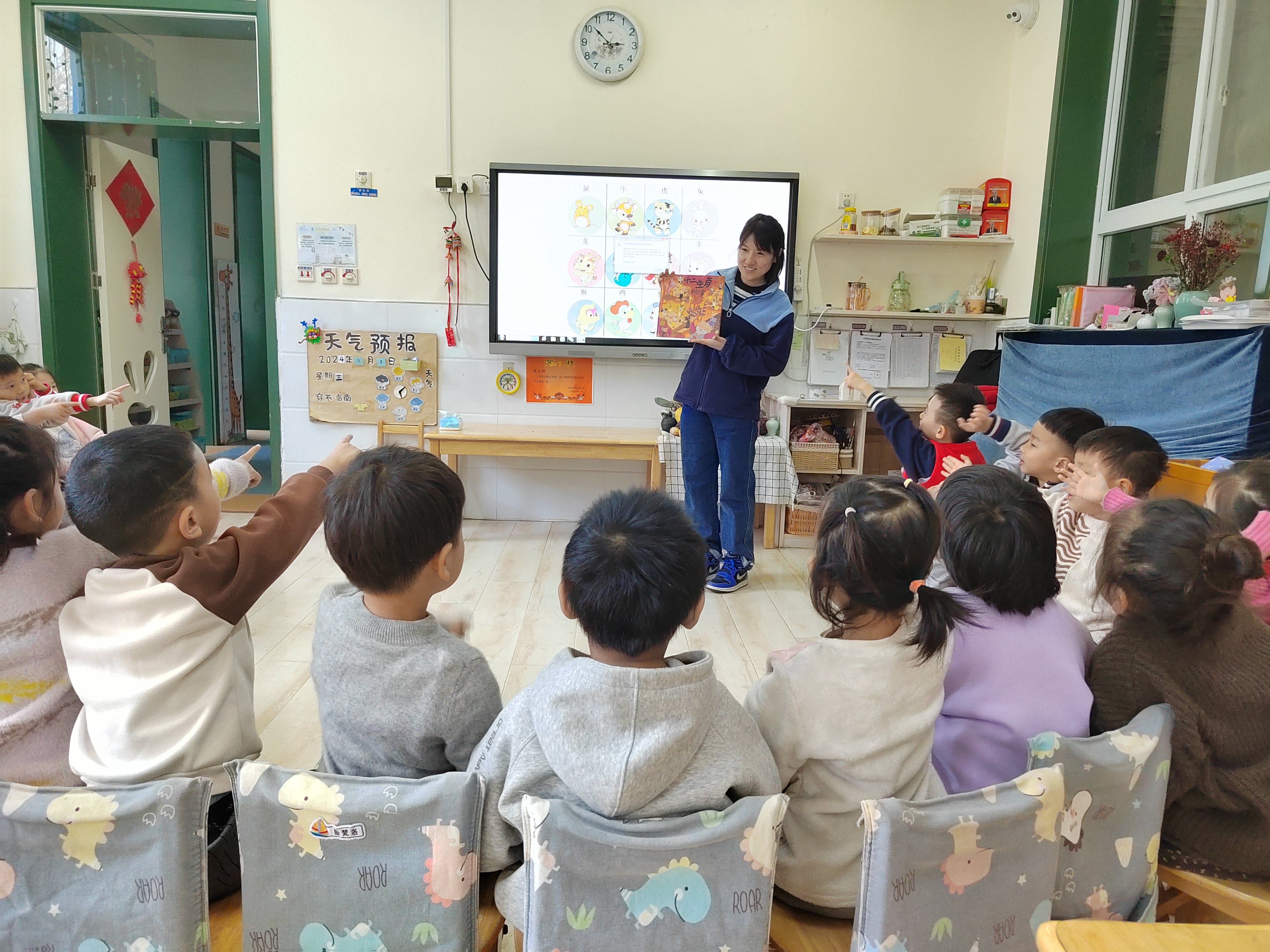《纲要》中指出:社会性的教育是在日常生活中,借助于日常生活,并且为了日常生活而进行的。动物,对于孩子来说,一直都是一个感兴趣的话题,特别是中班的孩子开始对自己的属相(十二生肖)感兴趣了,记得有一次,有几个孩子正在讨论各自的属相,有一个孩子很热情地问我:“老师,你属什么的呀?于是,好几个孩子也都新奇地凑了过来。也有的孩子问我:“老师,十二生肖是怎么来的?十二生肖是怎么排列的?”为了满足幼儿的求知欲望,让孩子对十二生肖有更进一步的了解,班级里组织 小朋友们学习了歌曲《十二生肖》,孩子们学的津津有味。 课程开始之前,老师先组织小朋友们观看图片,学习了十二生肖的顺序,之后又通过老师分享的故事《十二生肖》,了解了十二生肖的来历,知道这是中华民族的传统习俗。随后,老师弹钢琴,大家一起有节奏的唱了起来。“小老鼠,打头来,牛把蹄儿抬,老虎回头一声吼,兔儿跳得快,兔儿跳得快。”欢快的旋律,朗朗上口的歌词,小朋友们唱的不亦乐乎。“小老鼠的嘴巴十这样的,小兔子的耳朵是竖起来的,大老虎很厉害,能发出吼叫声”,跟随着孩子们的描述,他们纷纷模仿起了歌词里的动作,音乐课可真开心啊! 十二生肖是中国传统民俗,马上就要过春节了,在之后的班级活动中,我们还要在其他领域渗透相关常识,让孩子们在欢快的氛围中感受民俗。