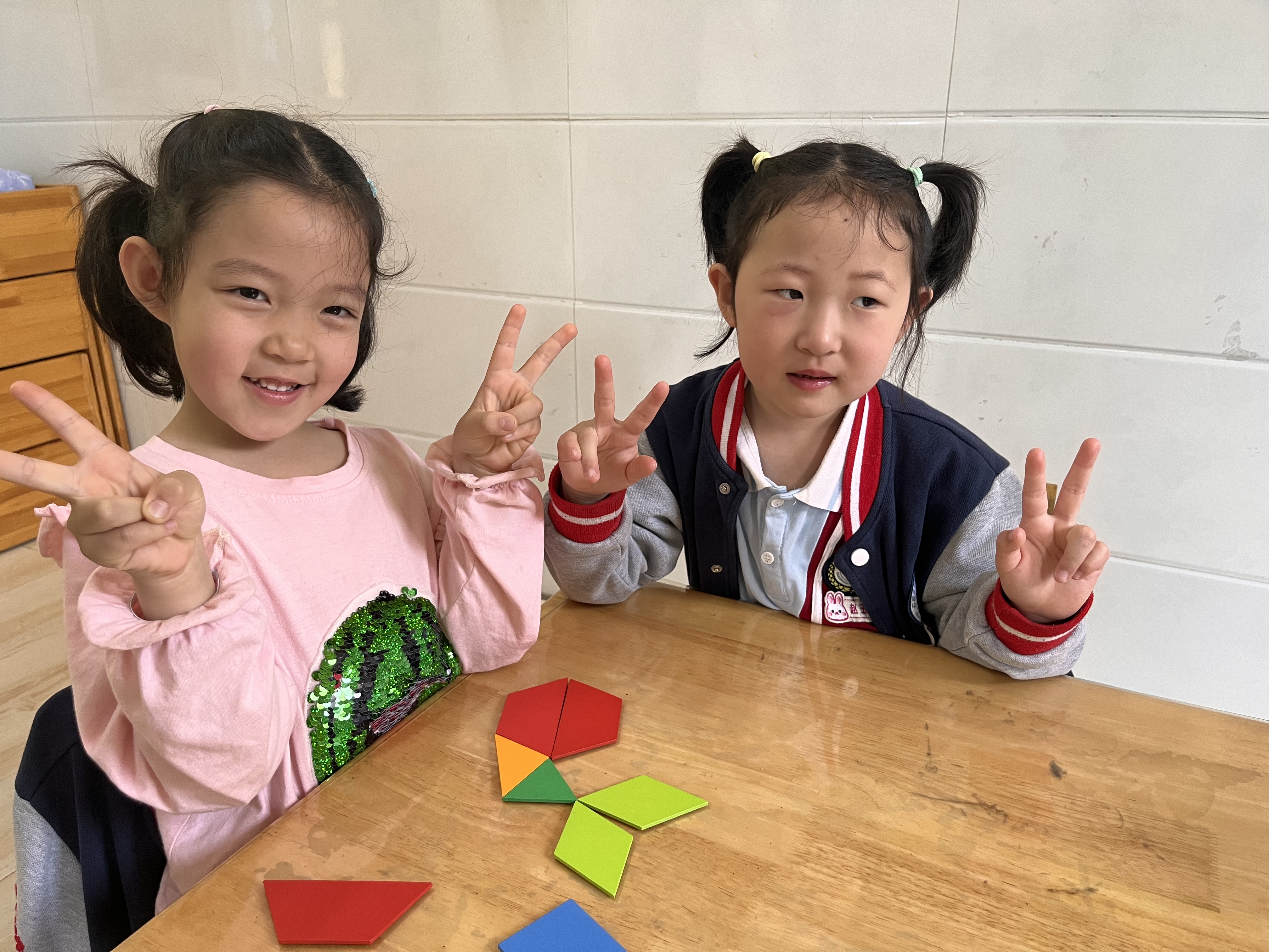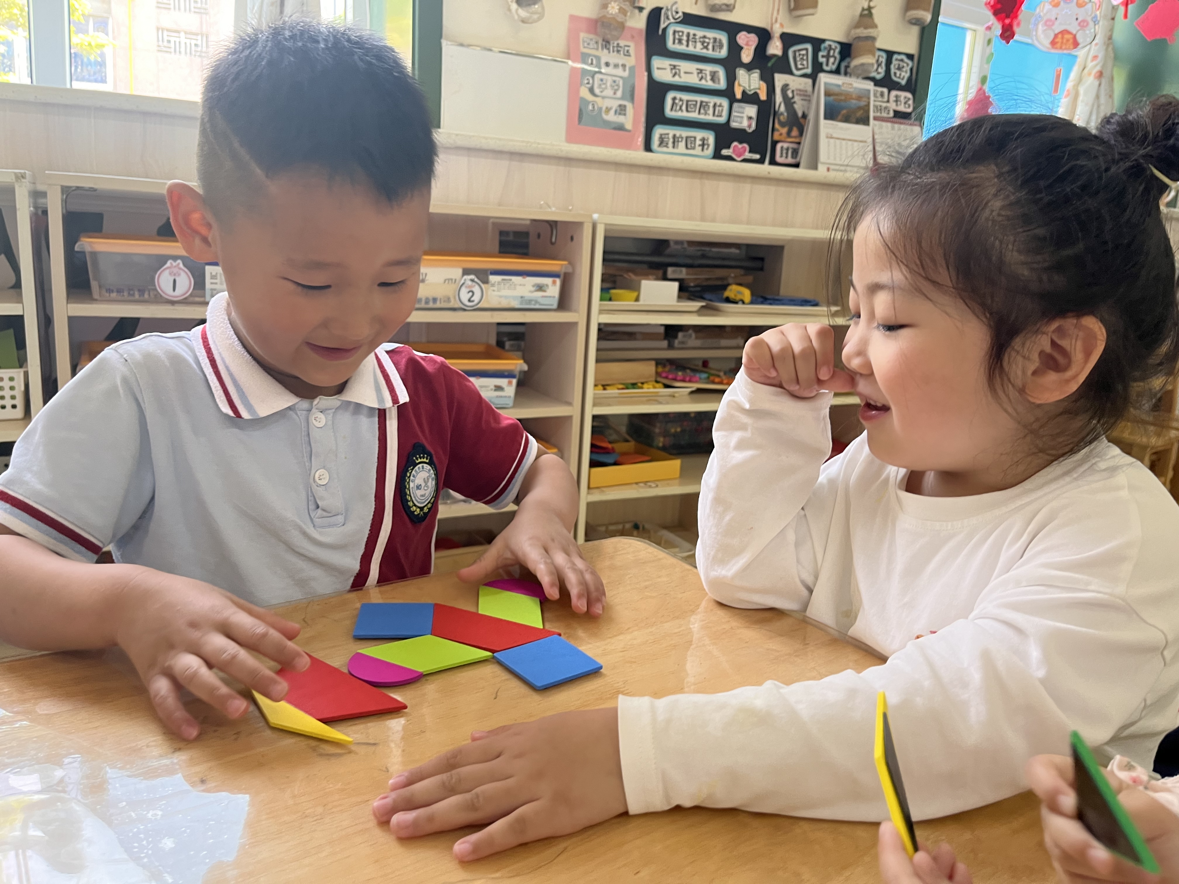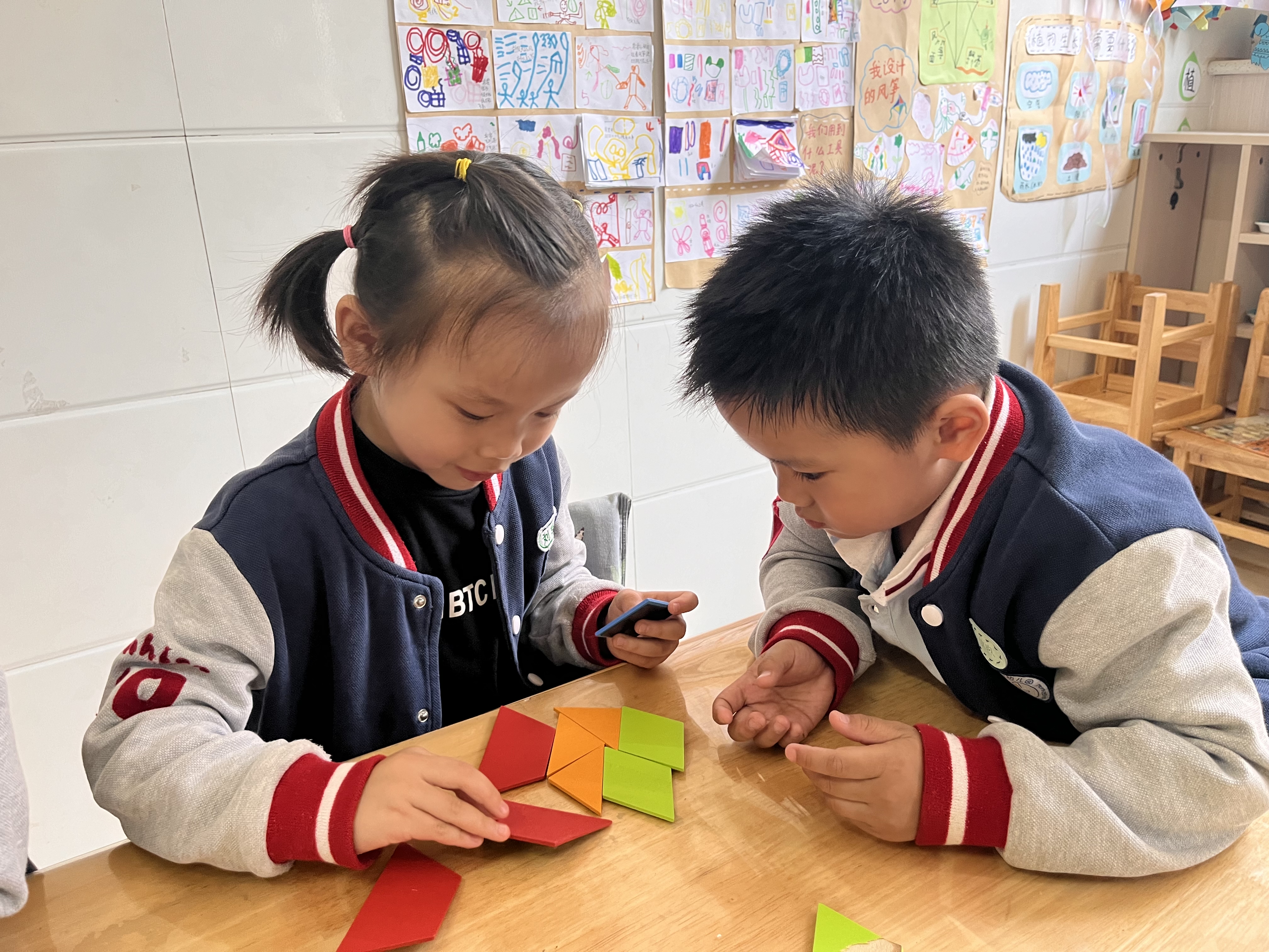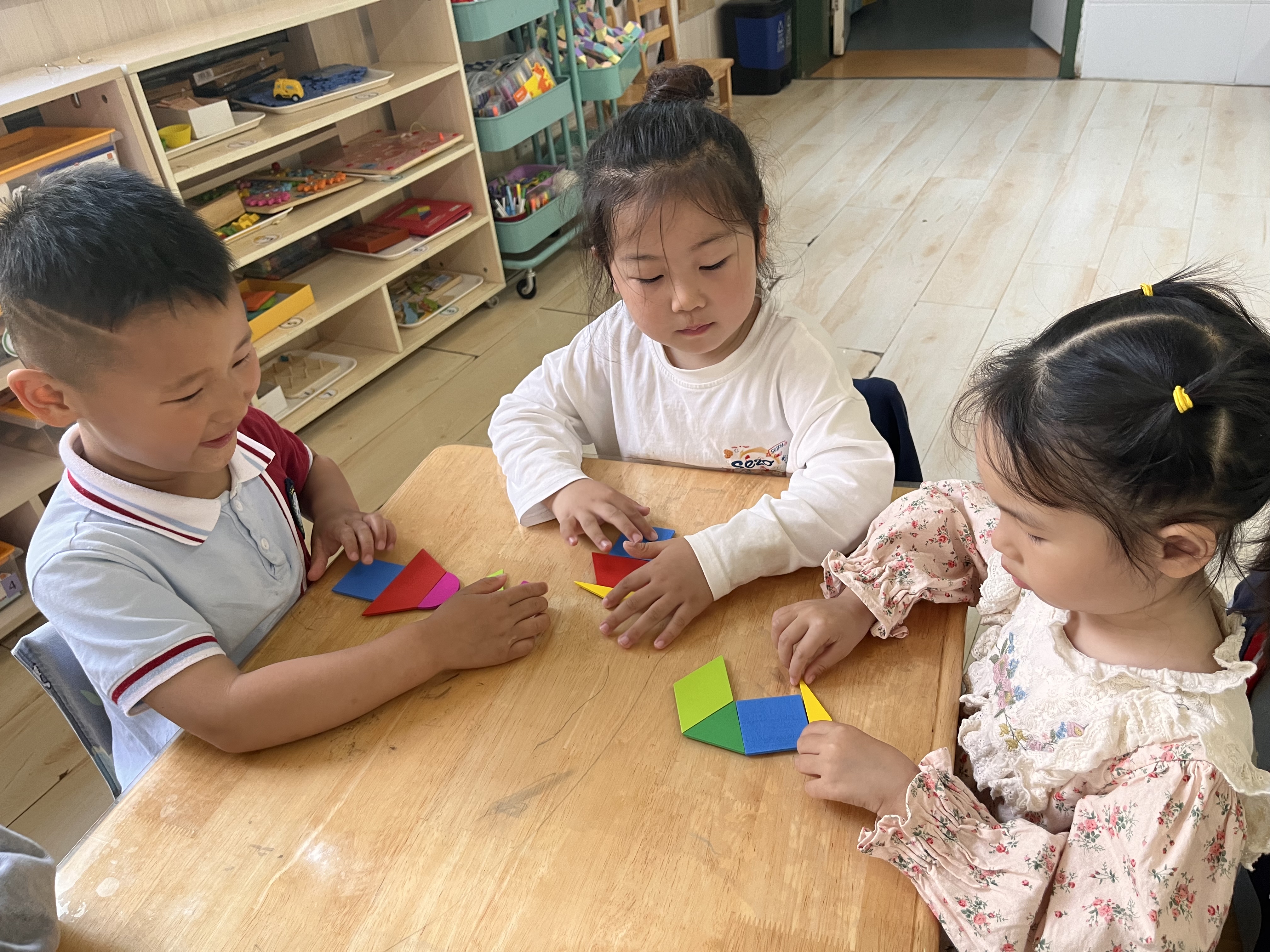 在这个色彩斑斓的世界里,图形是构成万物的基本元素。今天,我们的小探险家们踏入了一场别开生面的几何图形探索之旅,用他们的小手和无限的想象力,在数学的活动中的课解锁了组合图形的魔法! 神奇的几何拼板,创意的起点。想象一下,如果半圆形、正方形、三角形这些基础的几何形状能够自由组合,会碰撞出怎样的火花?在老师的引导下,孩子们面前摆放着五彩缤纷的几何拼板,每个拼板都承载着变魔术的秘密。他们的眼睛里闪烁着好奇与兴奋,仿佛即将踏上一场去往未知世界的旅行。 通过观察来发现图形的秘密。首先,我们从“观察”开始。老师展示了几何图形组合的实例,比如半圆形加上一个长方形可以变成一座小房子,几个三角形拼在一起能成为一艘帆船。孩子们围坐一圈,小手指着、眼睛跟着图形转,他们在发现中学习,理解了每个图形的特性和它们组合的可能性。 动手实践拼出新世界。接下来,到了最激动人心的动手环节!小朋友们挑选自己喜爱的颜色和形状,开始尝试不同的组合方式。有的孩子拼出了小鱼、有的则创造了一棵大树(多个三角形堆叠成树冠,下面是一个长方形作为树干)。在这个过程中,孩子们不仅锻炼了手眼协调能力,更激发了他们的创新思维和空间感知力。 通过这次活动,孩子们不仅学会了如何观察和识别不同的几何图形,更重要的是,他们体验到了创造的乐趣。每一次拼接,都是对想象力的一次释放;每一个组合图形,都是独一无二的艺术品。这样的学习方式,让知识不再是枯燥的文字和符号,而是变成了生动可触的快乐体验。让我们期待孩子们在接下来的学习旅程中,探索更多几何图形的奥秘吧!