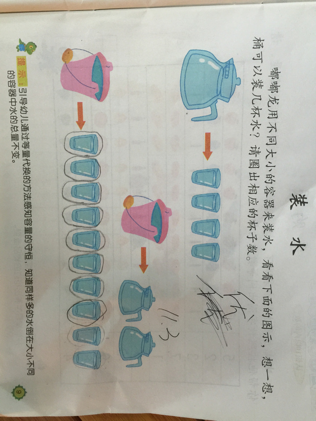 请家长根据课本上的要求,准备三样容器其中一个是大小、高矮、粗细都一样的水杯,让孩子去验证第三幅图要几个杯子,感受容量守恒的原理。发视频在时光树上,孩子能在视频中讲一讲最好。
