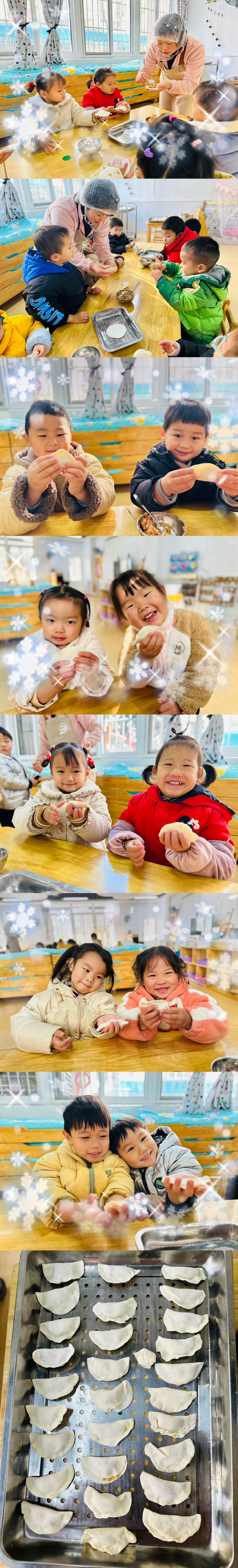 活动中孩子们了解到,冬至这一天是全年中白天最短、夜间最长的一天,是冬天真正来临的日子。从冬至这天开始,白天一天天变长,夜晚一天天变短。老师将鲜肉和白菜,调好馅料,准备了充足的面皮。