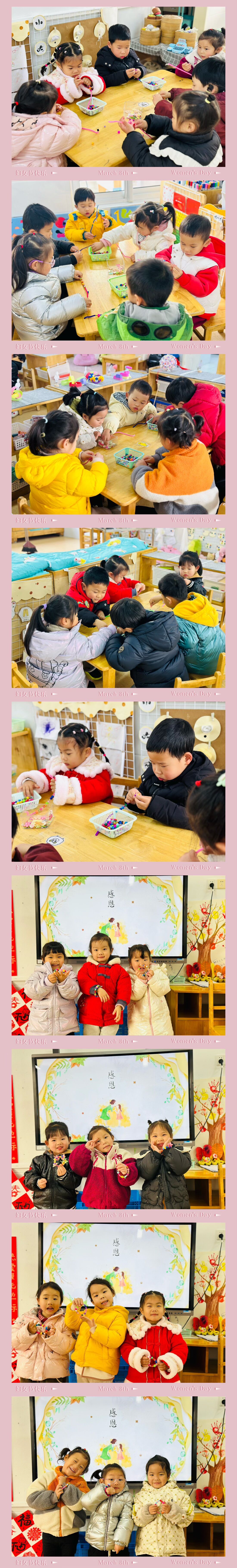 今天是三八妇女节,通过看绘本的方式让幼儿了解这是一个充满爱和温情的节日,孩子们用自己灵巧的小手制作一串精美的手链表达浓浓的爱意,在孩子们的心灵里播下爱的种子,祝愿所有女性同胞节日快乐!