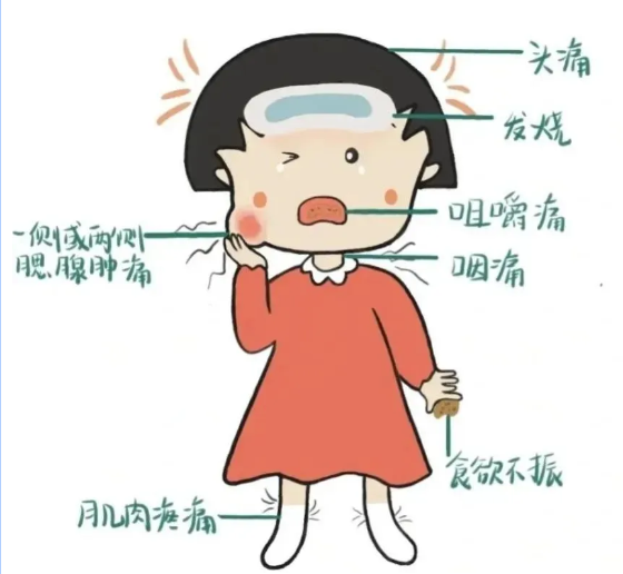 大多数起病较急,有发热、畏寒、头痛、咽痛等全身不适症状。患者一侧或双侧耳下腮腺肿大、疼痛,咀嚼时更痛。