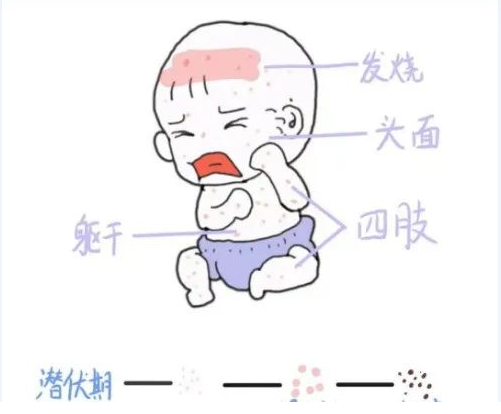 感染后表现为皮肤、黏膜上分批出现斑疹、丘疹、疱疹和结痂、发热、瘙痒。