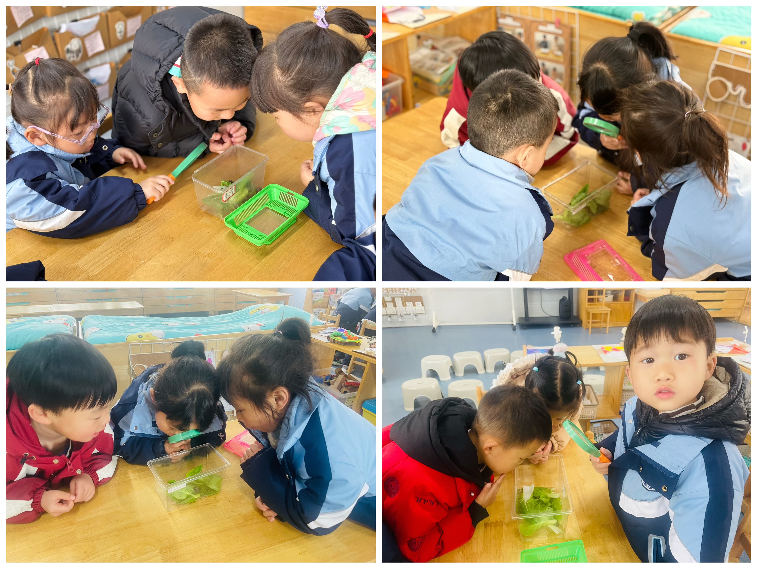 通过集体活动观看科普视频、小组观察饲养盒中的蜗牛,小朋友们知道了蜗牛的身体由壳、头部、颈部、外壳膜、脚、内脏等组成。它们背负着各种形状和大小不一的螺旋壳,蜗牛分泌的粘液来自于它们的腹足,主要起到润滑作用,帮助蜗牛爬行,并保护腹足免受与地面摩擦所带来的伤害。蜗牛的眼睛位于触角上,有两个小黑点,被称为视触角。蜗牛还是世界上牙齿最多的动物,约有25600颗牙齿……