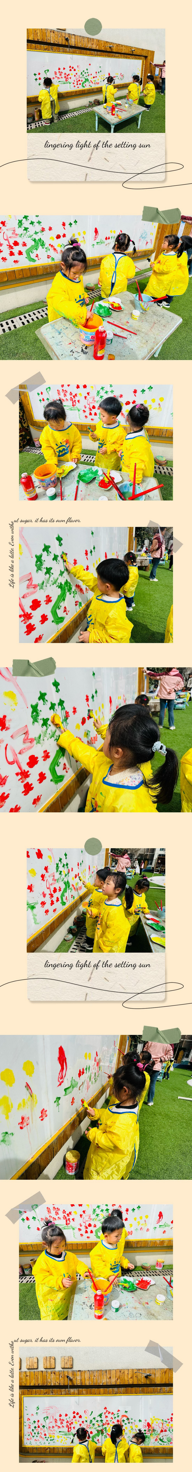 户外涂鸦游戏是孩子们非常喜欢的活动,这样自由自在的涂鸦活动满足了孩子们喜欢涂涂画画的需求,给孩子们提供了一个无拘无束、天马行空、释放天性的机会,用自己喜欢的方式去涂鸦,是对幼儿创造力与想象力的激发,快来看小二班宝贝们眼中的春天吧!
