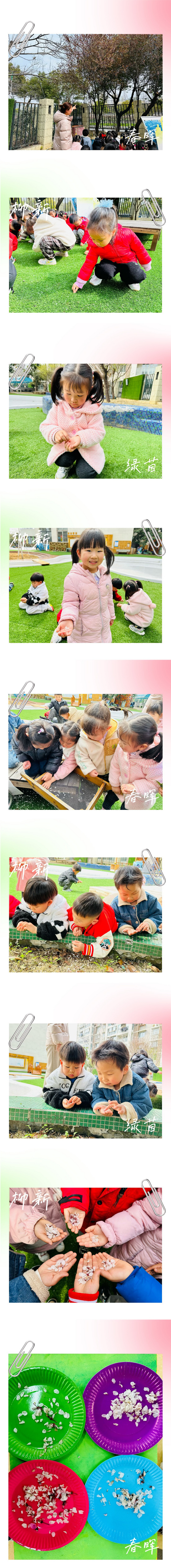 春光明媚、万物复苏,大地一片生机勃勃的景象,春风忙着播撒绿色。不经意间,春天已经遍布到每一个角落,看小二班的宝贝们在幼儿园里寻找、发现、观察身边各种春天的信号。春风一吹,幼儿园里的紫叶李花瓣飘落下来,孩子们发出欢呼声:“好美啊,我们一起捡花瓣吧!”