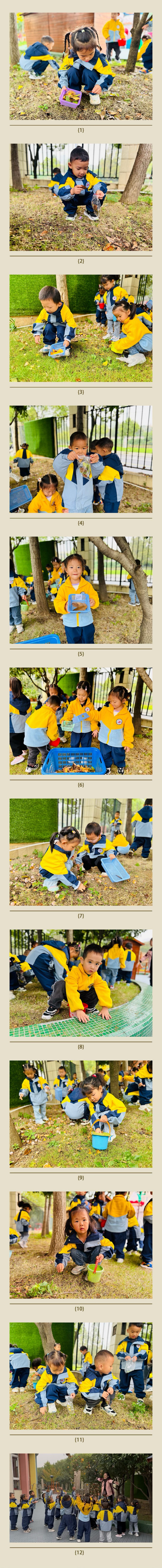 秋天来了,黄色的落叶翩翩飞舞,展现给我们一幕幕美丽的景象。为了引导孩子们进一步感受秋天的美,我们带小朋友们一起来到幼儿园户外,利用各种捡拾工具如袋子、小桶、小筐等来到操场一起在树下捡拾各种落叶。