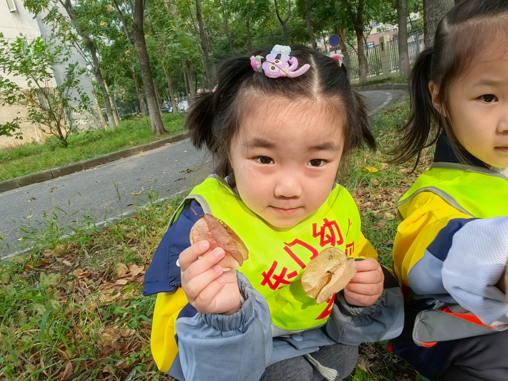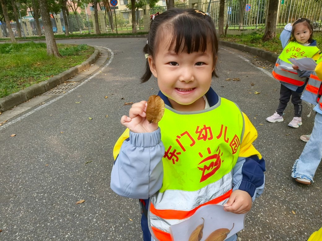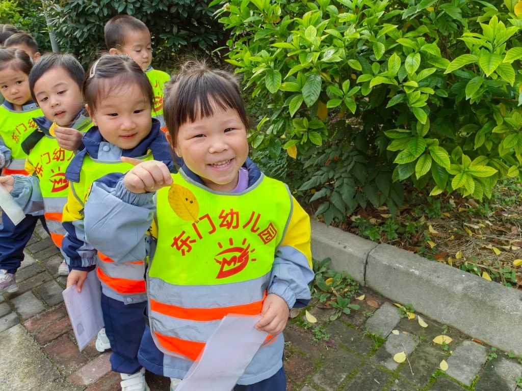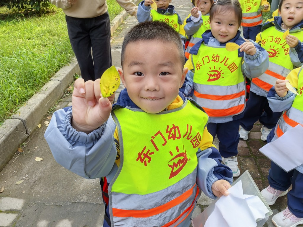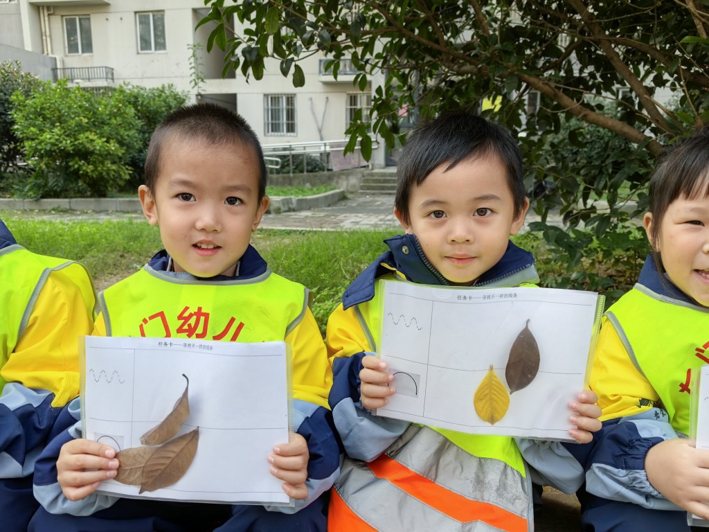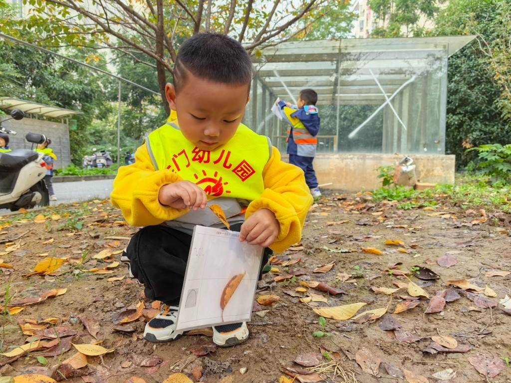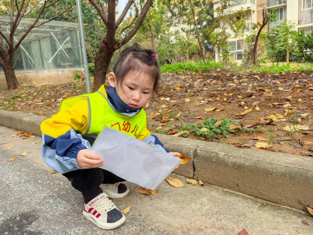 每片树叶都是大自然的馈赠。老师带着孩子们一起捡树叶,近距离观察、探索、感受。在寻叶的过程,他们通过看一看、闻一闻、摸一摸来感知树叶的颜色与形状,体验周围自然环境的变化,用心去感受大自然的美妙与神奇。