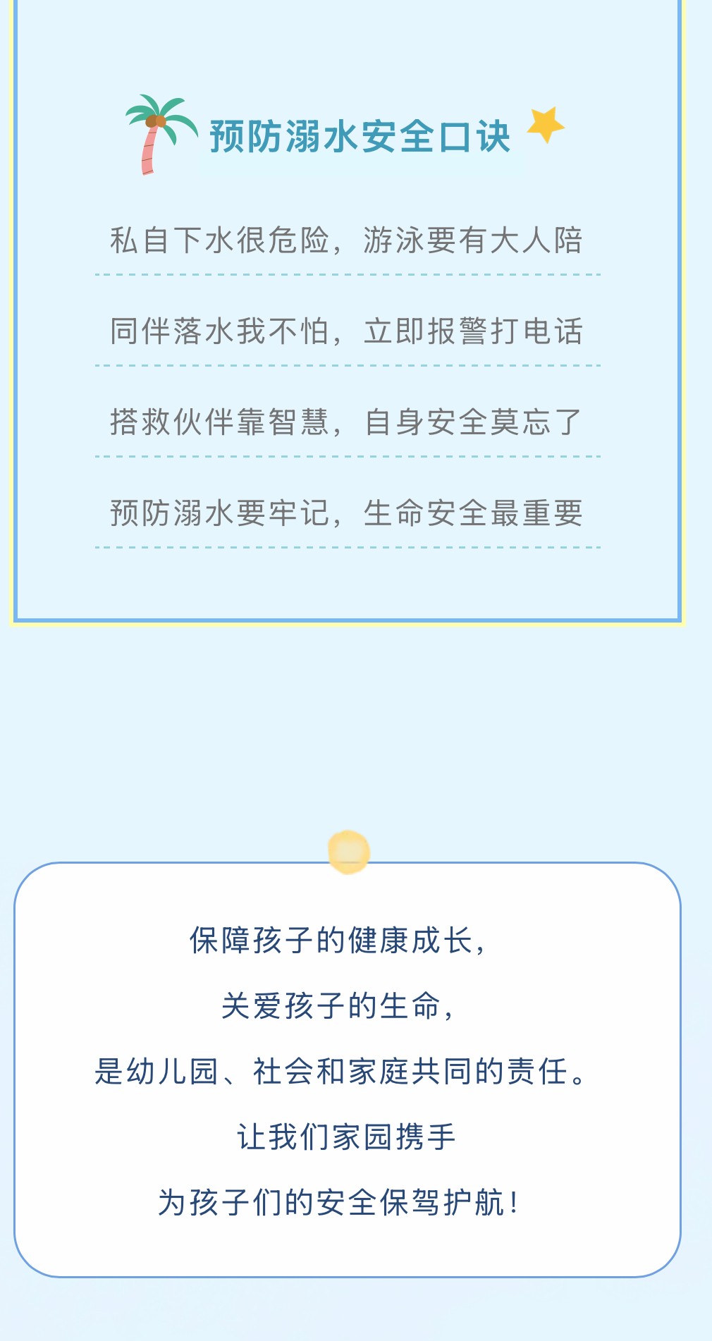 您好!暑假期间,气温升高,溺水事故又将进入高发期!防溺水安全工作已成为幼儿园和家长关注的重点!为切实加强幼儿安全教育,防止溺水事故发生,东门幼儿园温馨提示:希望广大家长时刻加强对孩子防溺水安全教育和监管,提高孩子防溺水的自觉性和识别险情、紧急避险、遇险逃生的能力,共同保障幼儿人身安全。