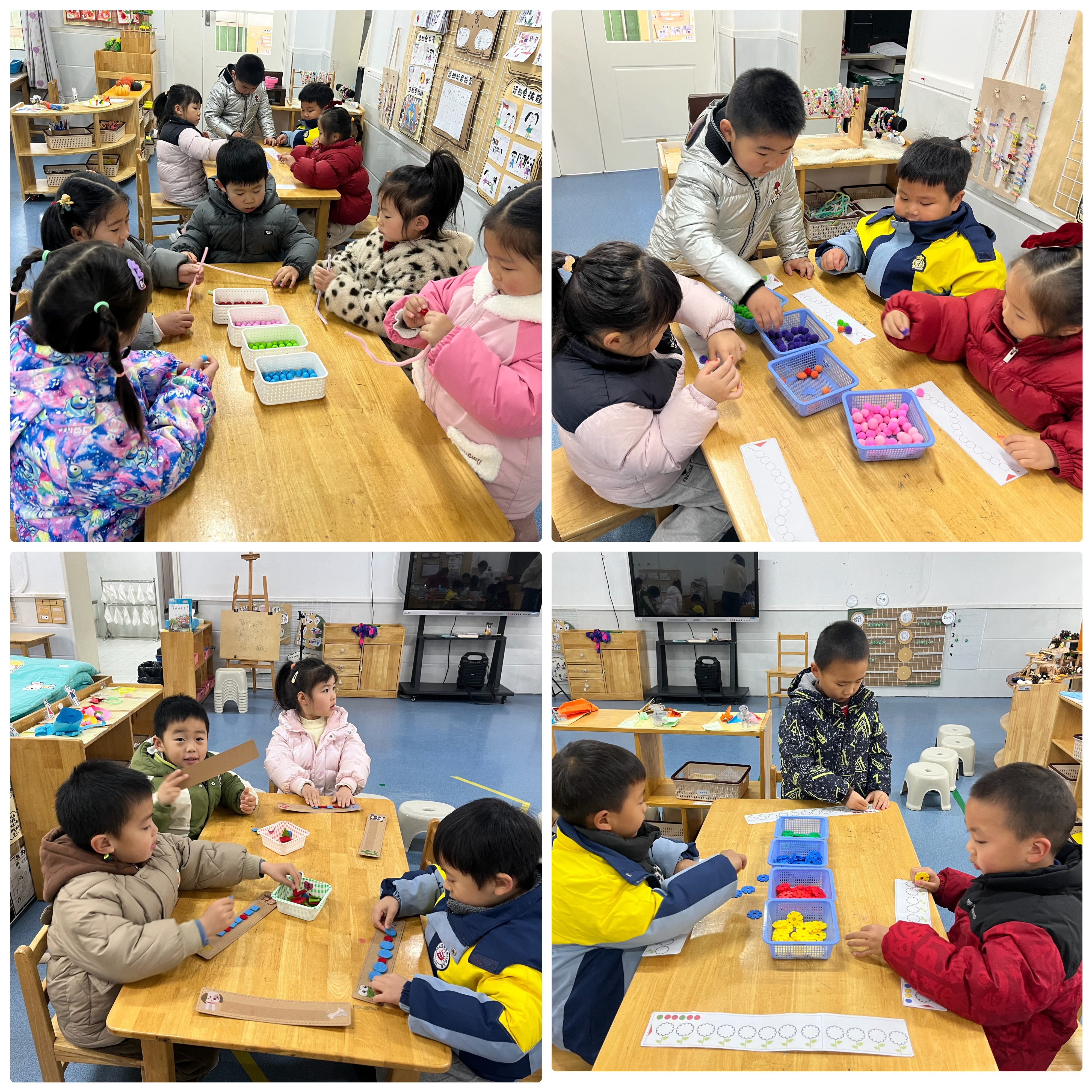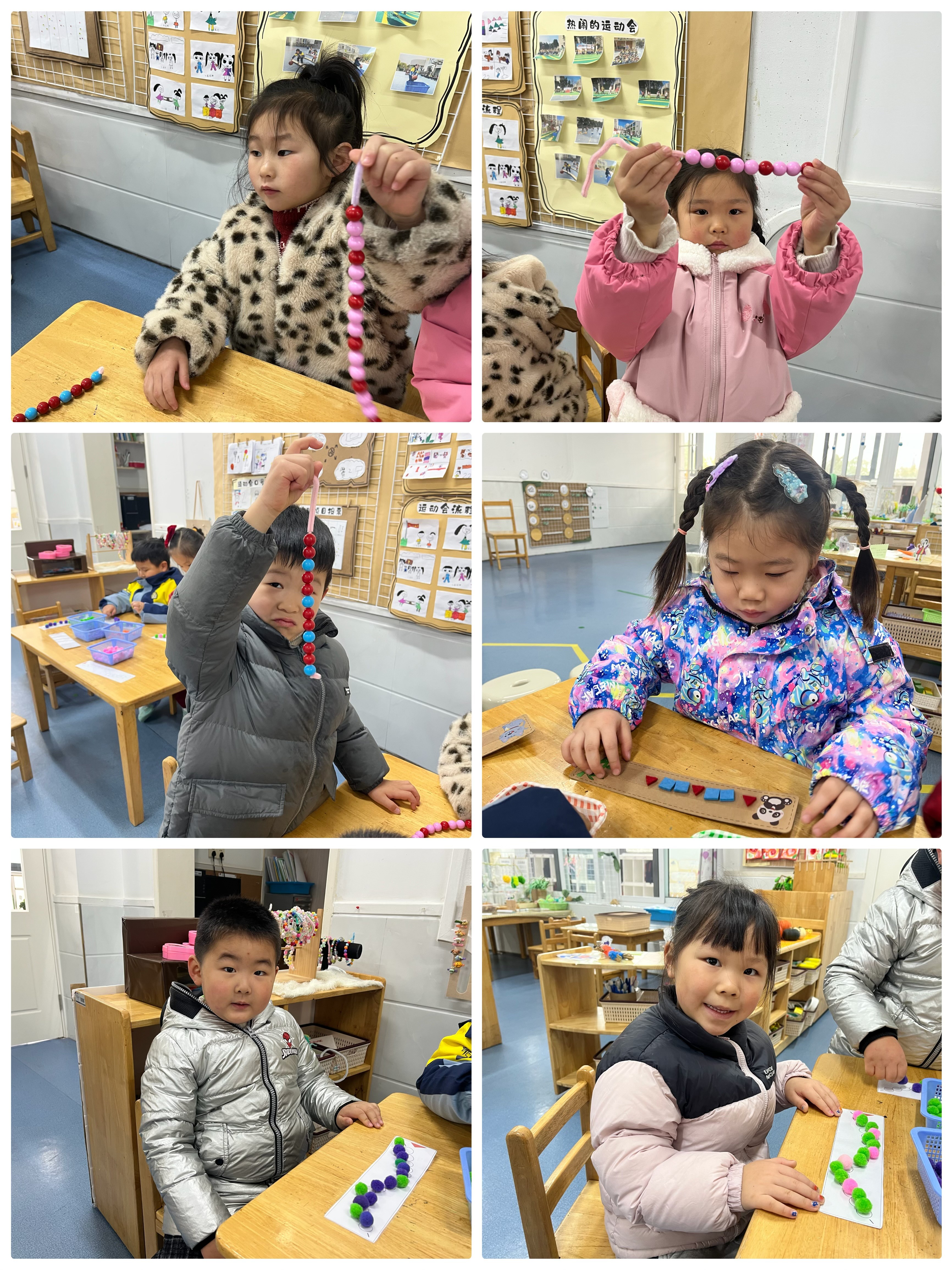 瞧孩子们学会了利用ABB模式排出漂亮的小栅栏,还利用模式穿出一条漂亮的手链呢!