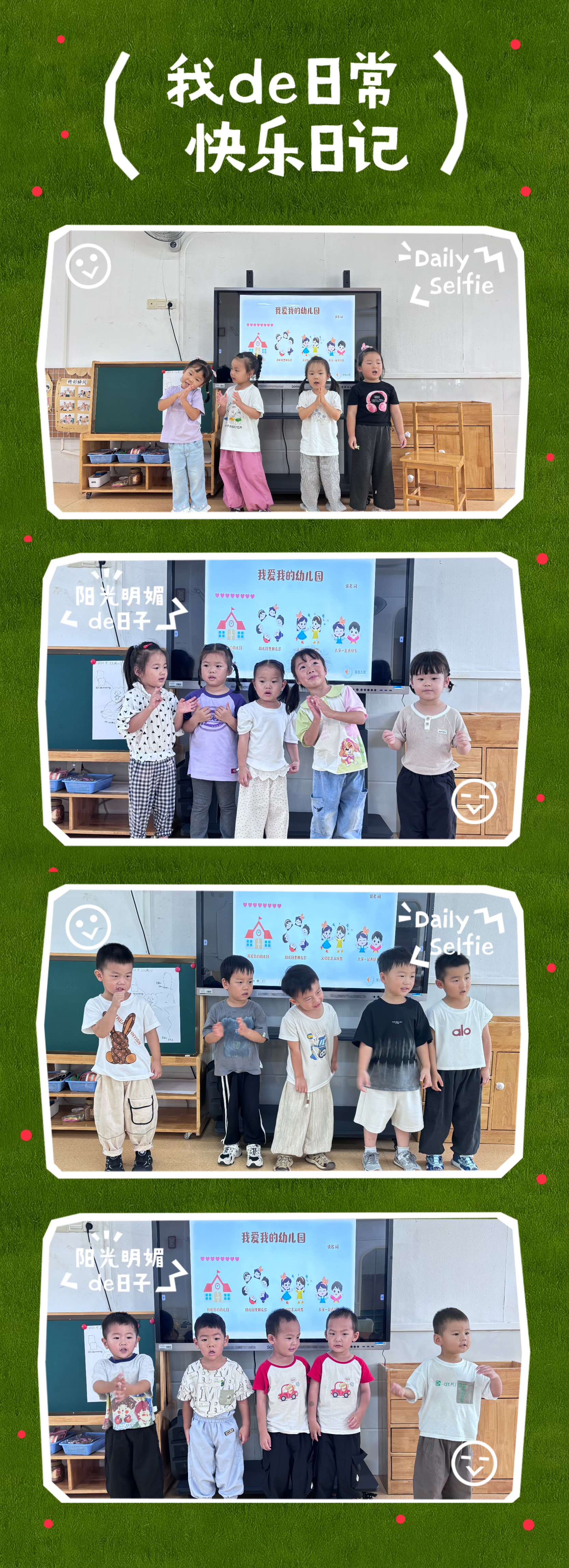 “我爱我的幼儿园,幼儿园里朋友多。又唱歌来又跳舞,大家一起真快乐。”《我爱我的幼儿园》这首歌歌曲节奏活泼明快,四二拍的旋律简单优美,同时通过简单的歌词和旋律告诉宝贝们上幼儿园的快乐。学一学歌曲,做一做简单的身体动作,会让幼儿发现上幼儿园是一件开心、幸福的事情呢!